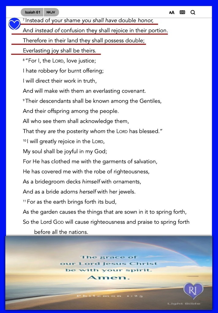 Isa 61:7 For your shame ye shall have double; and for confusion they shall rejoice in their portion: therefore in their land they shall possess the double: everlasting joy shall be unto them.
