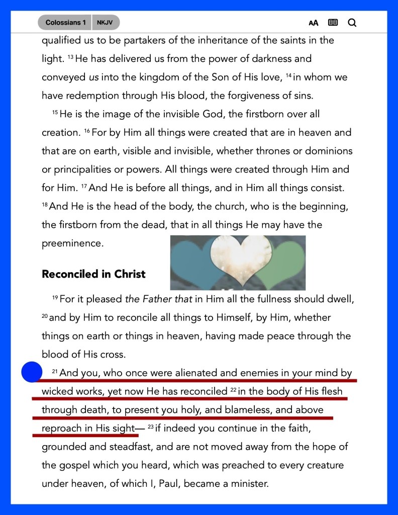 “And you, who once were alienated and enemies in your mind by wicked works, yet now He has reconciled in the body of His flesh through death, to present you holy, and blameless, and above reproach in His sight—” Colossians 1:21-22 ““Again I say to you that if two of you agree on earth concerning anything that they ask, it will be done for them by My Father in Heaven.” Matthew 18:19 “Let the words of my mouth and the meditation of my heart Be acceptable in Your sight, O Lord, my strength and my Redeemer.” Psalms 19:14