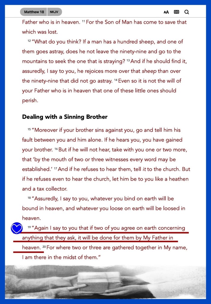 Mat 18:19 Again I say unto you, That if two of you shall agree on earth as touching any thing that they shall ask, it shall be done for them of my Father which is in heaven.