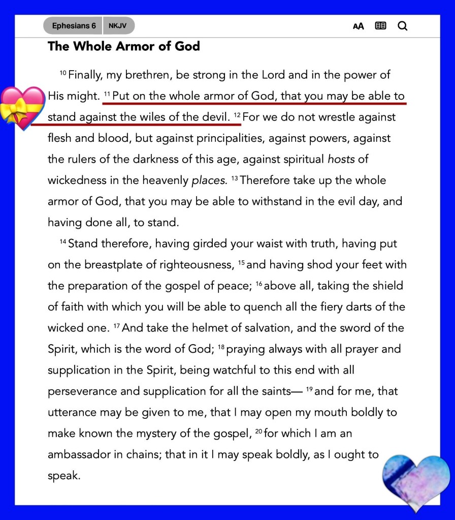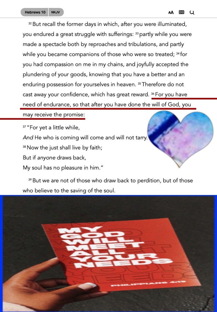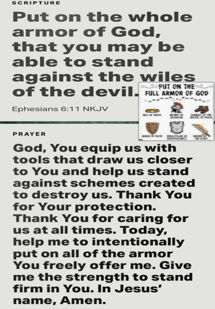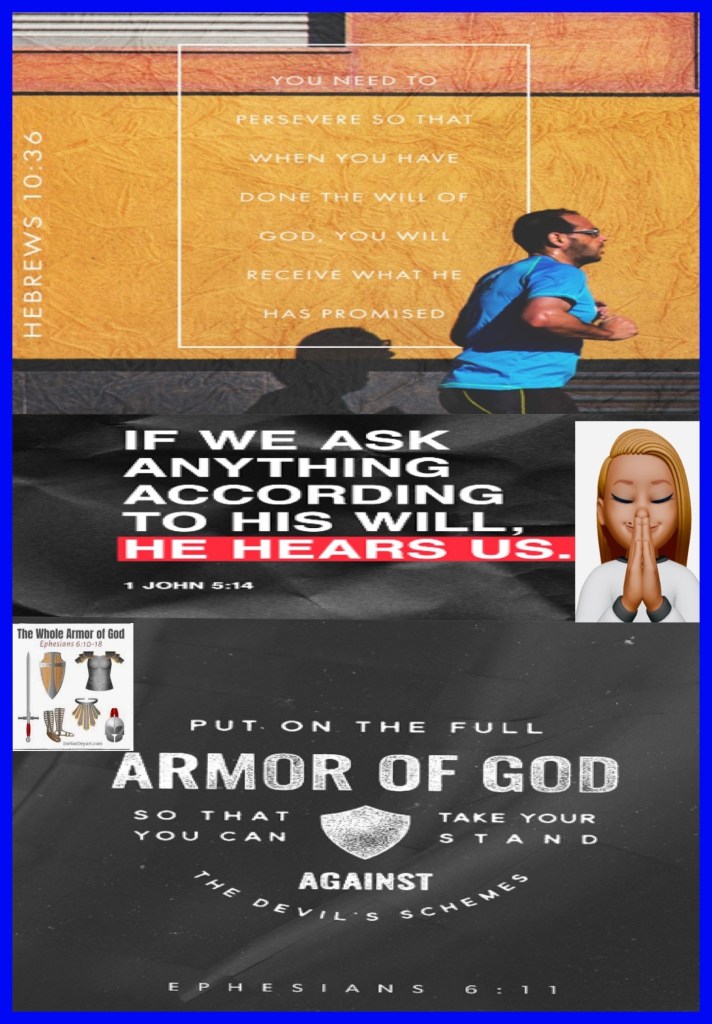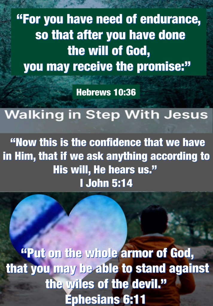 “For you have need of endurance, so that after you have done the will of God, you may receive the promise:” Hebrews 10:36 “Now this is the confidence that we have in Him, that if we ask anything according to His will, He hears us.” I John 5:14 “Put on the whole armor of God, that you may be able to stand against the wiles of the devil.” Ephesians 6:11