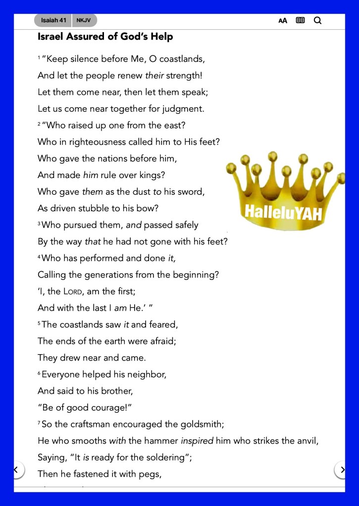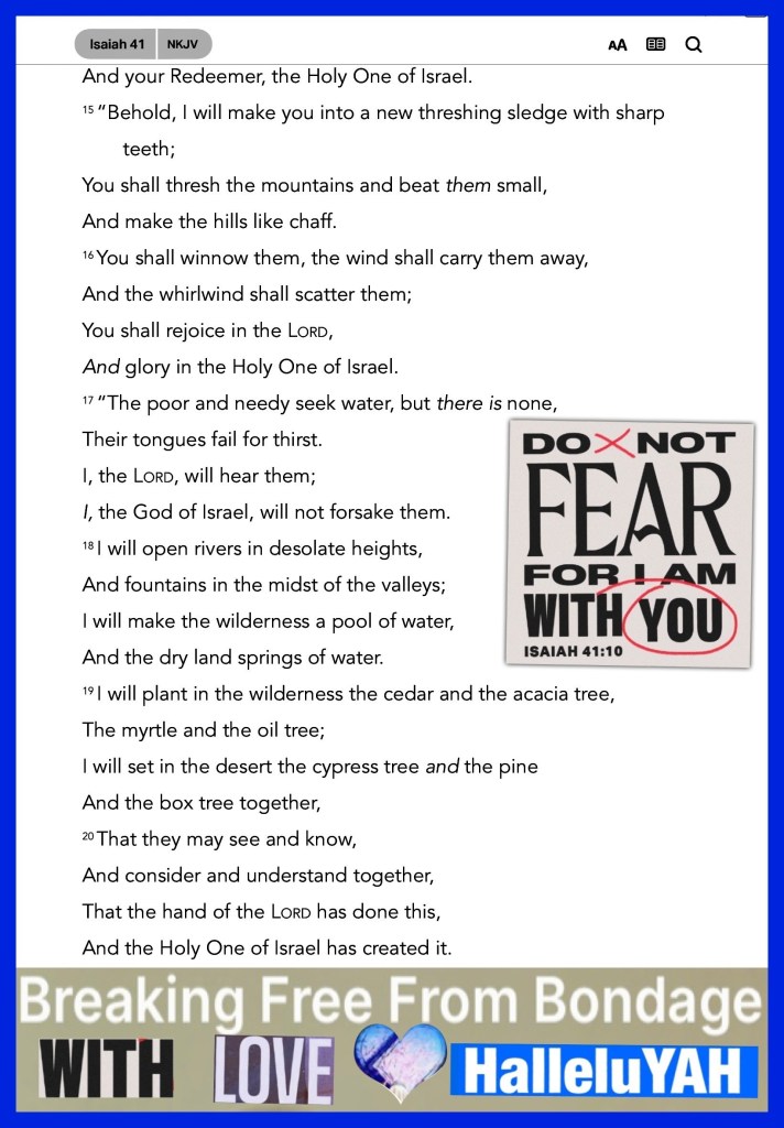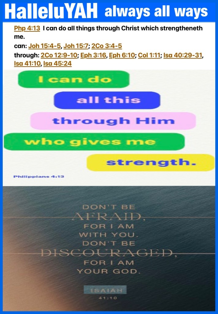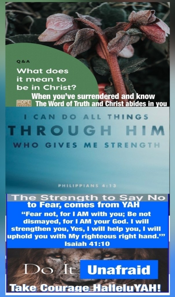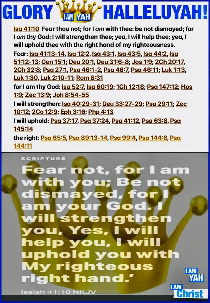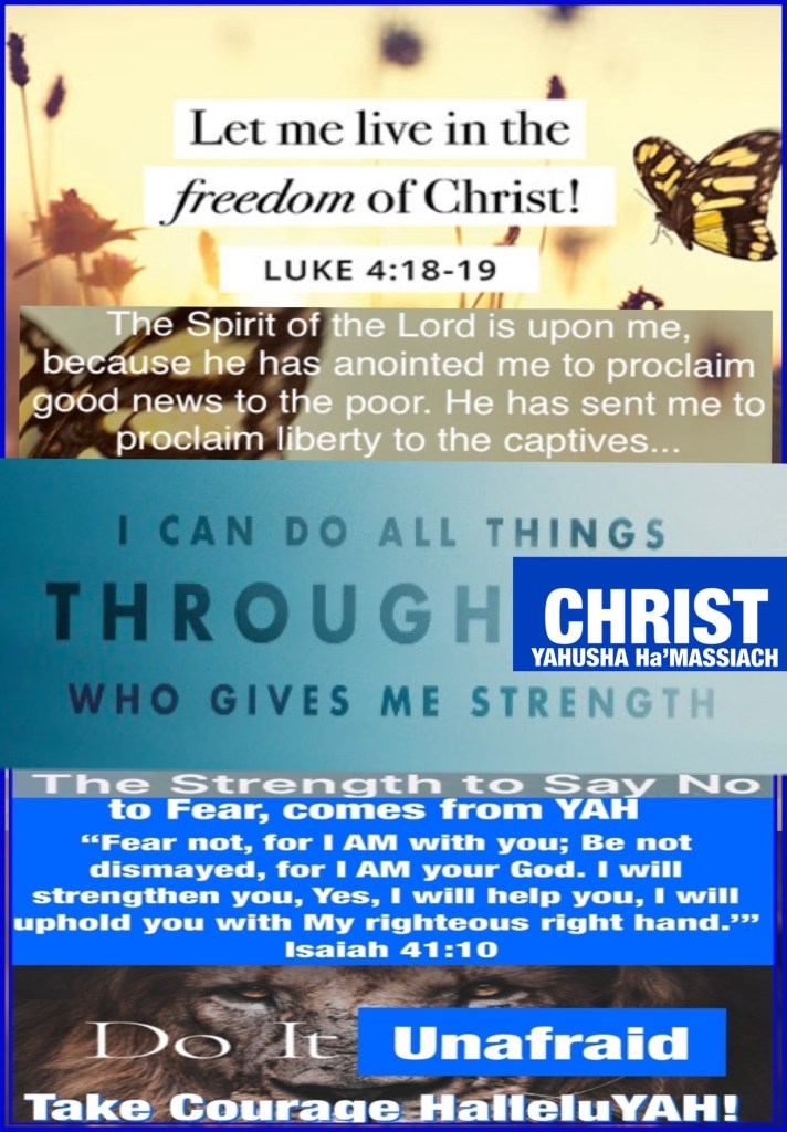 ““The Spirit of The Lord YAH is upon Me, Because He has anointed Me To preach the gospel to the poor; He has sent Me to heal the brokenhearted, To proclaim liberty to the captives And recovery of sight to the blind, To set at liberty those who are oppressed; To proclaim the acceptable year of The Lord YAH. ”” Luke 4:18-19 “I can do all things through Christ who strengthens me.” Philippians 4:13 “Fear not, for I AM with you; Be not dismayed, for I AM your God. I will strengthen you, Yes, I will help you, I will uphold you with My righteous right hand.’” Isaiah 41:10