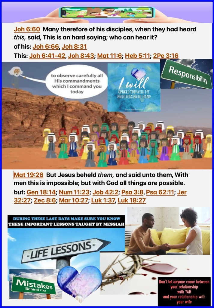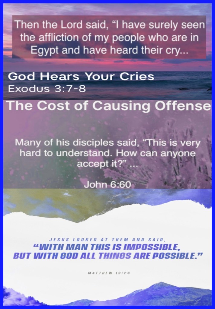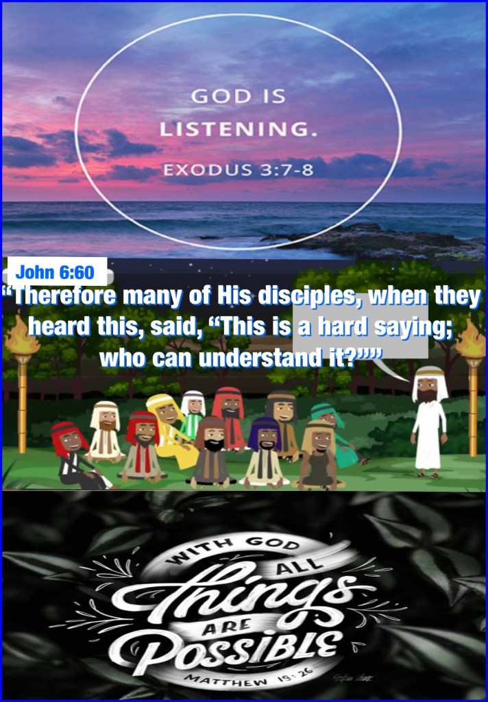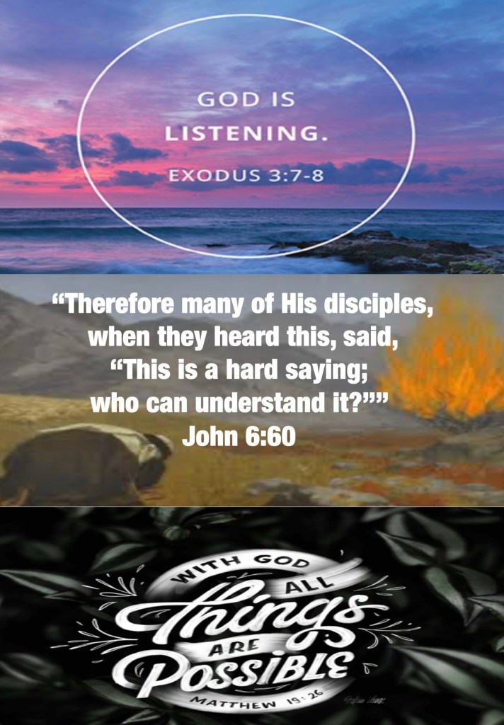 “And the Lord said: “I have surely seen the oppression of My people who are in Egypt, and have heard their cry because of their taskmasters, for I know their sorrows. So I have come down to deliver them out of the hand of the Egyptians, and to bring them up from that land to a good and large land, to a land flowing with milk and honey, to the place of the Canaanites and the Hittites and the Amorites and the Perizzites and the Hivites and the Jebusites.” Exodus 3:7-8 “Therefore many of His disciples, when they heard this, said, “This is a hard saying; who can understand it?”” John 6:60 “But Jesus looked at them and said to them, “With men this is impossible, but with God all things are possible.”” Matthew 19:26