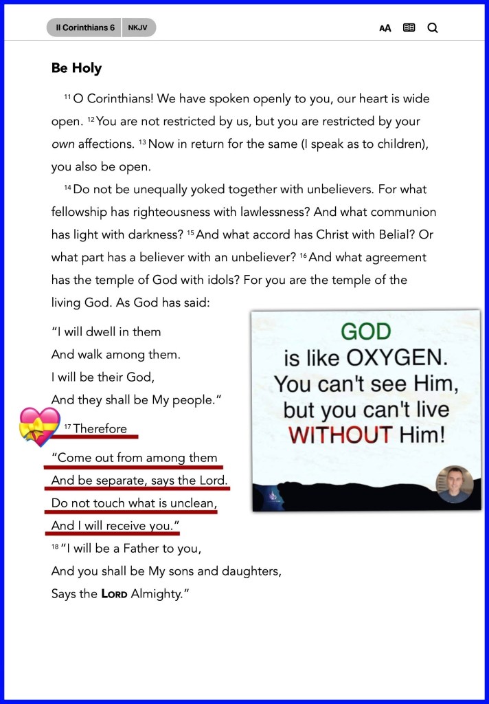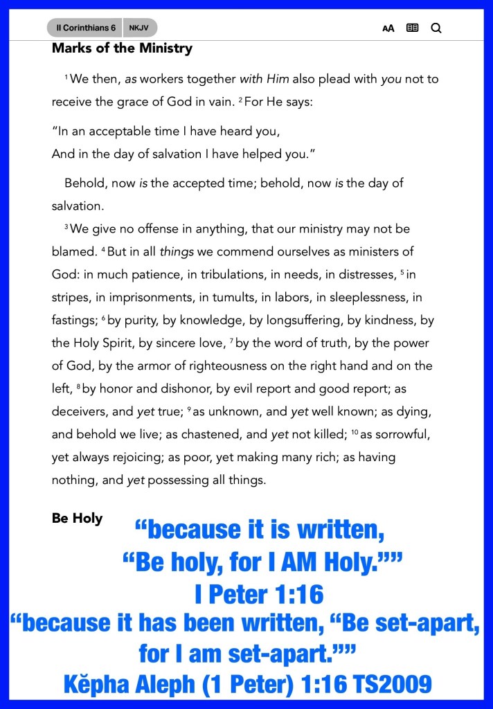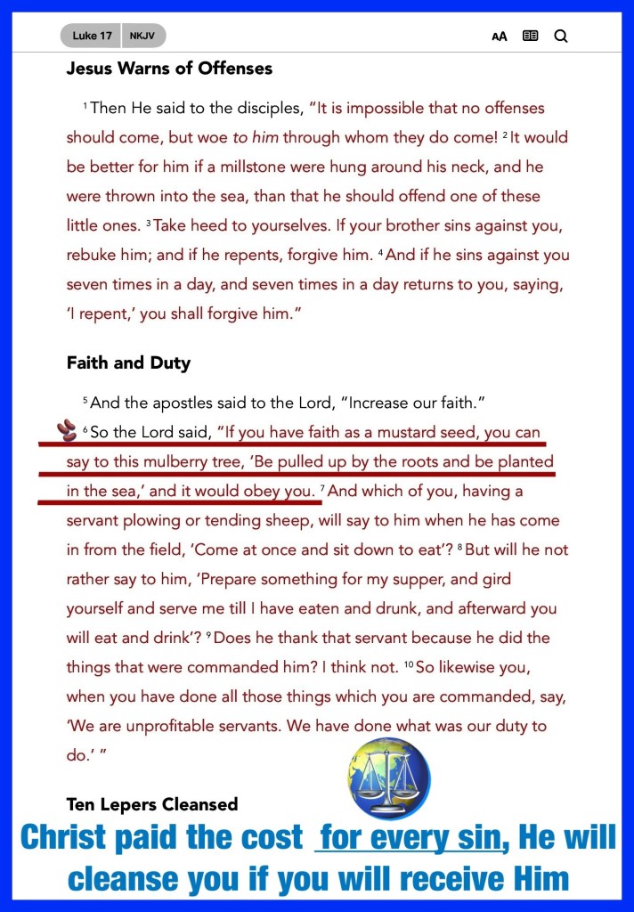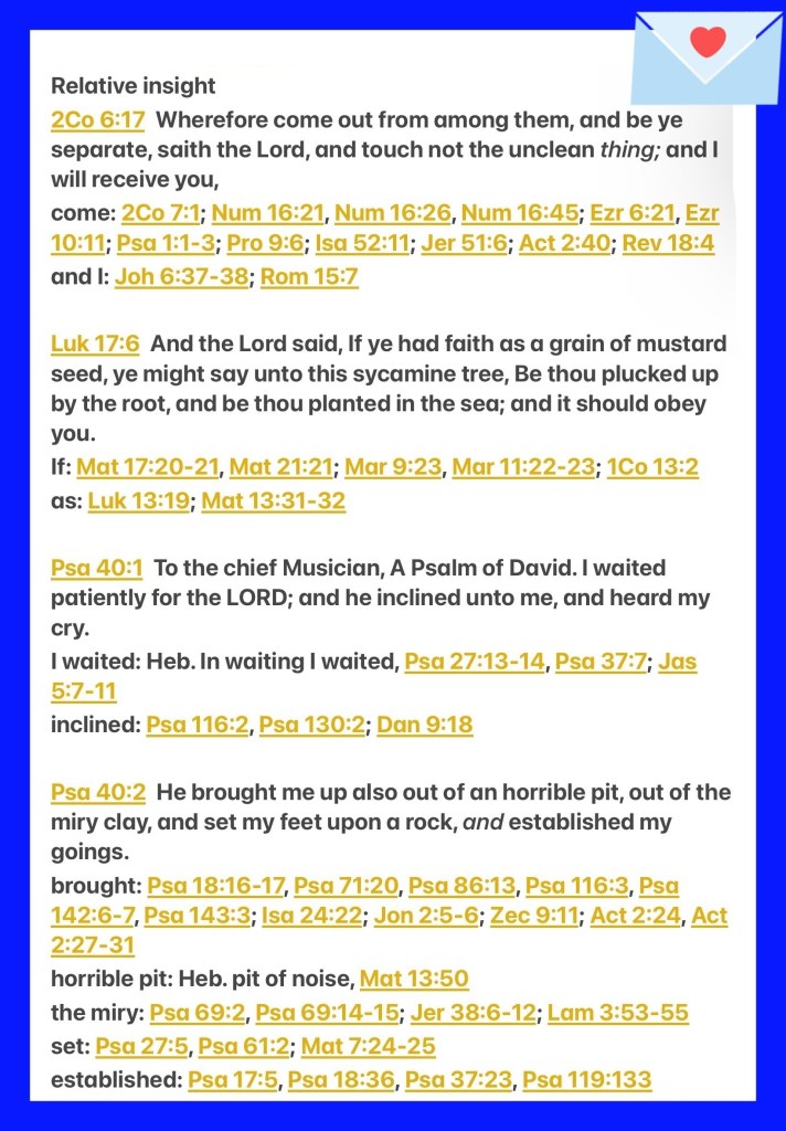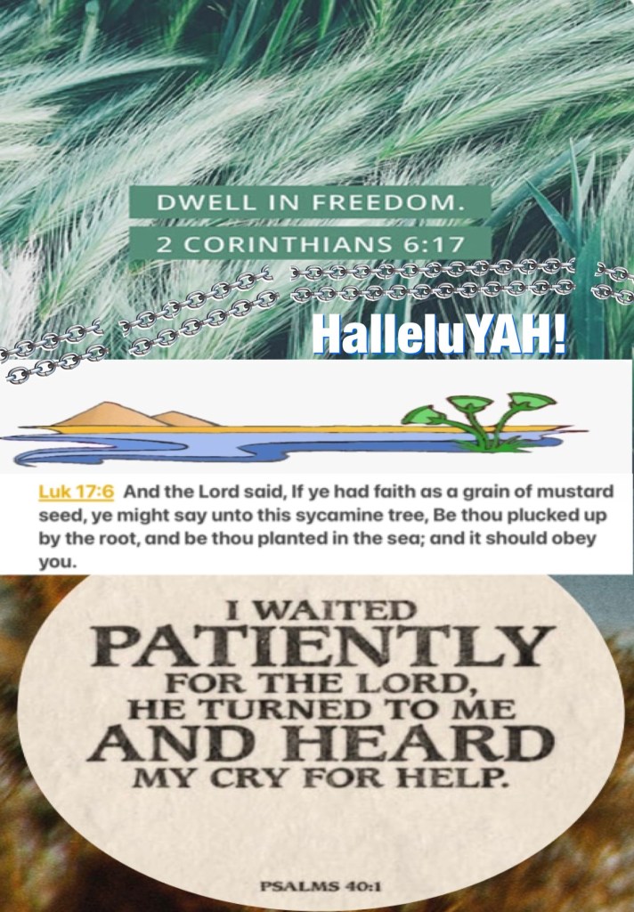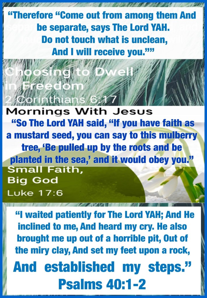“Therefore “Come out from among them And be separate, says The Lord YAH. Do not touch what is unclean, And I will receive you.”” II Corinthians 6:17 “So The Lord YAH said, “If you have faith as a mustard seed, you can say to this mulberry tree, ‘Be pulled up by the roots and be planted in the sea,’ and it would obey you.” Luke 17:6 “I waited patiently for The Lord YAH; And He inclined to me, And heard my cry. He also brought me up out of a horrible pit, Out of the miry clay, And set my feet upon a rock, And established my steps.” Psalms 40:1-2