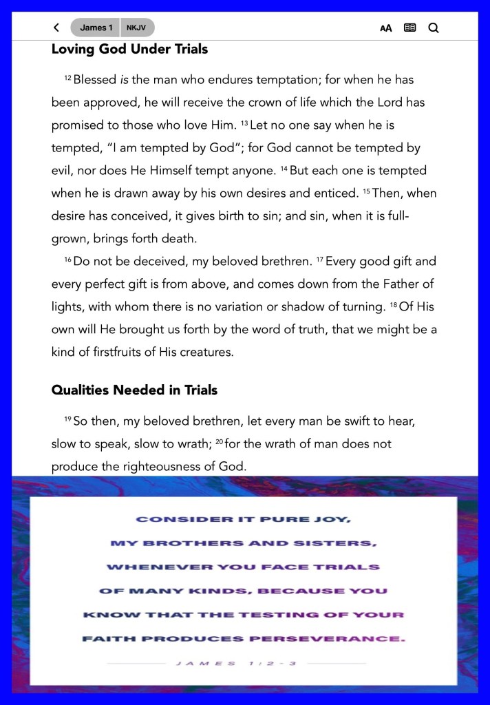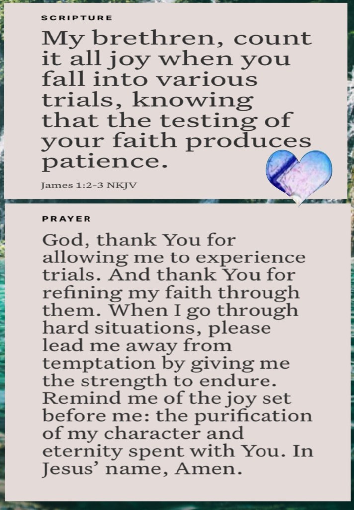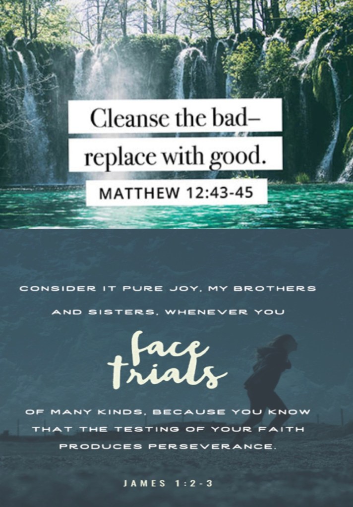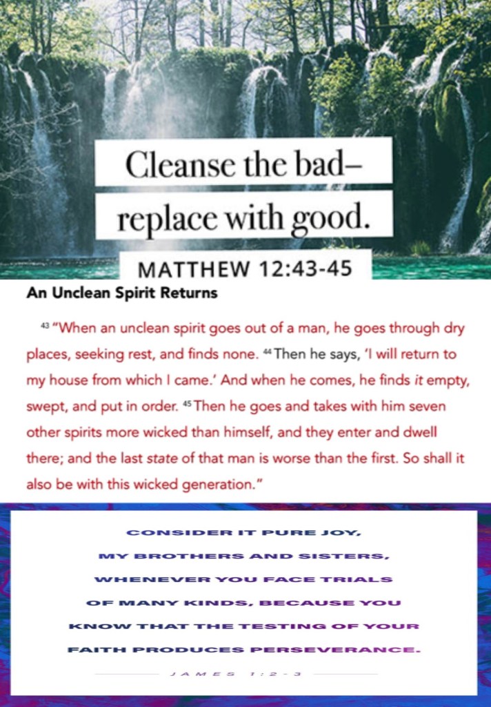 ““When an unclean spirit goes out of a man, he goes through dry places, seeking rest, and finds none. Then he says, ‘I will return to my house from which I came.’ And when he comes, he finds it empty, swept, and put in order. Then he goes and takes with him seven other spirits more wicked than himself, and they enter and dwell there; and the last state of that man is worse than the first. So shall it also be with this wicked generation.”” Matthew 12:43-45 “My brethren, count it all joy when you fall into various trials, knowing that the testing of your faith produces patience.” James 1:2-3