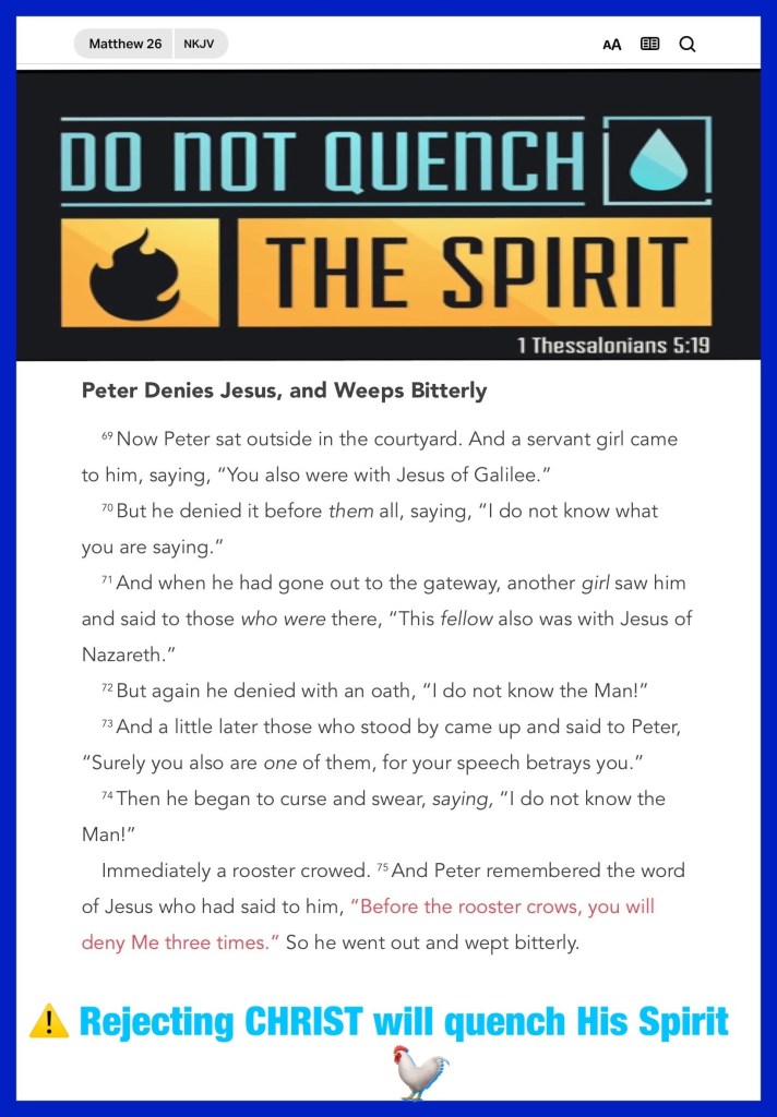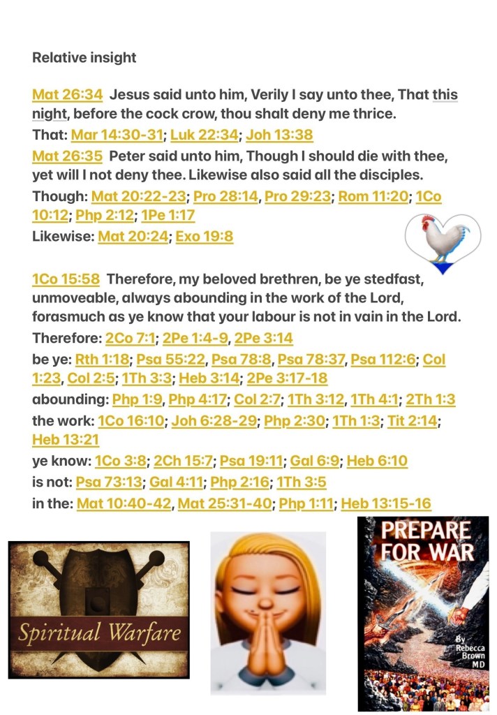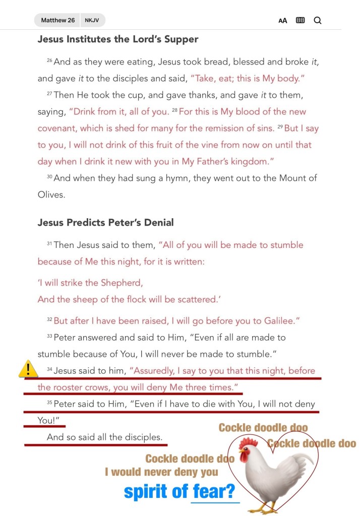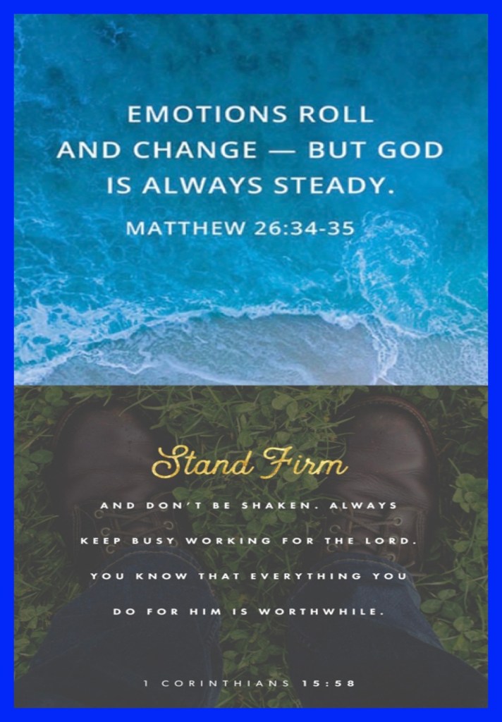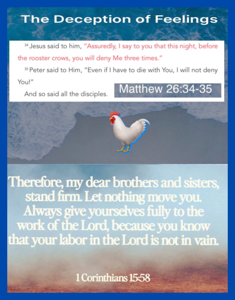 “Jesus said to him, “Assuredly, I say to you that this night, before the rooster crows, you will deny Me three times.” Peter said to Him, “Even if I have to die with You, I will not deny You!” And so said all the disciples.” Matthew 26:34-35 “Therefore, my beloved brethren, be steadfast, immovable, always abounding in the work of The Lord, knowing that your labor is not in vain in The Lord.” I Corinthians 15:58