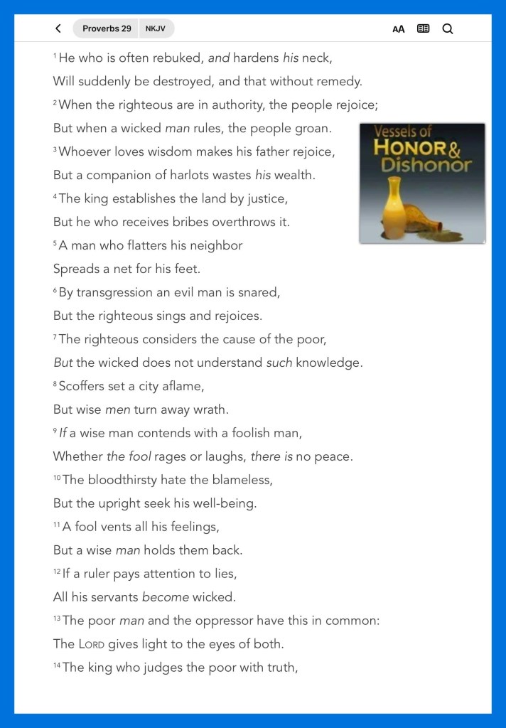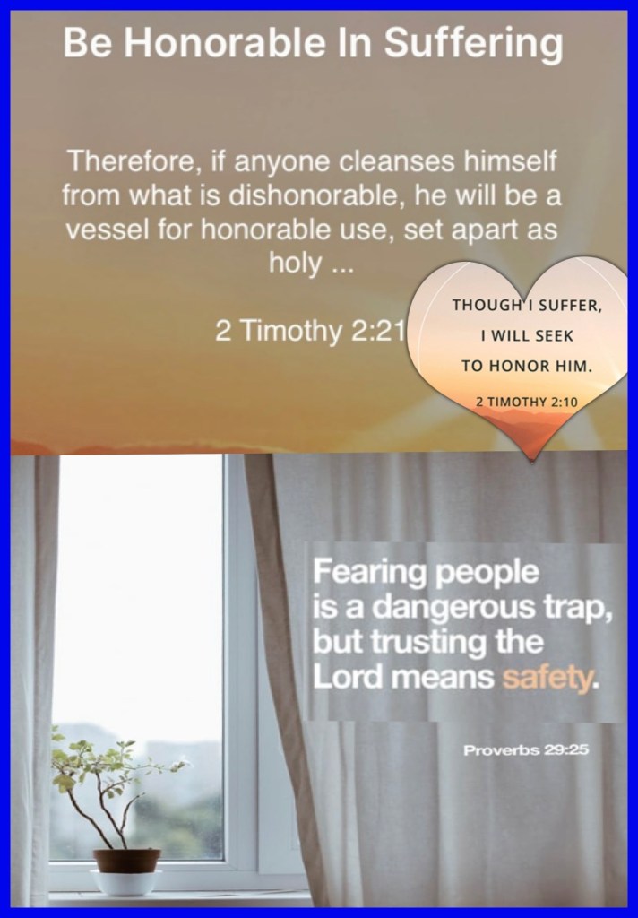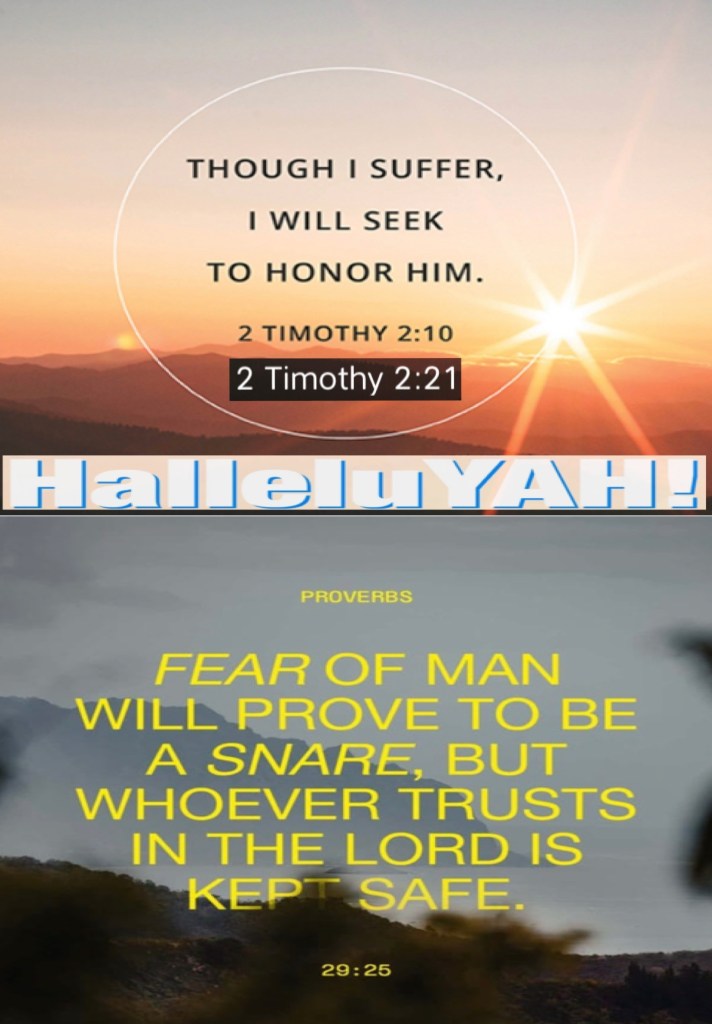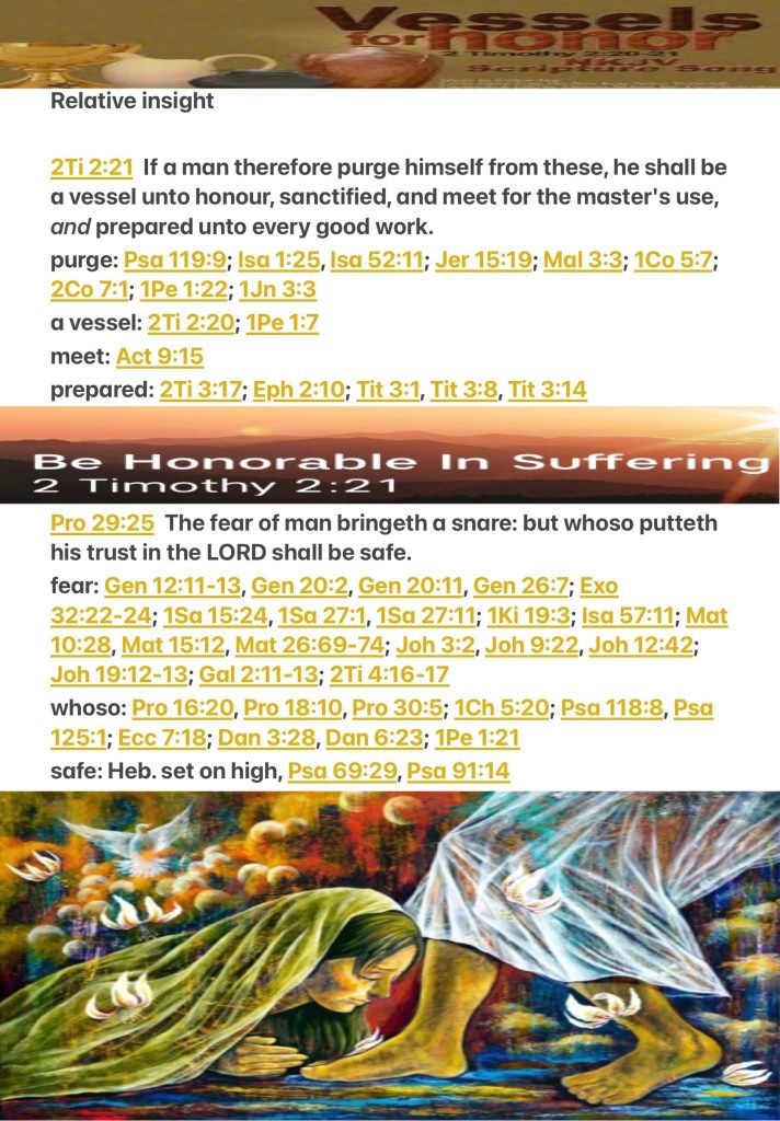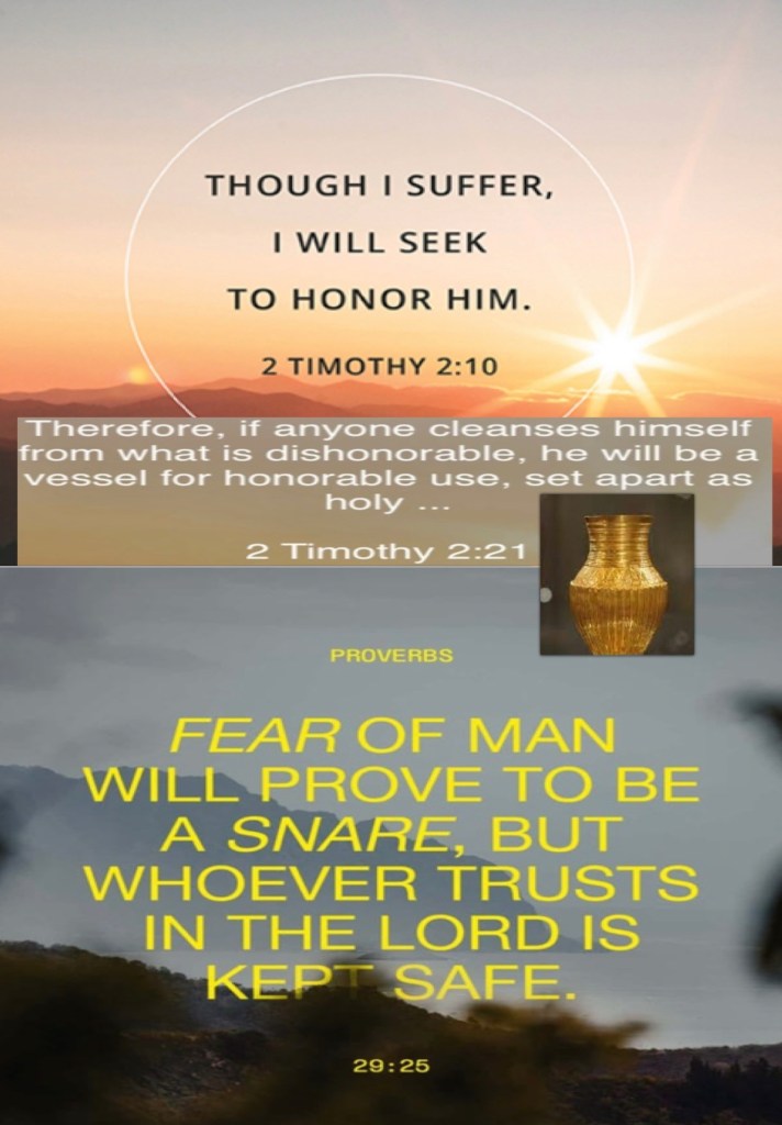 “Therefore if anyone cleanses himself from the latter, he will be a vessel for honor, sanctified and useful for The Master, prepared for every good work.” II Timothy 2:21 “The fear of man brings a snare, But whoever trusts in The Lord shall be safe.” Proverbs 29:25