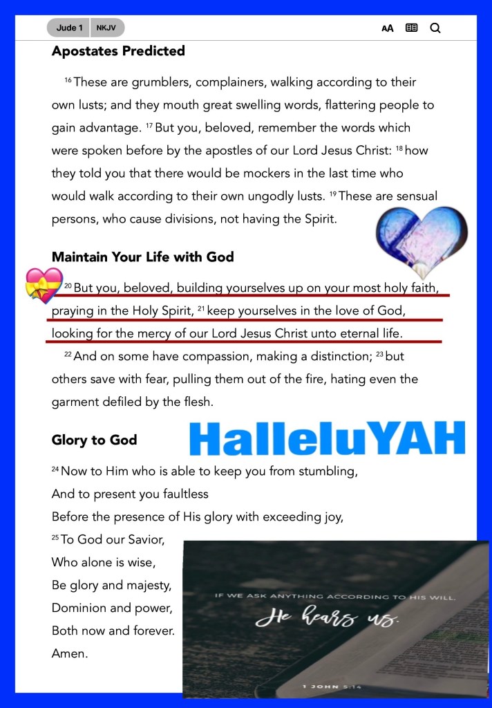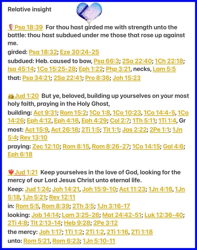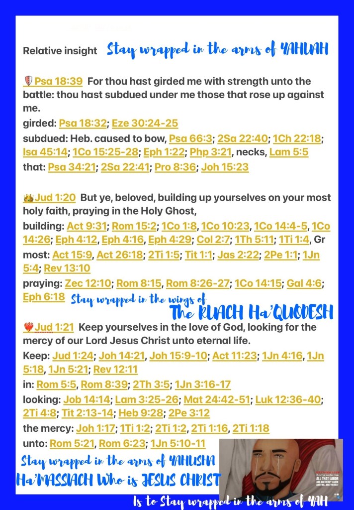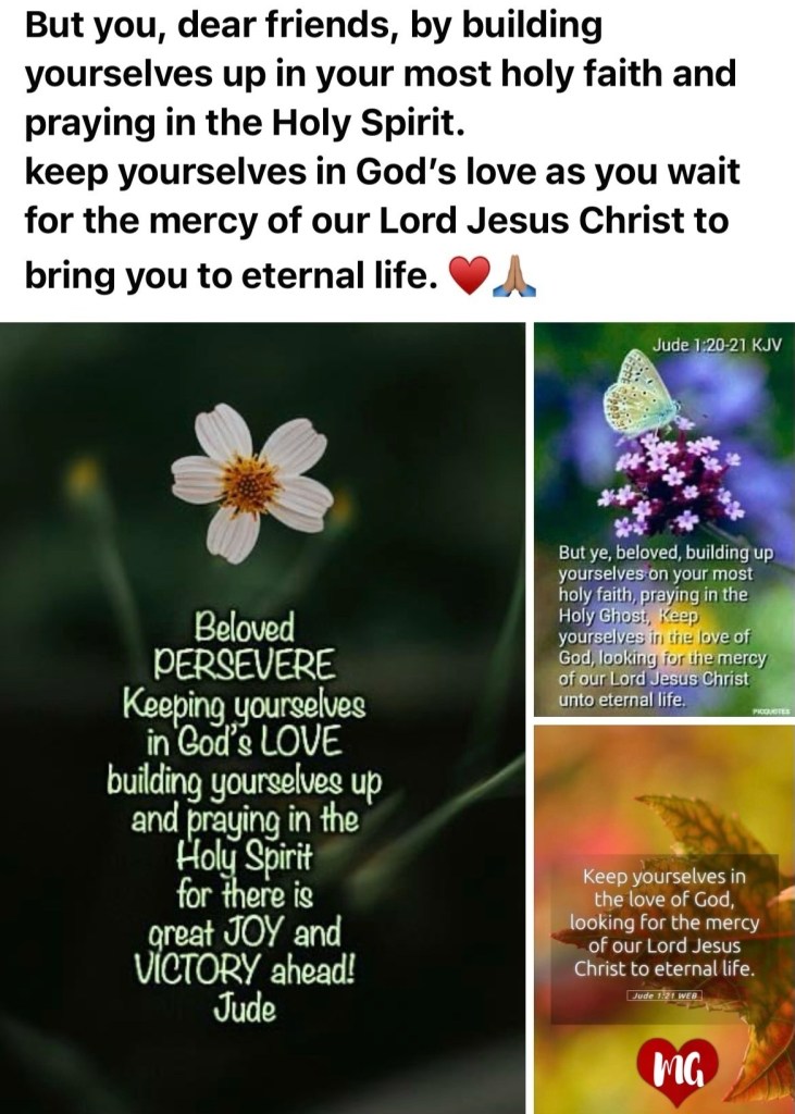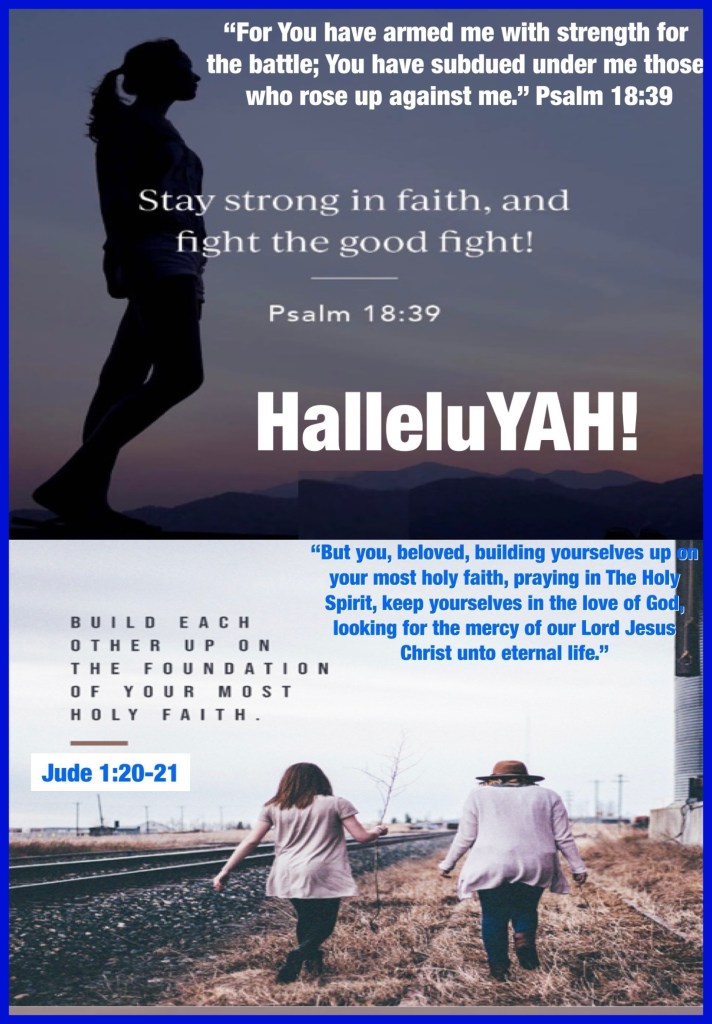 “For You have armed me with strength for the battle; You have subdued under me those who rose up against me.” Psalms 18:39 “But you, beloved, building yourselves up on your most holy faith, praying in The Holy Spirit, keep yourselves in the love of God, looking for the mercy of our Lord Jesus Christ unto eternal life.” Jude 1:20-21