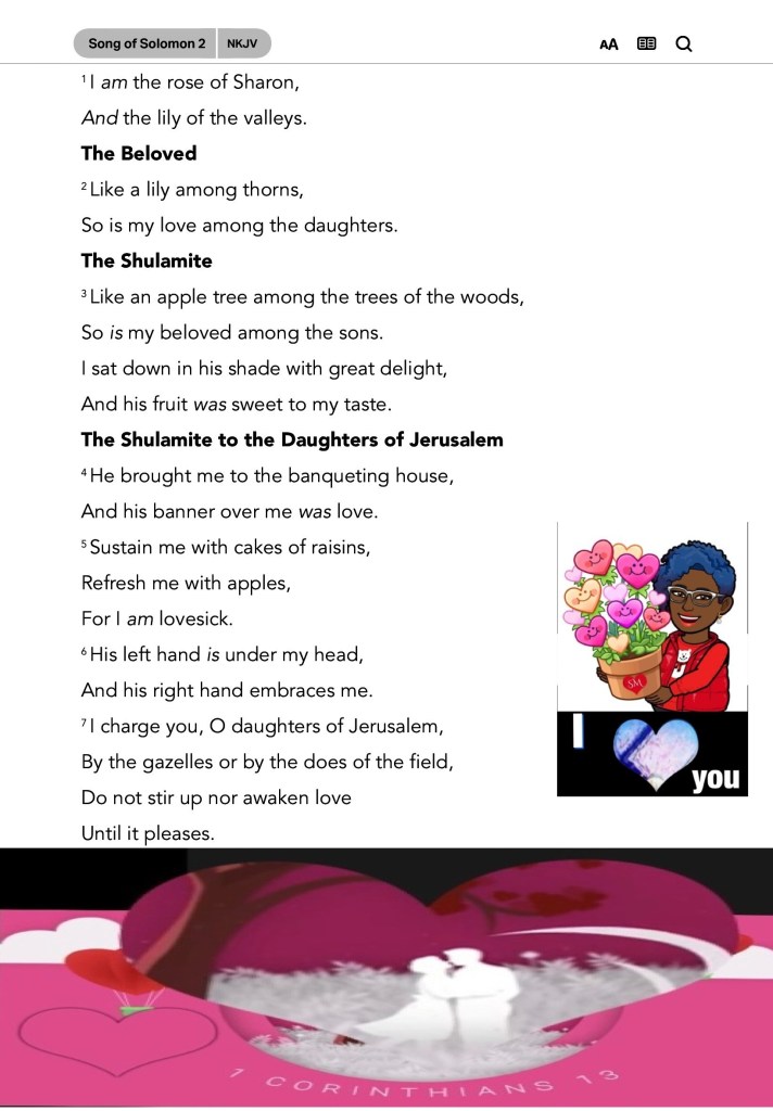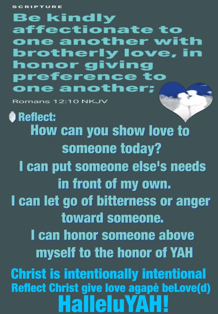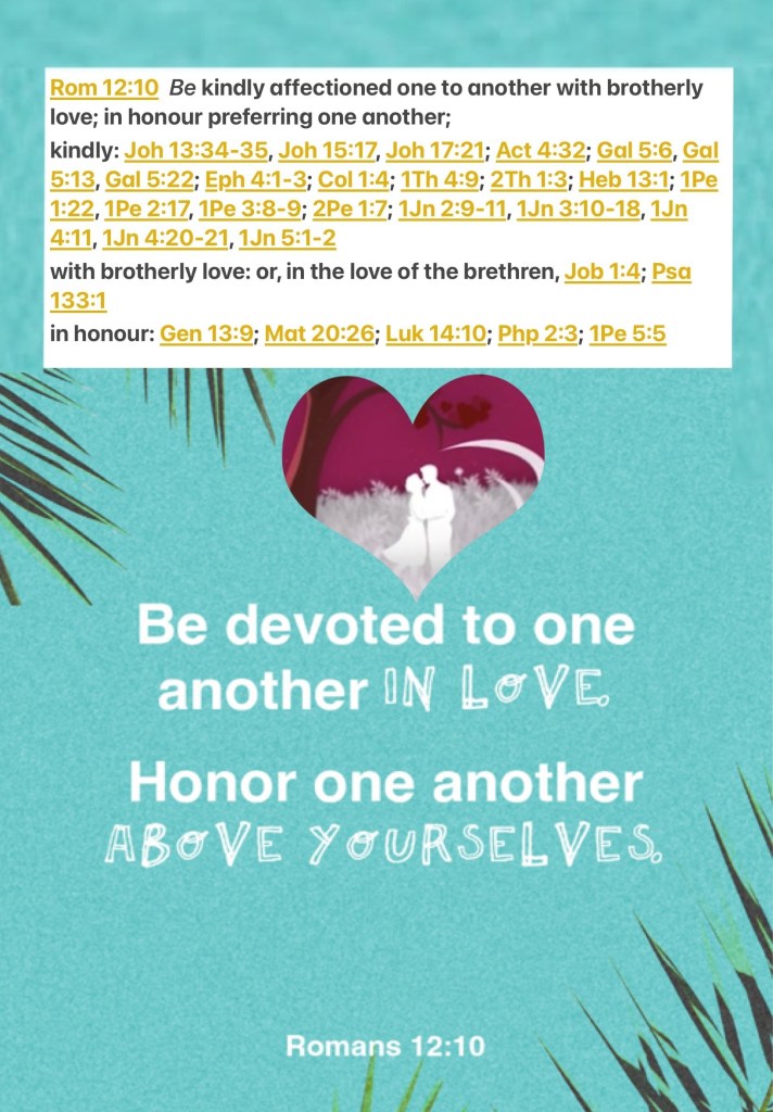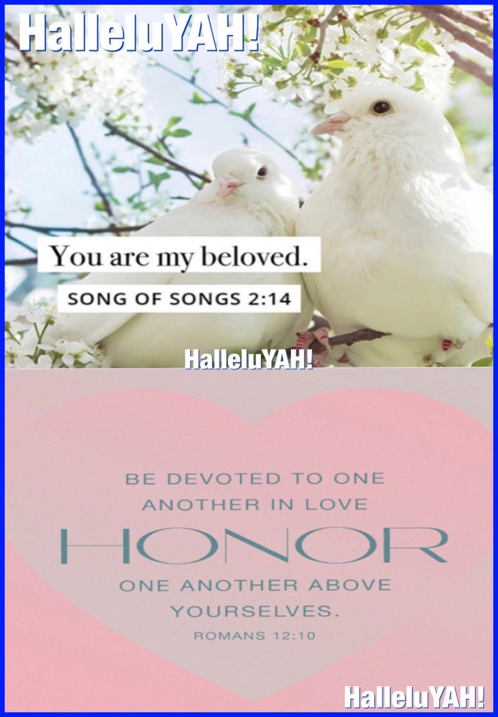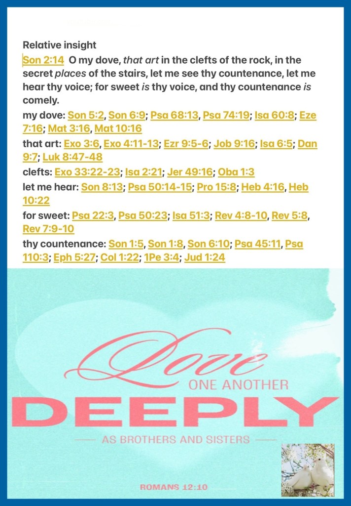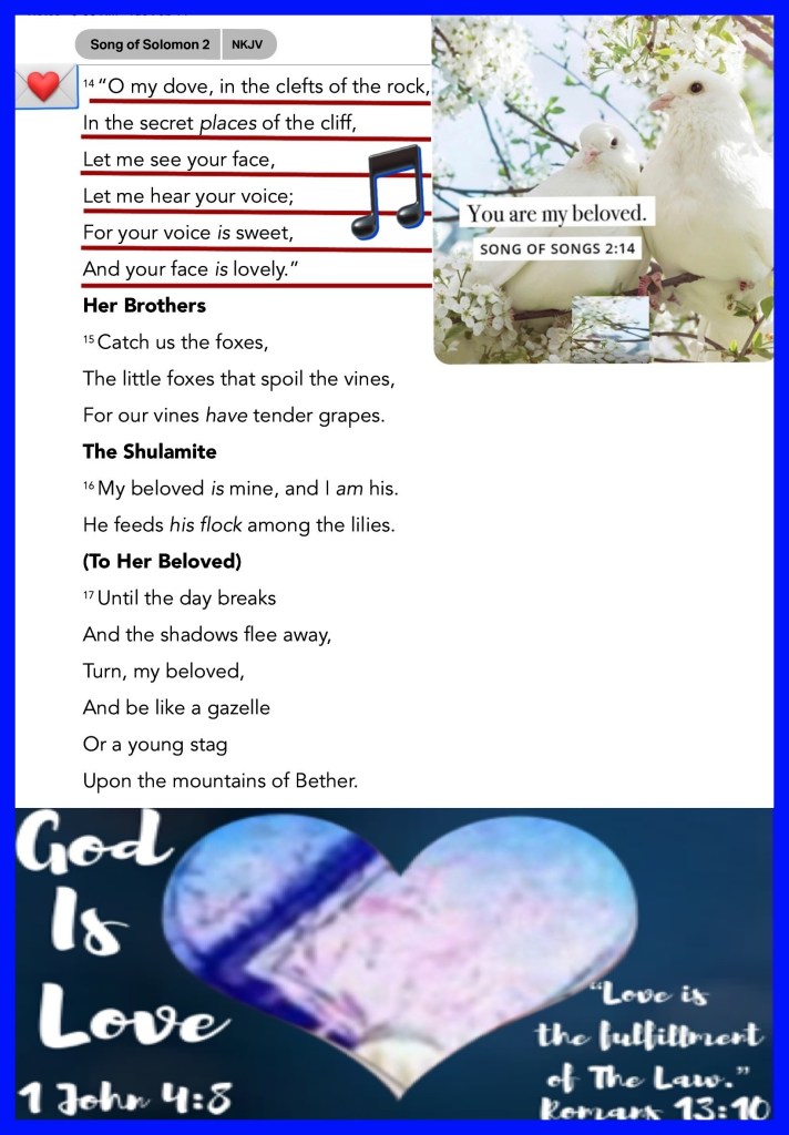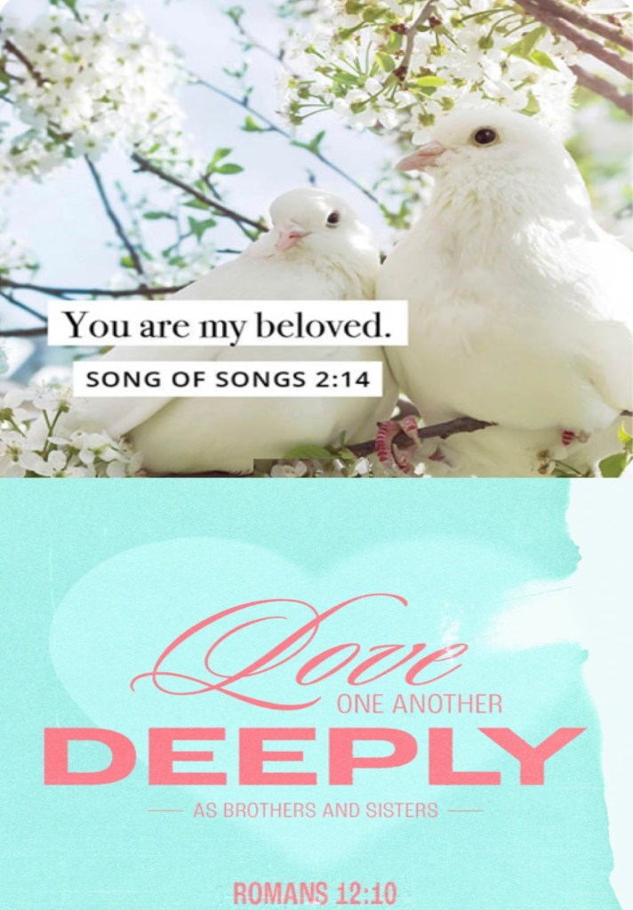 ““O my dove, in the clefts of the rock, In the secret places of the cliff, Let me see your face, Let me hear your voice; For your voice is sweet, And your face is lovely.””Song of Solomon 2:14 “Be kindly affectionate to one another with brotherly love, in honor giving preference to one another;” Romans 12:10