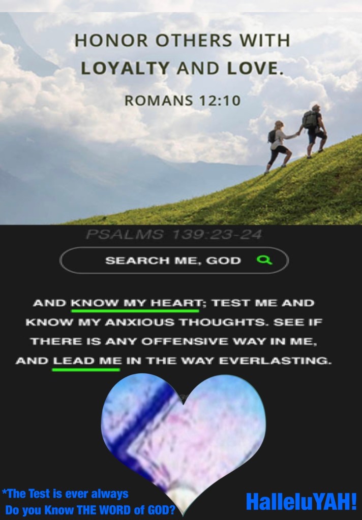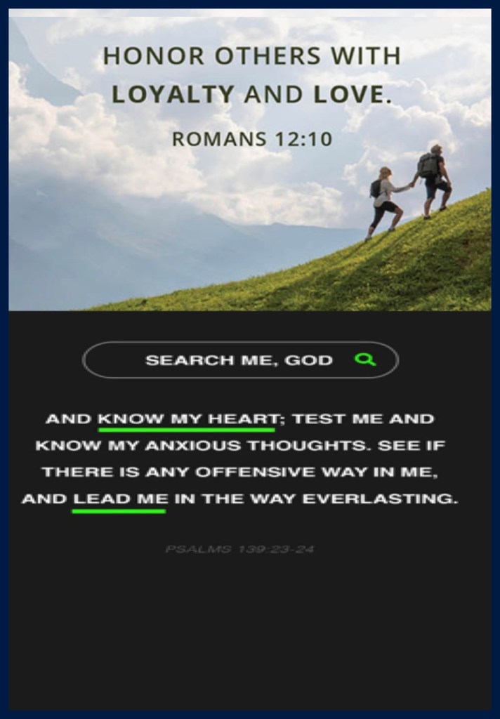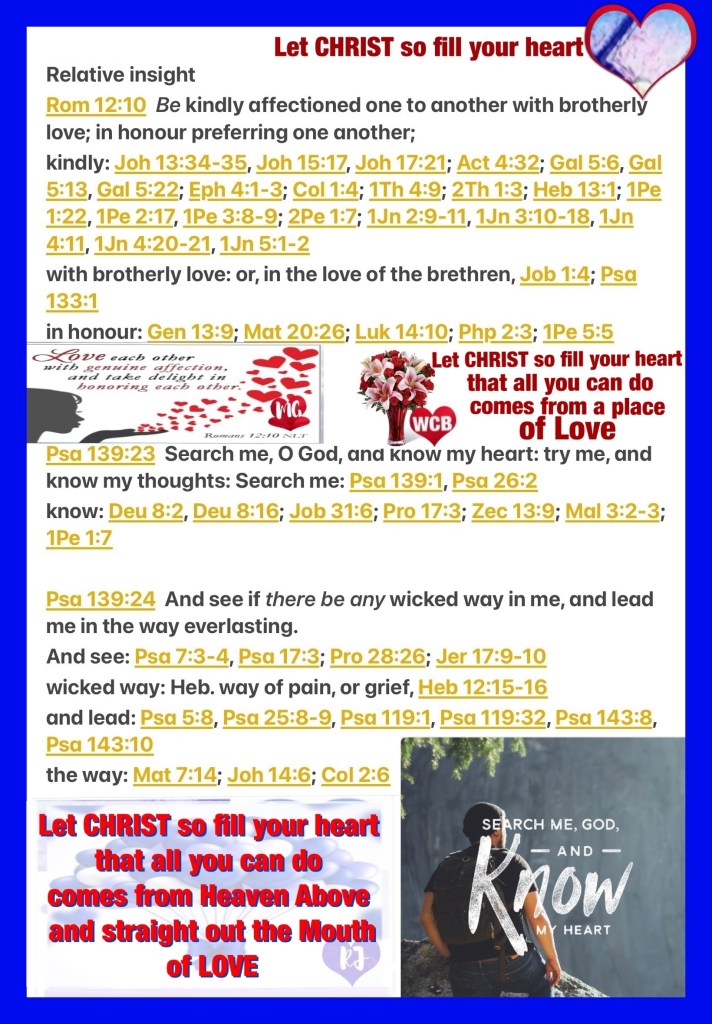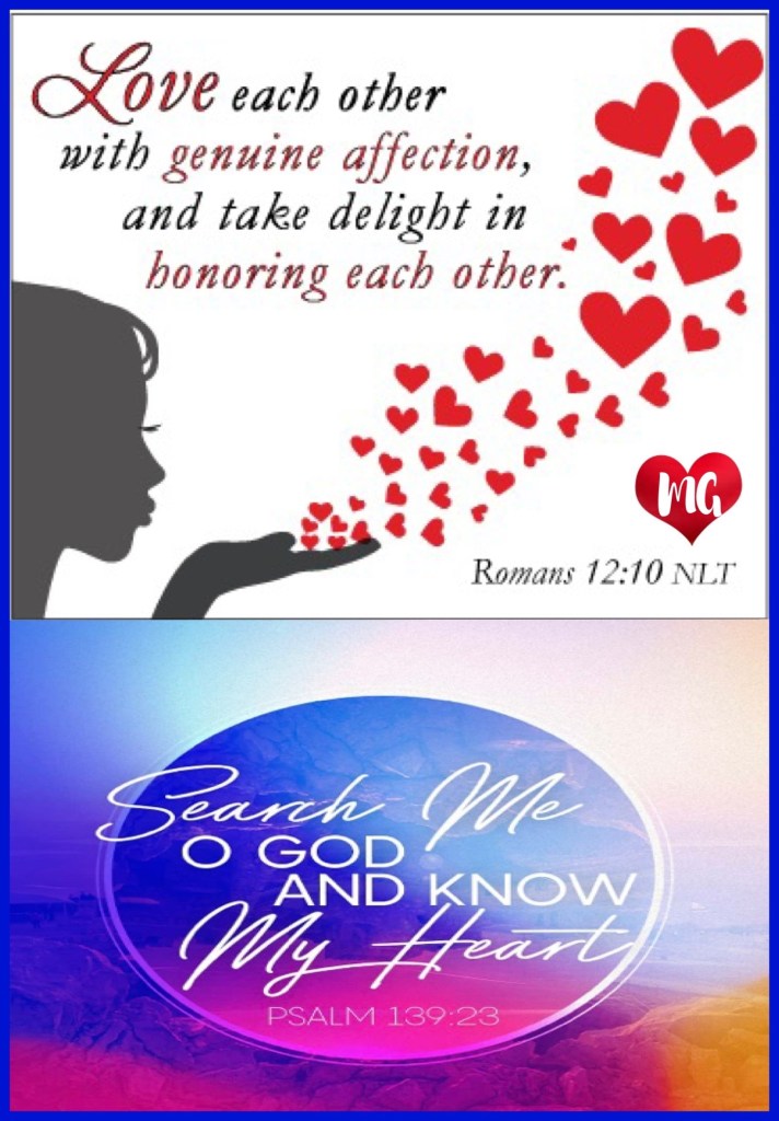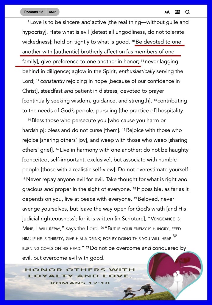 “Be devoted to one another with [authentic] brotherly affection [as members of one family], give preference to one another in honor;” Romans 12:10 “Search me, O God, and know my heart; Try me, and know my anxieties; And see if there is any wicked way in me, And lead me in the way everlasting.” Psalms 139:23-24