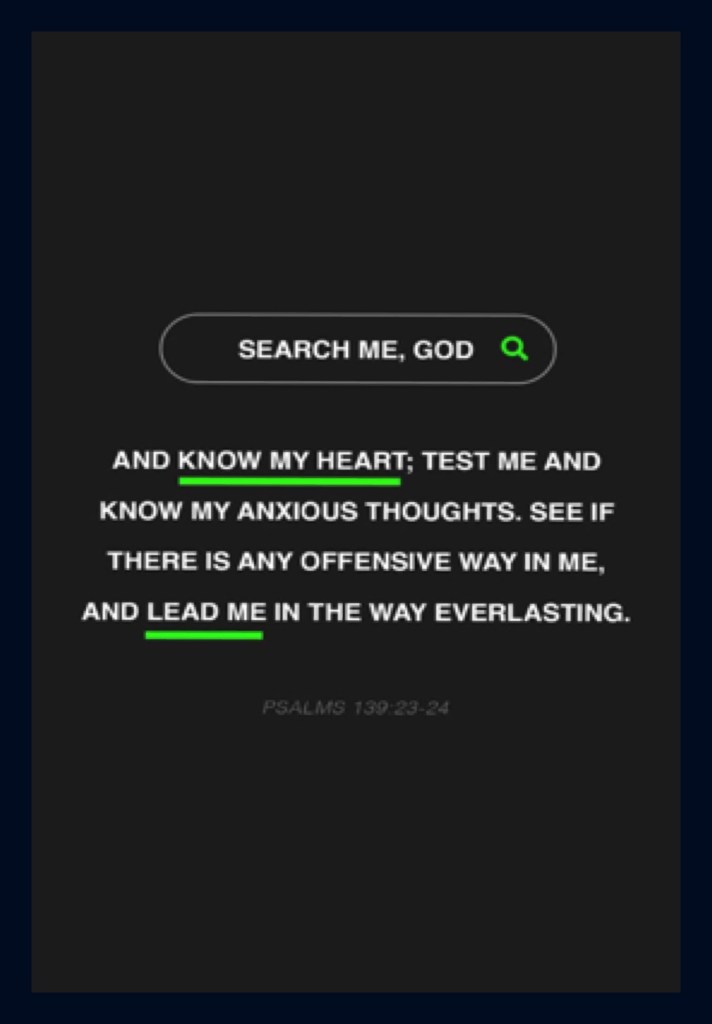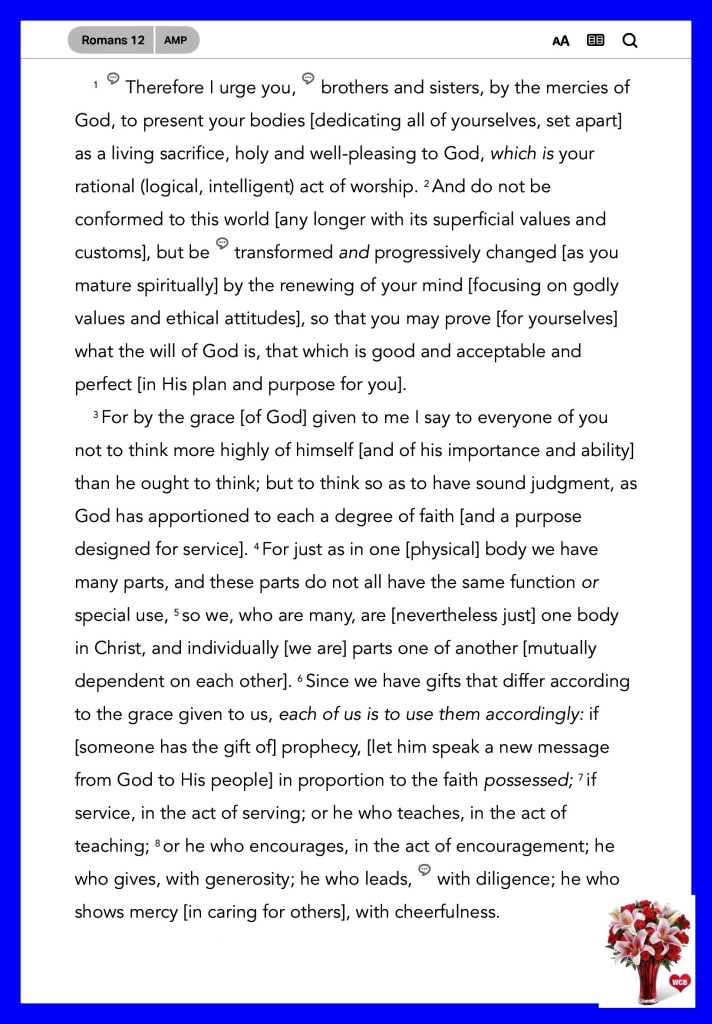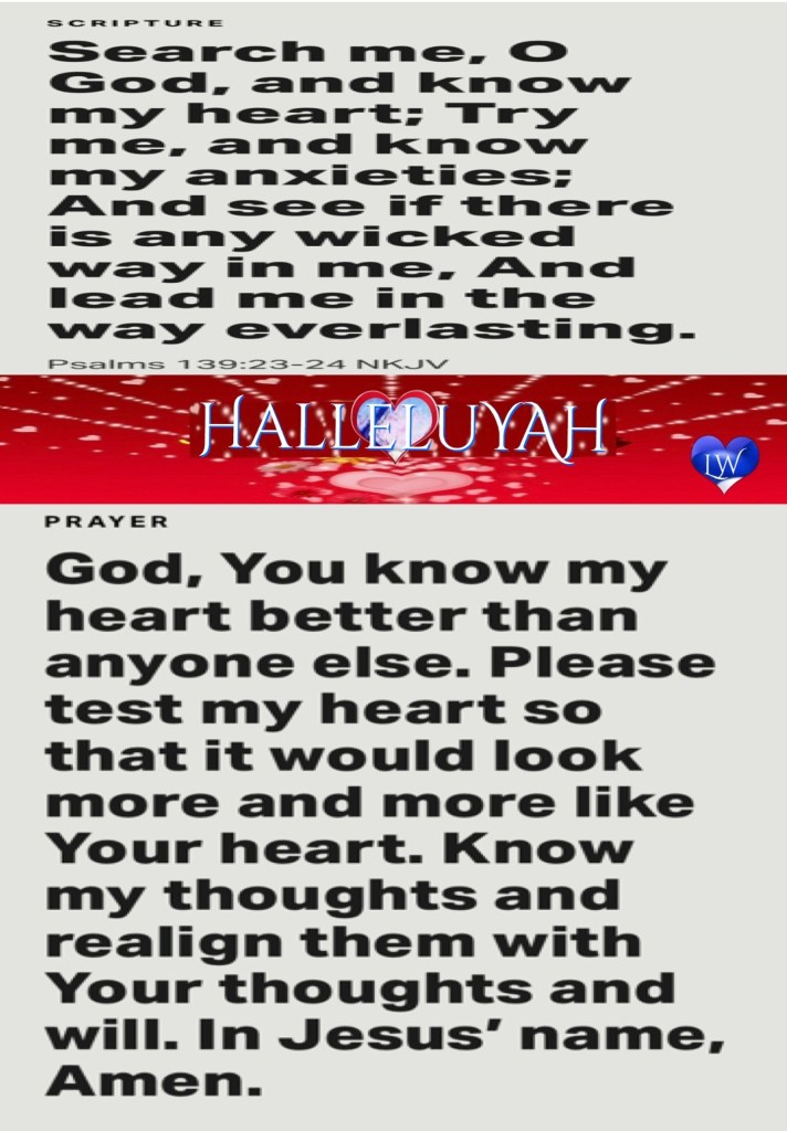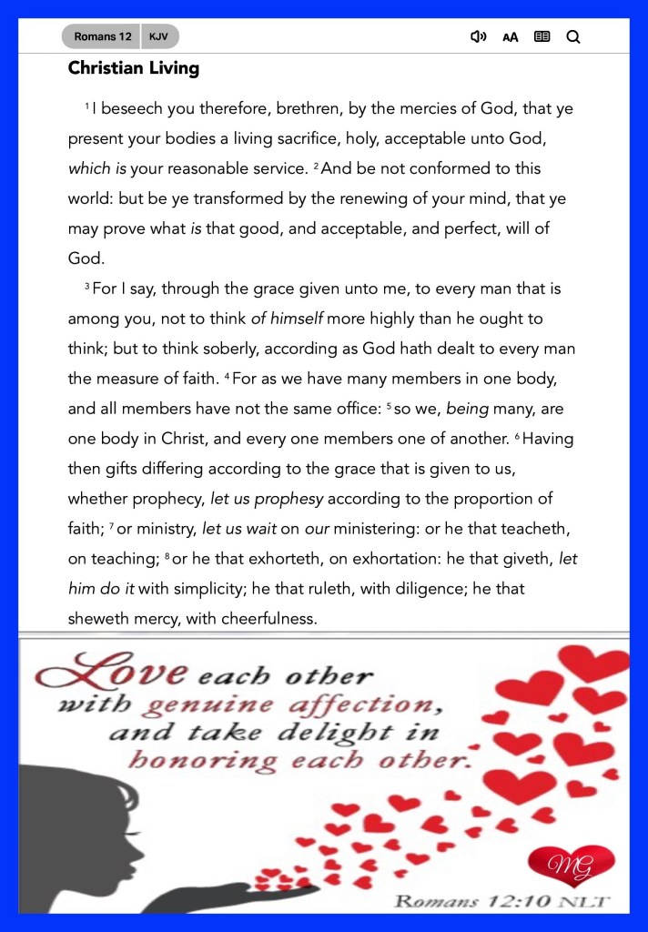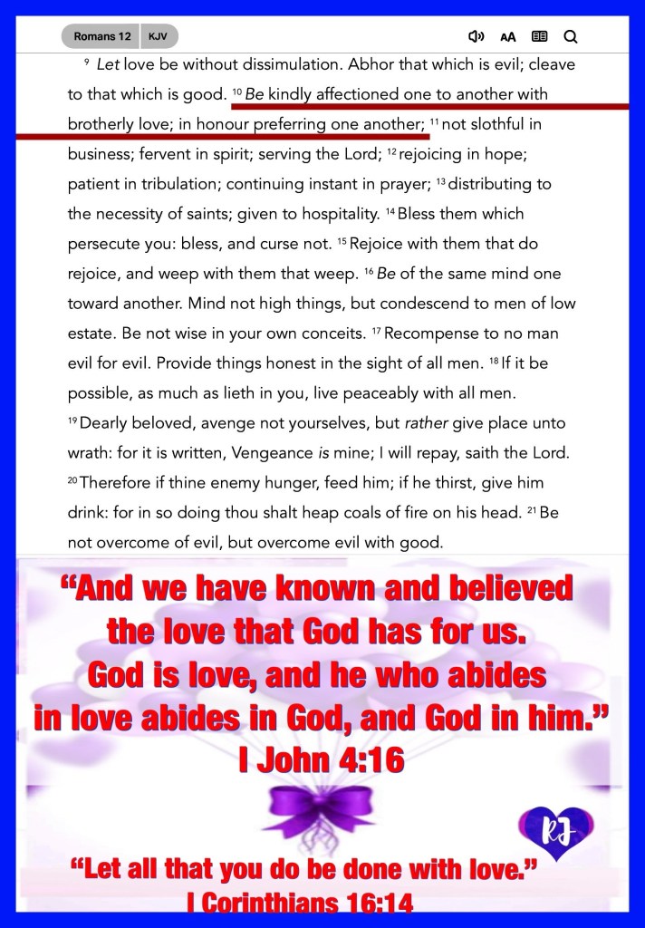“Be devoted to one another with [authentic] brotherly affection [as members of one family], give preference to one another in honor;” Romans 12:10 “Search me, O God, and know my heart; Try me, and know my anxieties; And see if there is any wicked way in me, And lead me in the way everlasting.” Psalms 139:23-24
