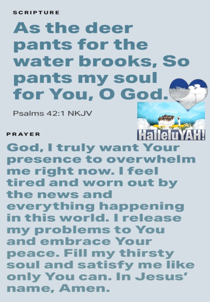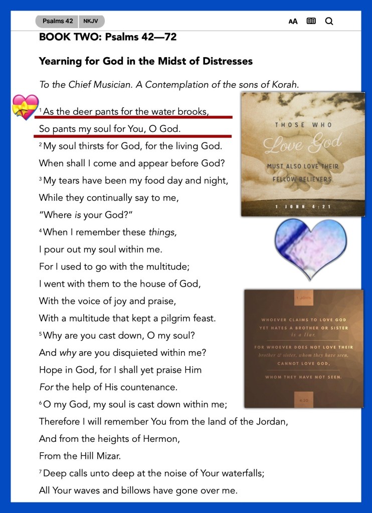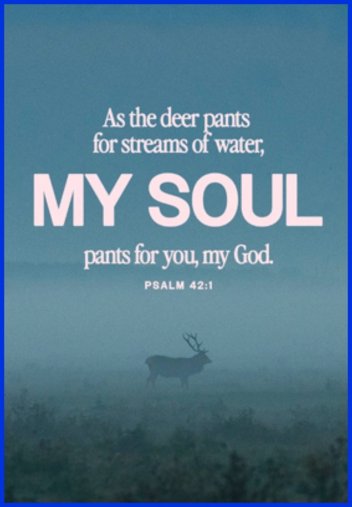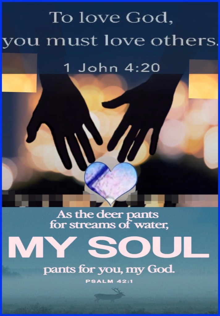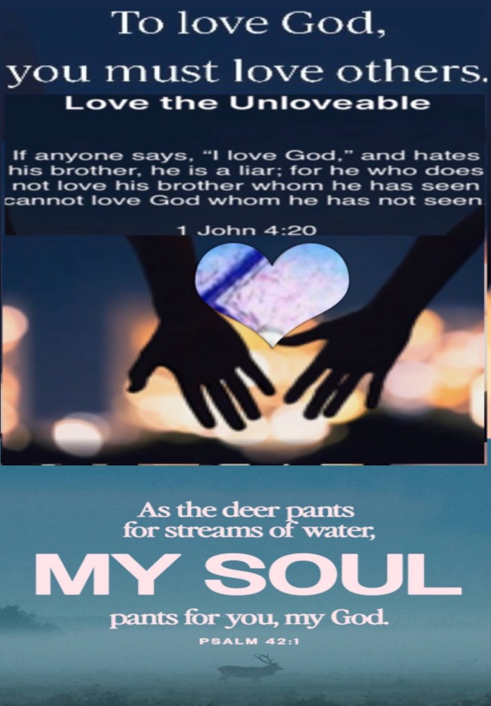 “If anyone says, “I love God,” and hates (works against) his [Christian] brother he is a liar; for the one who does not love his brother whom he has seen, cannot love God whom he has not seen.” 1 John 4:20 AMP “As the deer pants [longingly] for the water brooks, So my soul pants [longingly] for You, O God.”Psalms 42:1 AMP