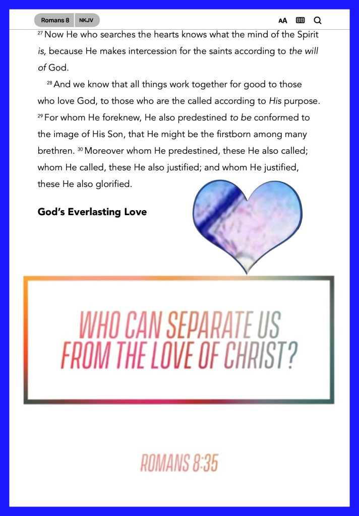 “Who shall ever separate us from the love of Christ? Will tribulation, or distress, or persecution, or famine, or nakedness, or danger, or sword?” Romans 8:35 AMP “I can do all things [which He has called me to do] through Him who strengthens and empowers me [to fulfill His purpose—I am self-sufficient in Christ’s sufficiency; I am ready for anything and equal to anything through Him who infuses me with inner strength and confident peace.]” Philippians 4:13 AMP