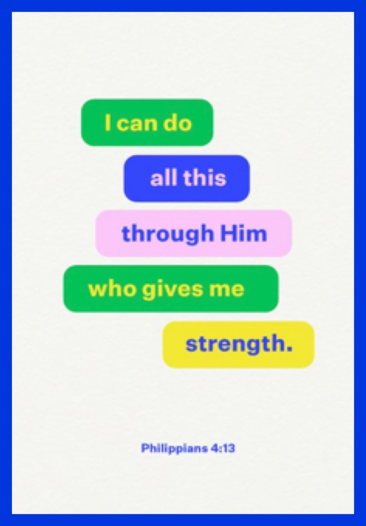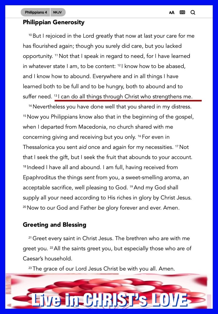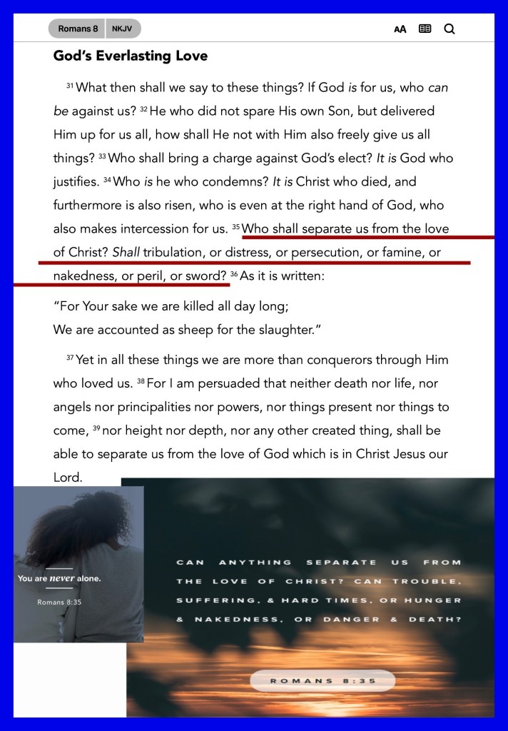 “Who shall separate us from the love of Christ? Shall tribulation, or distress, or persecution, or famine, or nakedness, or peril, or sword?” Romans 8:35 “I can do all things through Christ who strengthens me.” Philippians 4:13