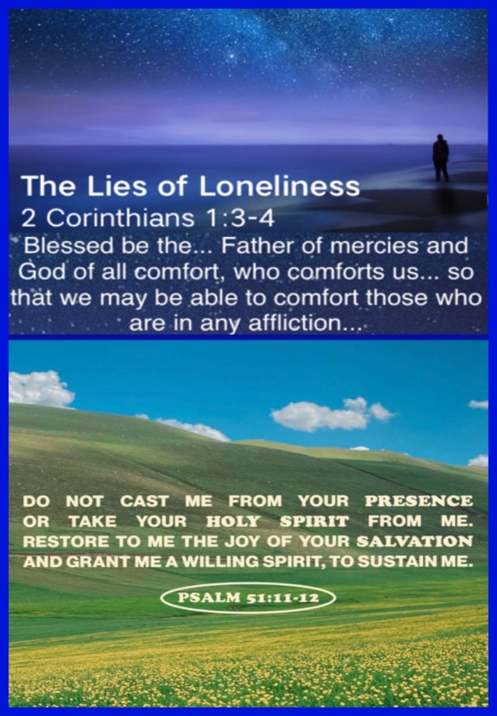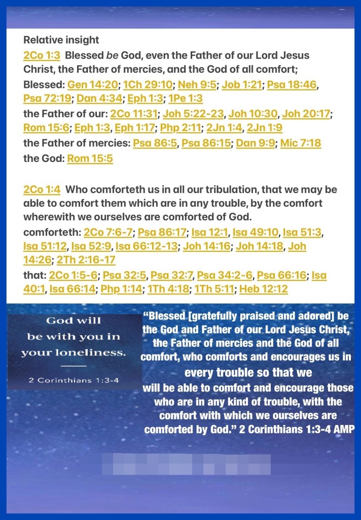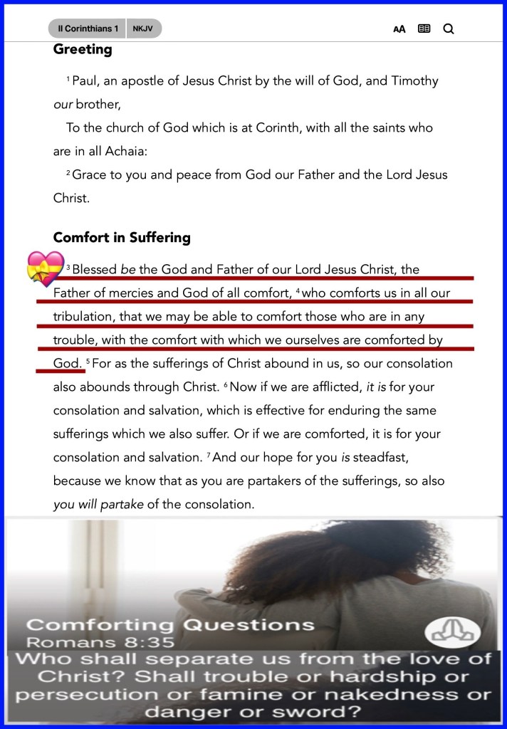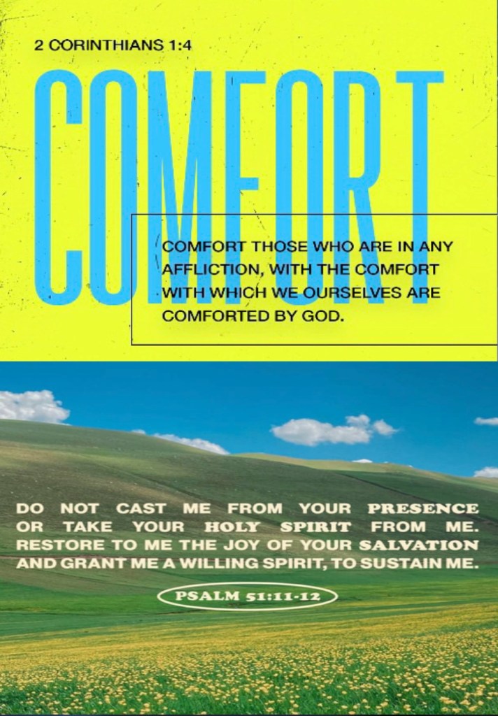 “Blessed be The God and Father of our Lord Jesus Christ, The Father of mercies and God of all comfort, who comforts us in all our tribulation, that we may be able to comfort those who are in any trouble, with the comfort with which we ourselves are comforted by God.” II Corinthians 1:3-4 “Do not cast me away from Your presence, And do not take Your Holy Spirit from me. Restore to me the joy of Your salvation, And uphold me by Your generous Spirit.” Psalms 51:11-12
