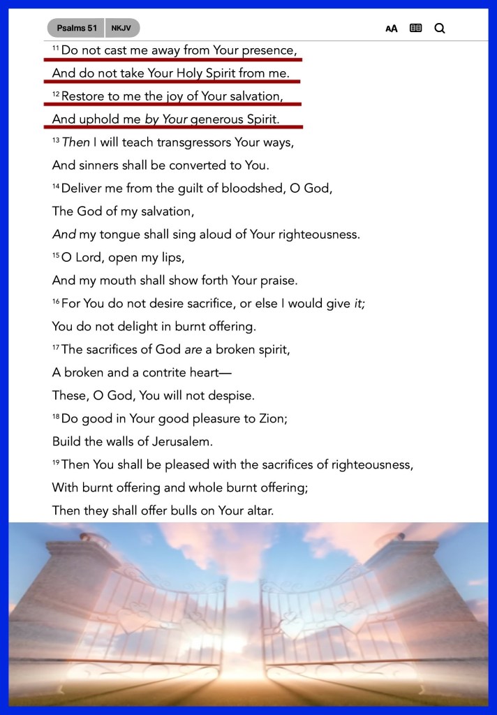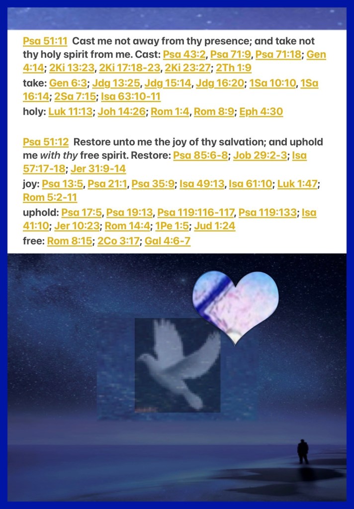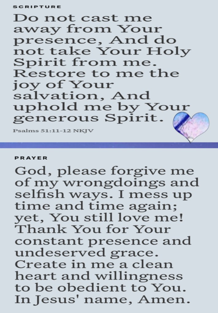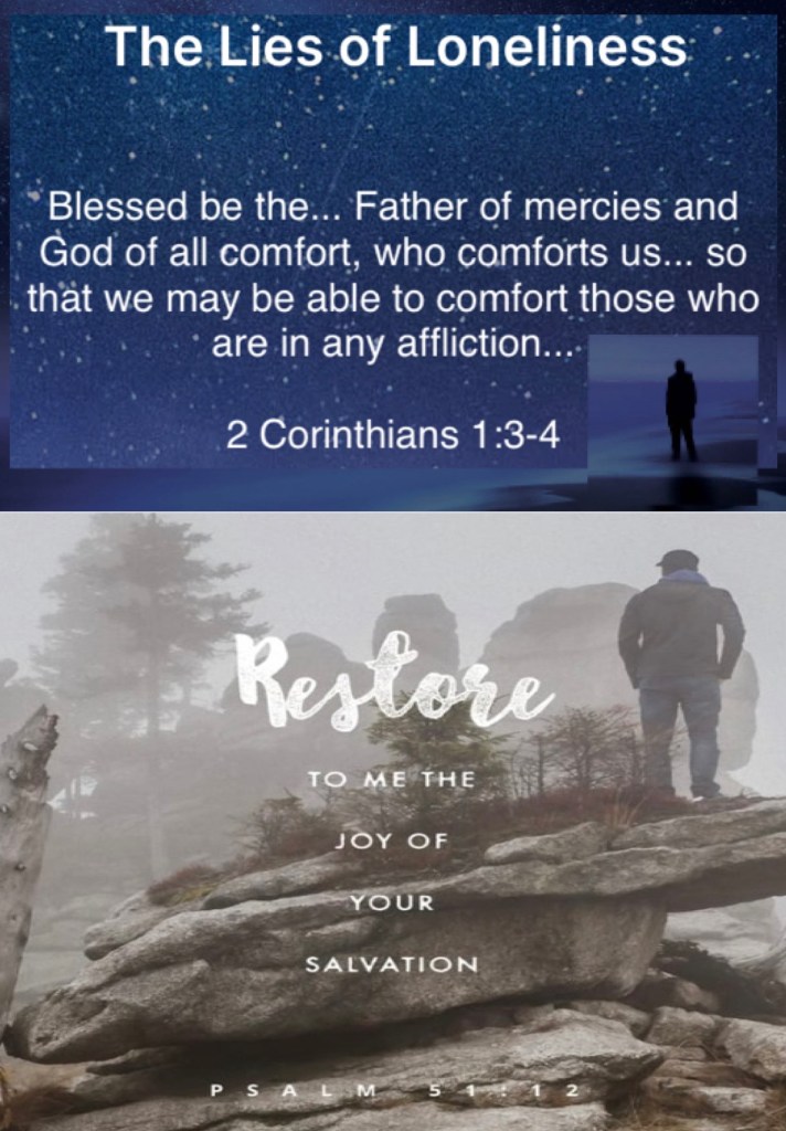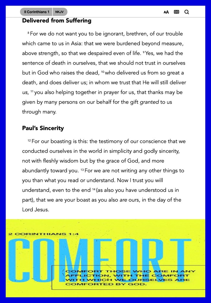 “Blessed be The God and Father of our Lord Jesus Christ, The Father of mercies and God of all comfort, who comforts us in all our tribulation, that we may be able to comfort those who are in any trouble, with the comfort with which we ourselves are comforted by God.” II Corinthians 1:3-4 “Do not cast me away from Your presence, And do not take Your Holy Spirit from me. Restore to me the joy of Your salvation, And uphold me by Your generous Spirit.” Psalms 51:11-12