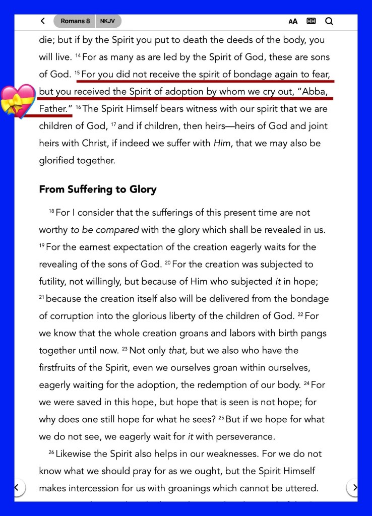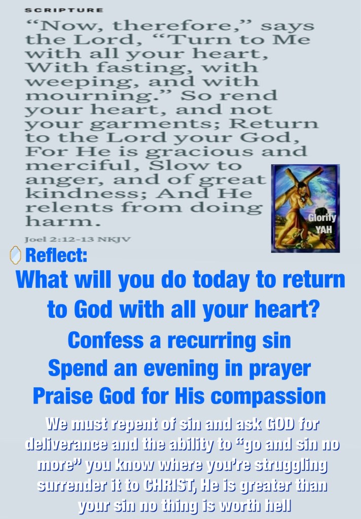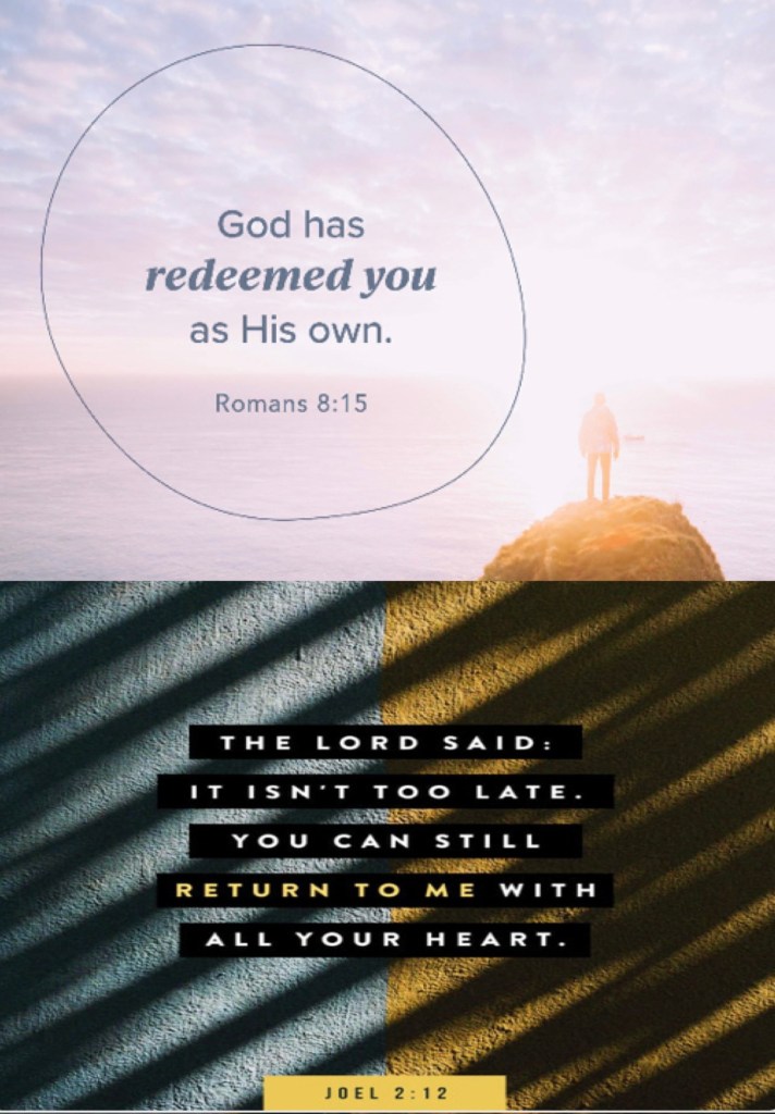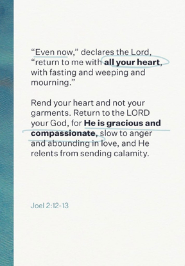 “For you did not receive the spirit of bondage again to fear, but you received the Spirit of adoption by whom we cry out, “Abba, Father.”” Romans 8:15 ““Now, therefore,” says the Lord, “Turn to Me with all your heart, With fasting, with weeping, and with mourning.” So rend your heart, and not your garments; Return to the Lord your God, For He is gracious and merciful, Slow to anger, and of great kindness; And He relents from doing harm.” Joel 2:12-13