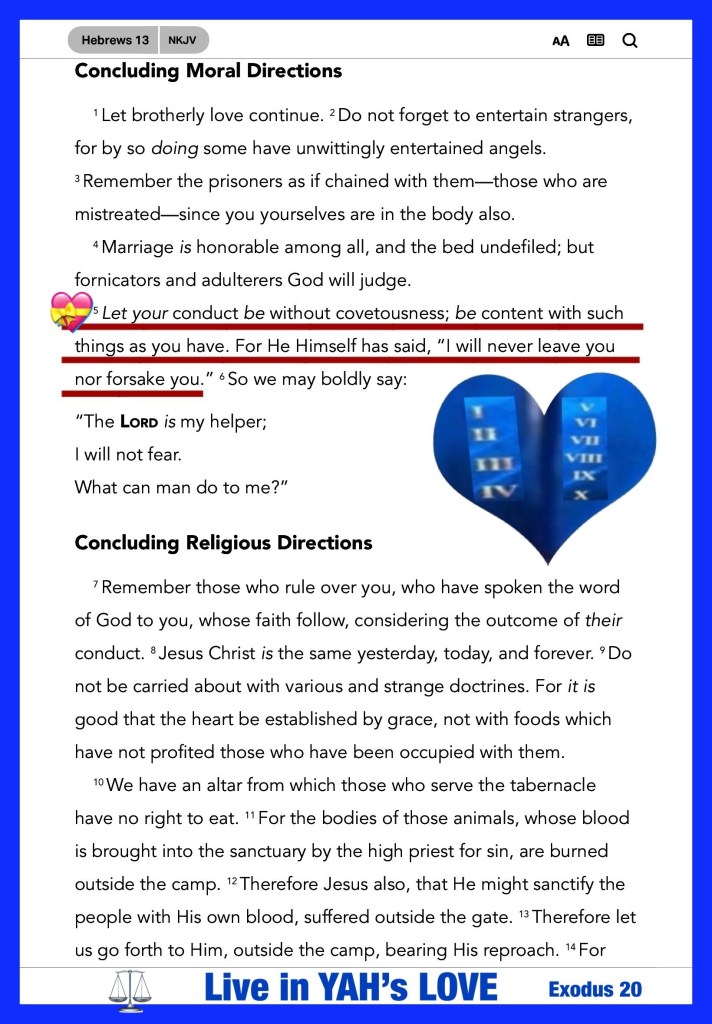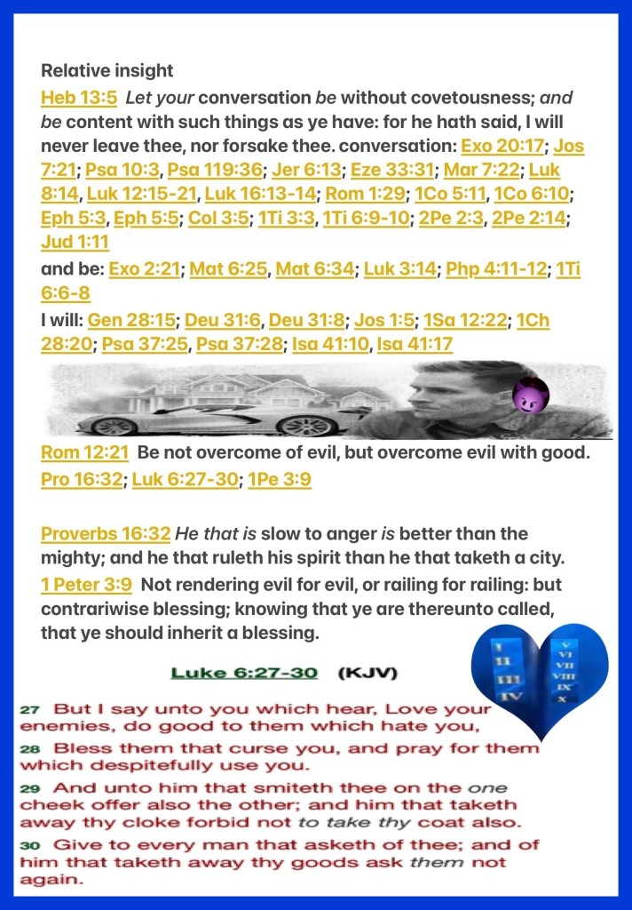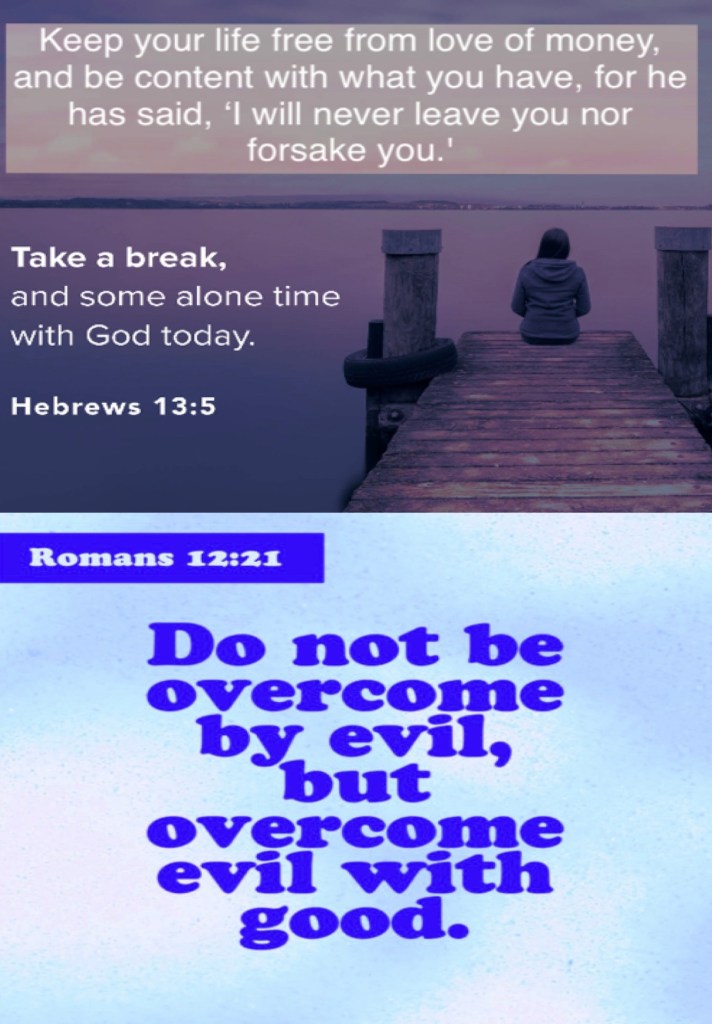 “Let your conduct be without covetousness; be content with such things as you have. For He Himself has said, “I will never leave you nor forsake you.”” Hebrews 13:5 “Do not be overcome by evil, but overcome evil with good.” Romans 12:21