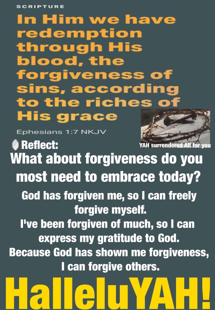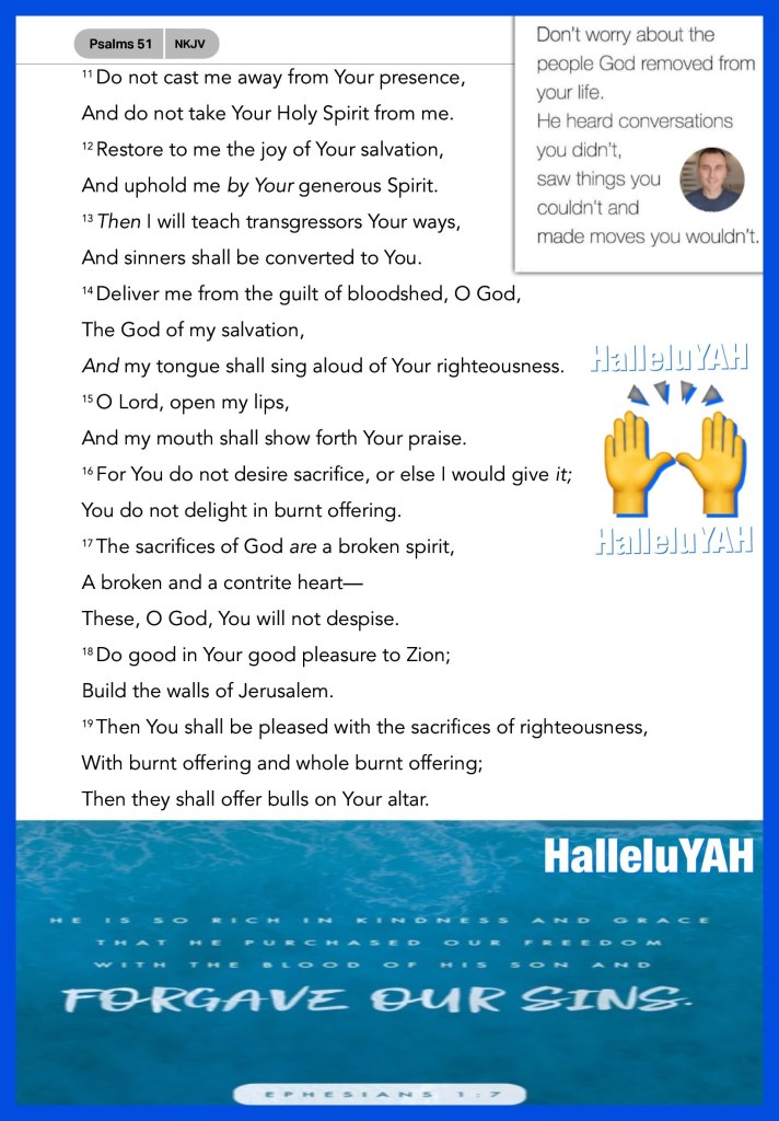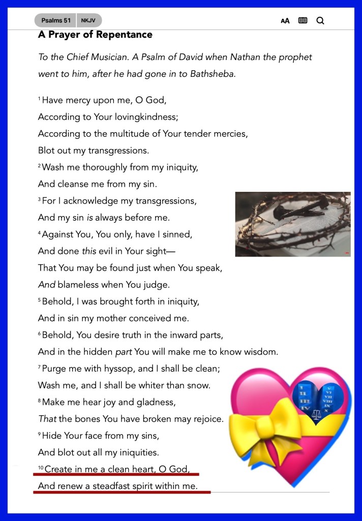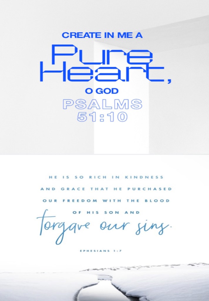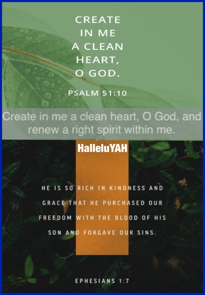 “Create in me a clean heart, O God, And renew a steadfast spirit within me.”Psalms 51:10 “In Him we have redemption through His blood, the forgiveness of sins, according to the riches of His grace” Ephesians 1:7