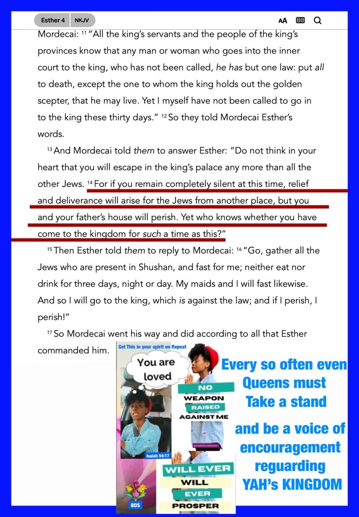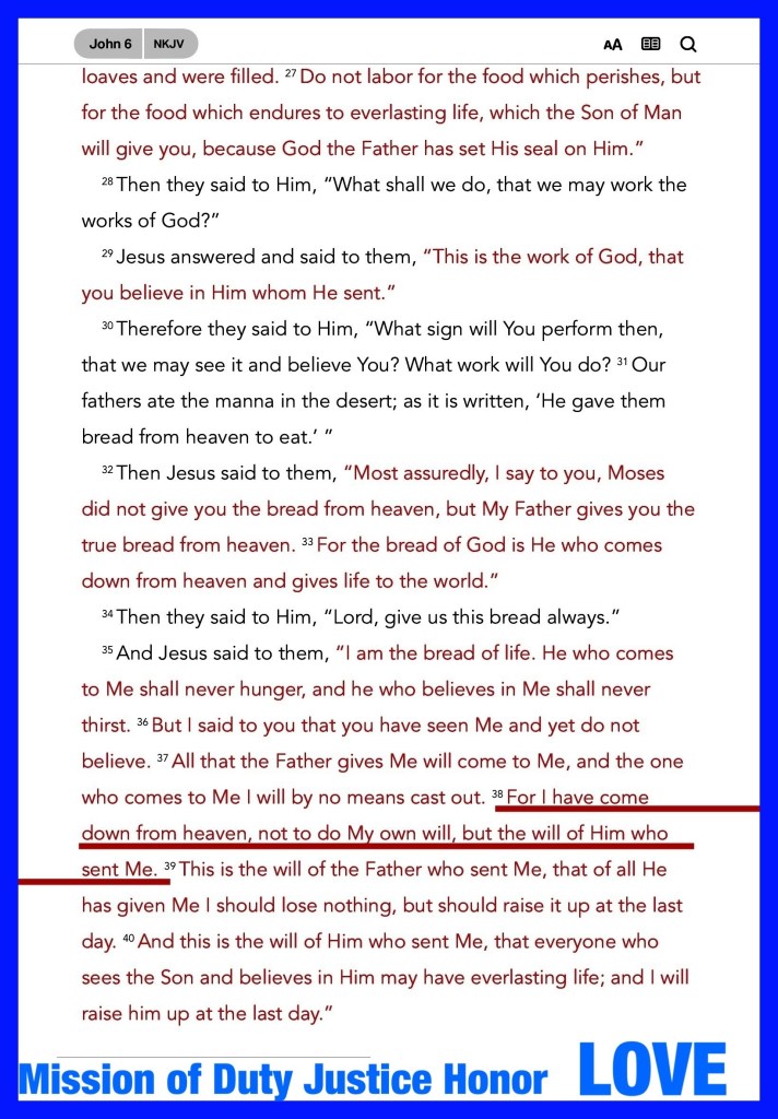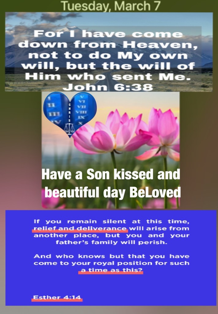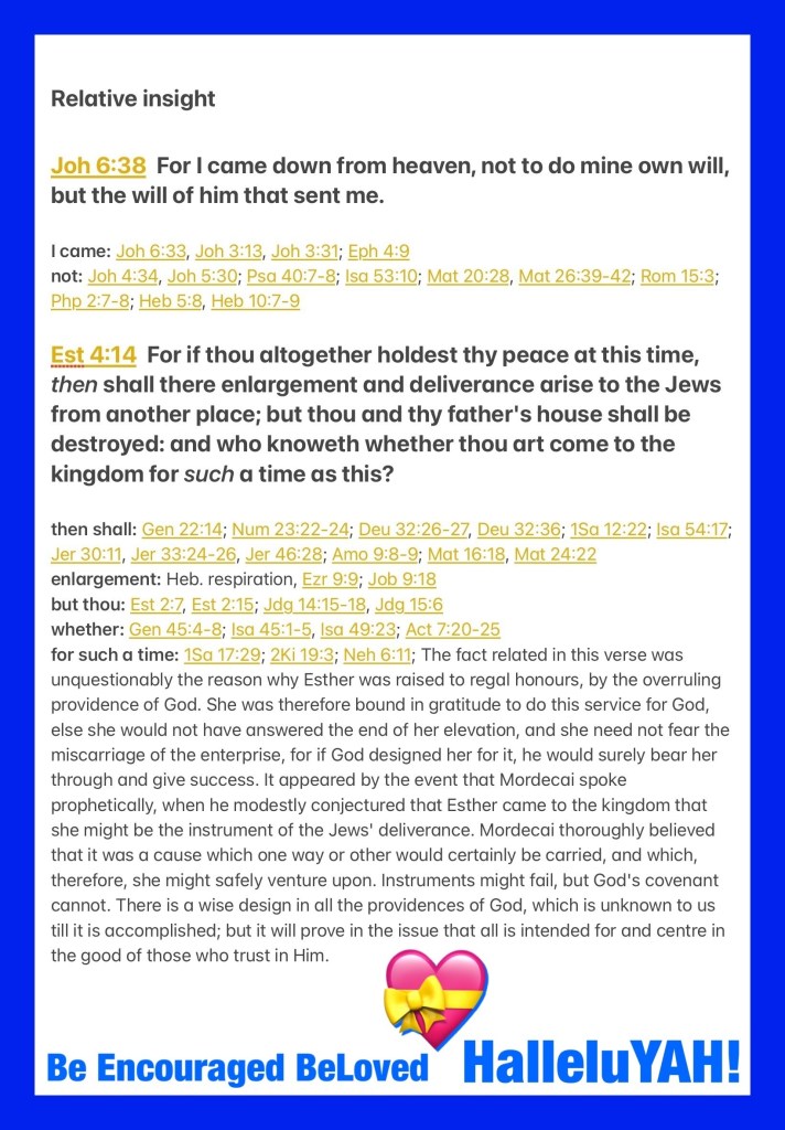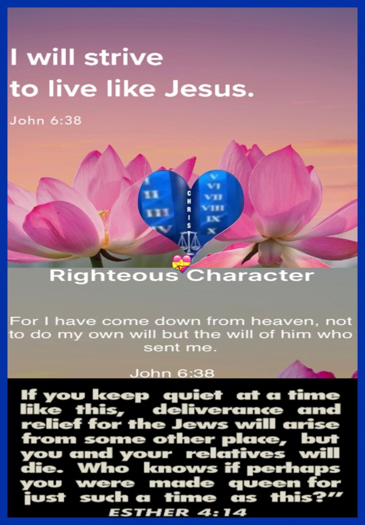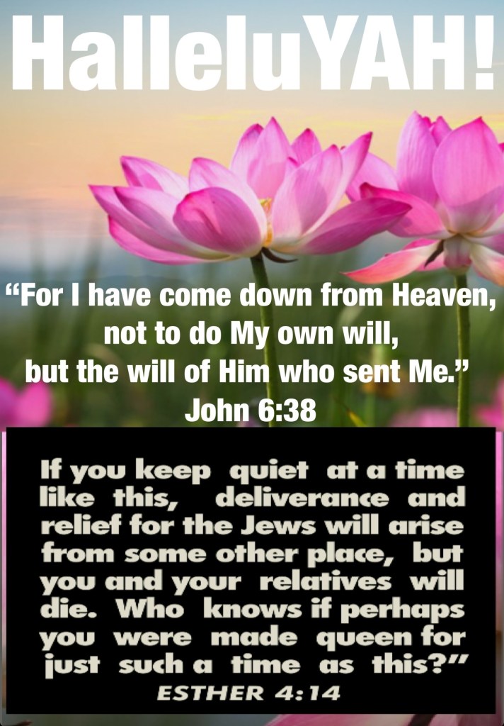 βFor I have come down from Heaven, not to do My own will, but the will of Him who sent Me.β John 6:38 βFor if you remain completely silent at this time, relief and deliverance will arise for the Jews from another place, but you and your fatherβs house will perish. Yet who knows whether you have come to the kingdom for such a time as this?ββ Esther 4:14