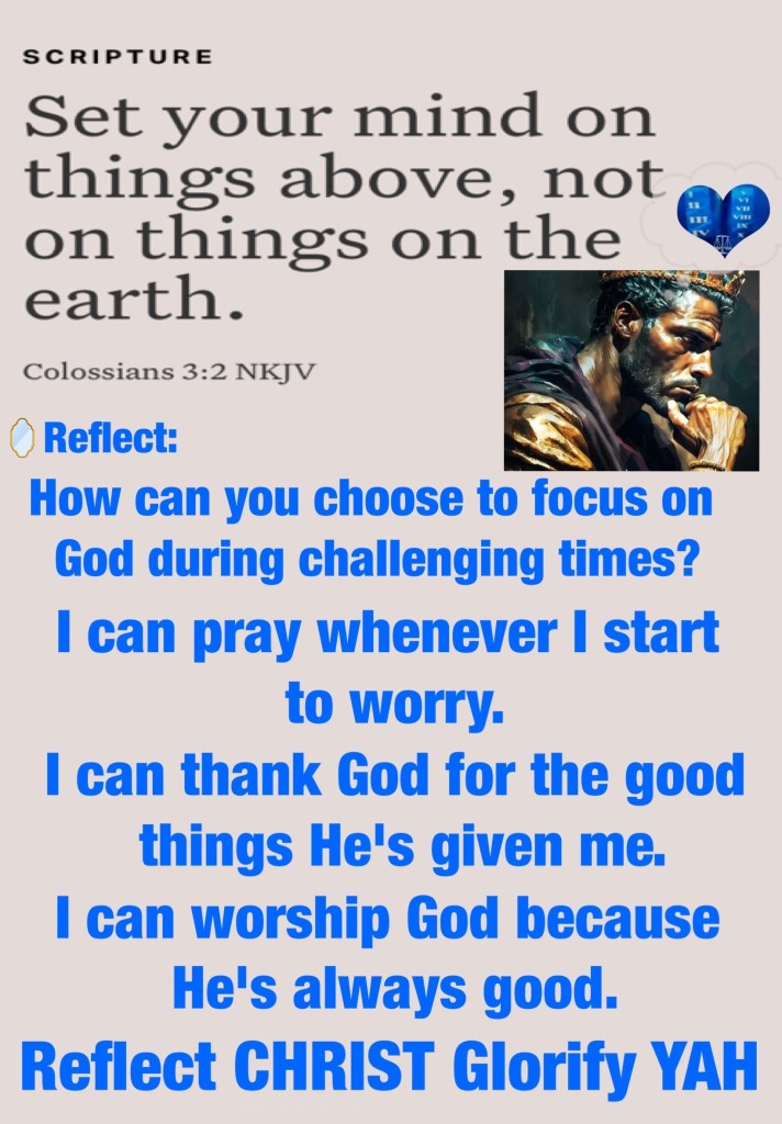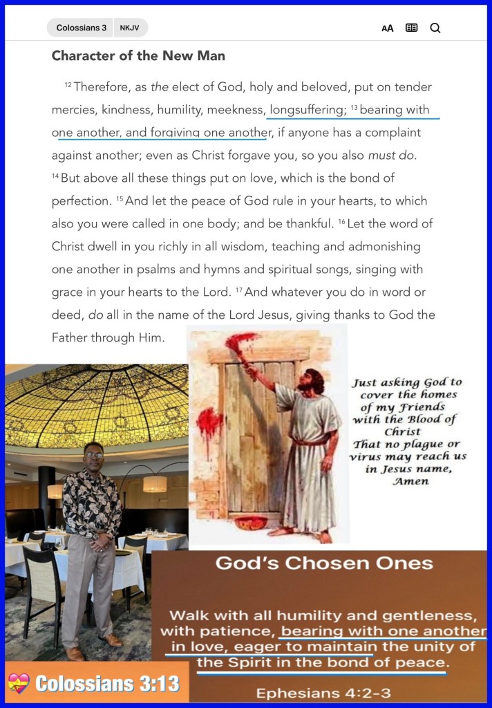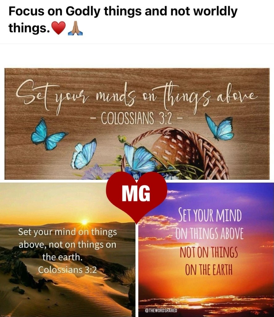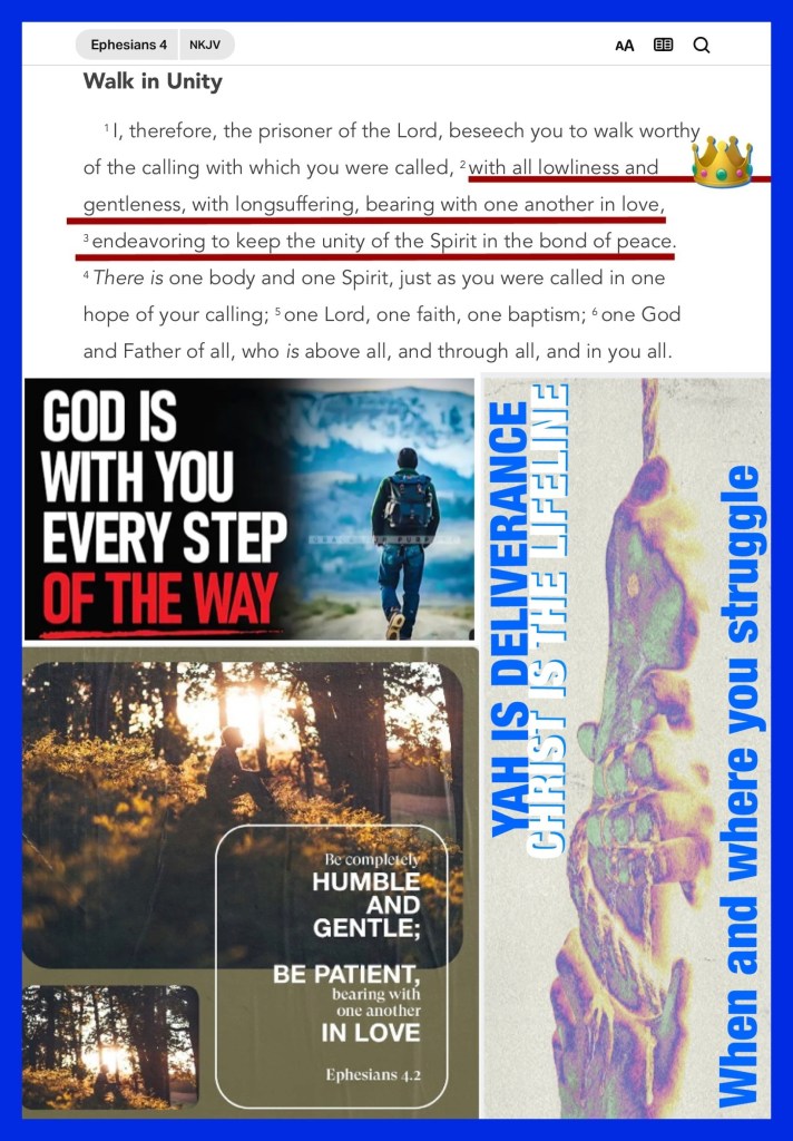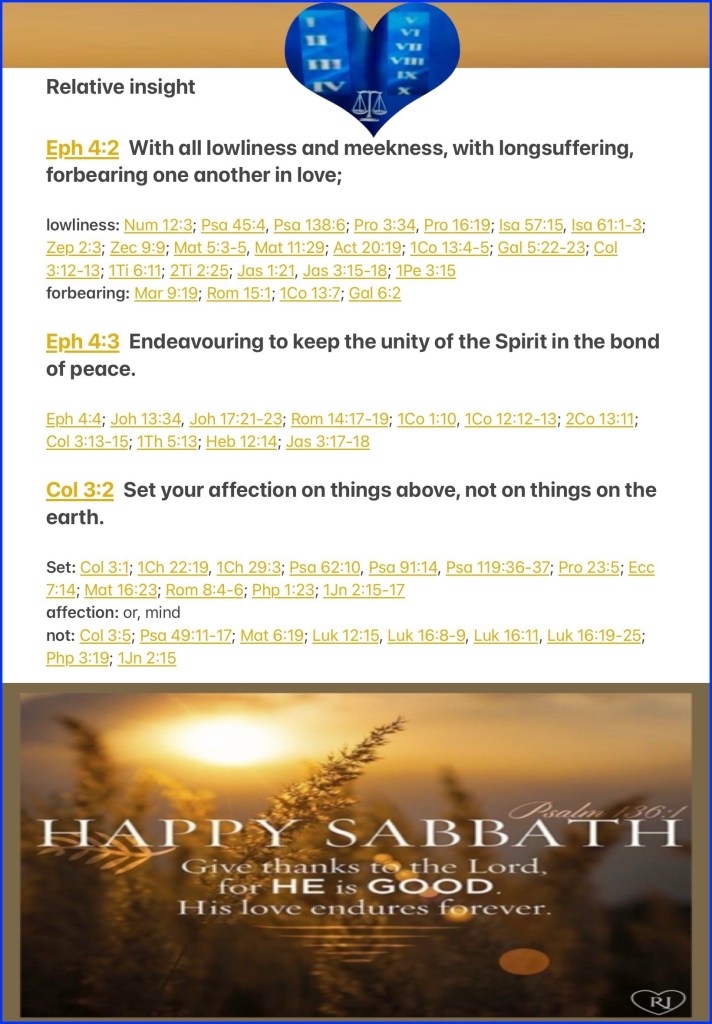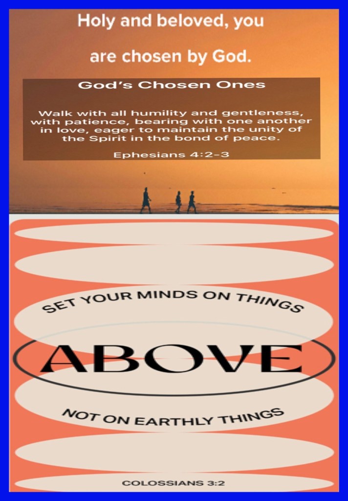 “with all lowliness and gentleness, with longsuffering, bearing with one another in love, endeavoring to keep the unity of The Spirit in the bond of peace.” Ephesians 4:2-3 “Set your mind on things above, not on things on the earth.” Colossians 3:2