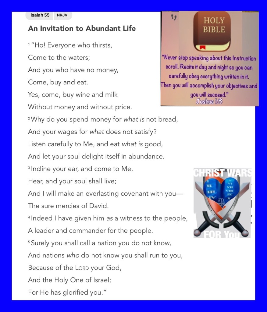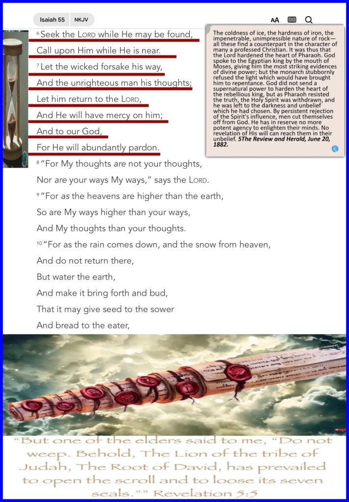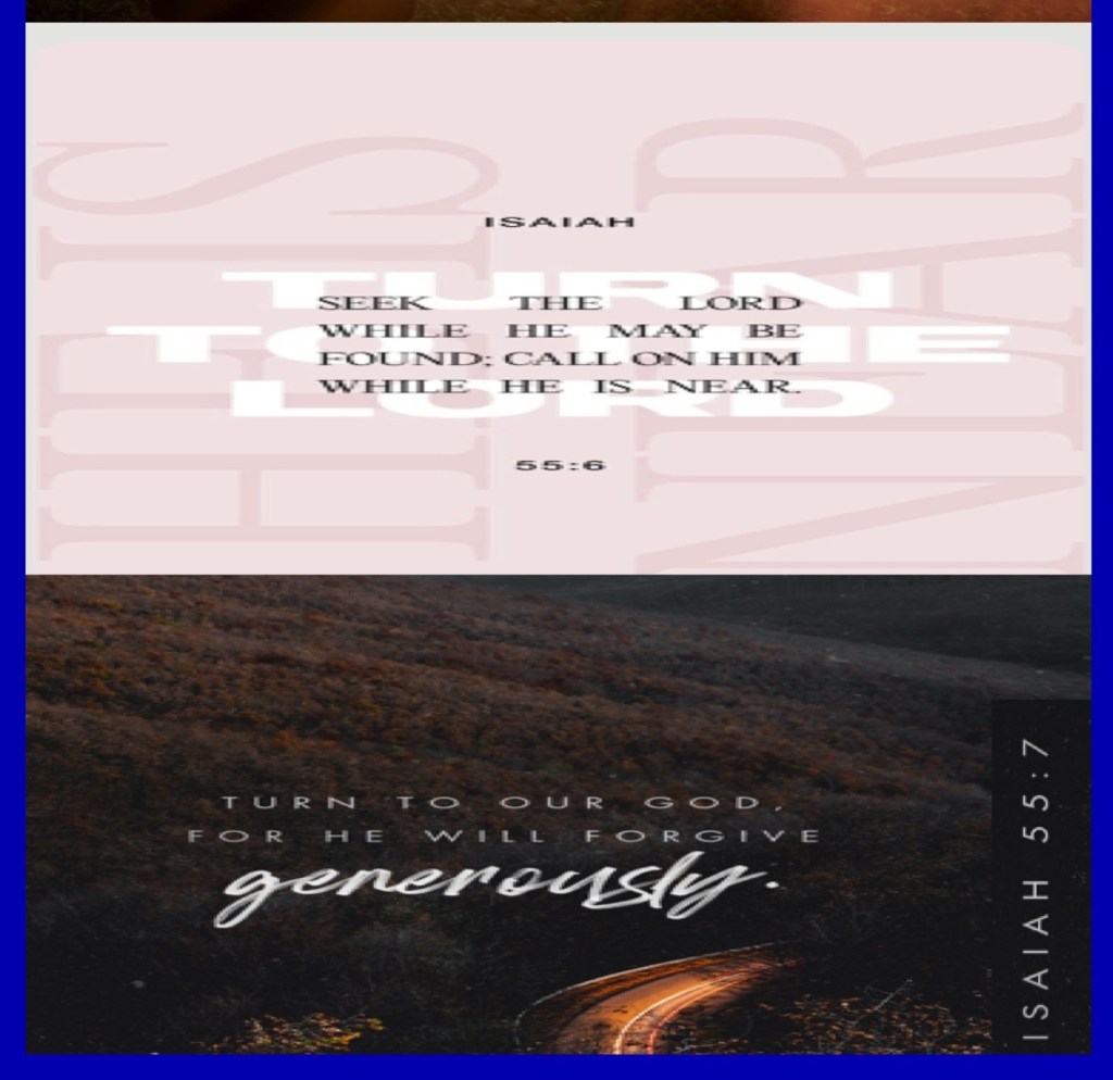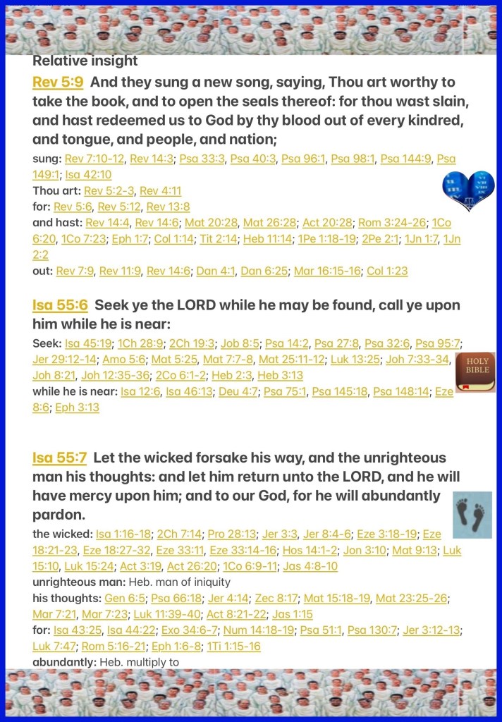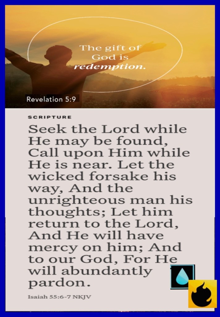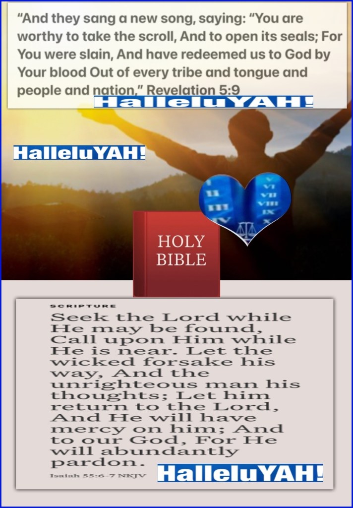 “And they sang a new song, saying: “You are worthy to take the scroll, And to open its seals; For You were slain, And have redeemed us to God by Your blood Out of every tribe and tongue and people and nation,” Revelation 5:9 “Seek The Lord while He may be found, Call upon Him while He is near. Let the wicked forsake his way, And the unrighteous man his thoughts; Let him return to The Lord, And He will have mercy on him; And to our God, For He will abundantly pardon.” Isaiah 55:6-7