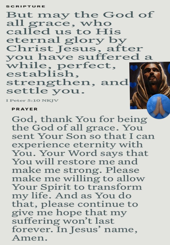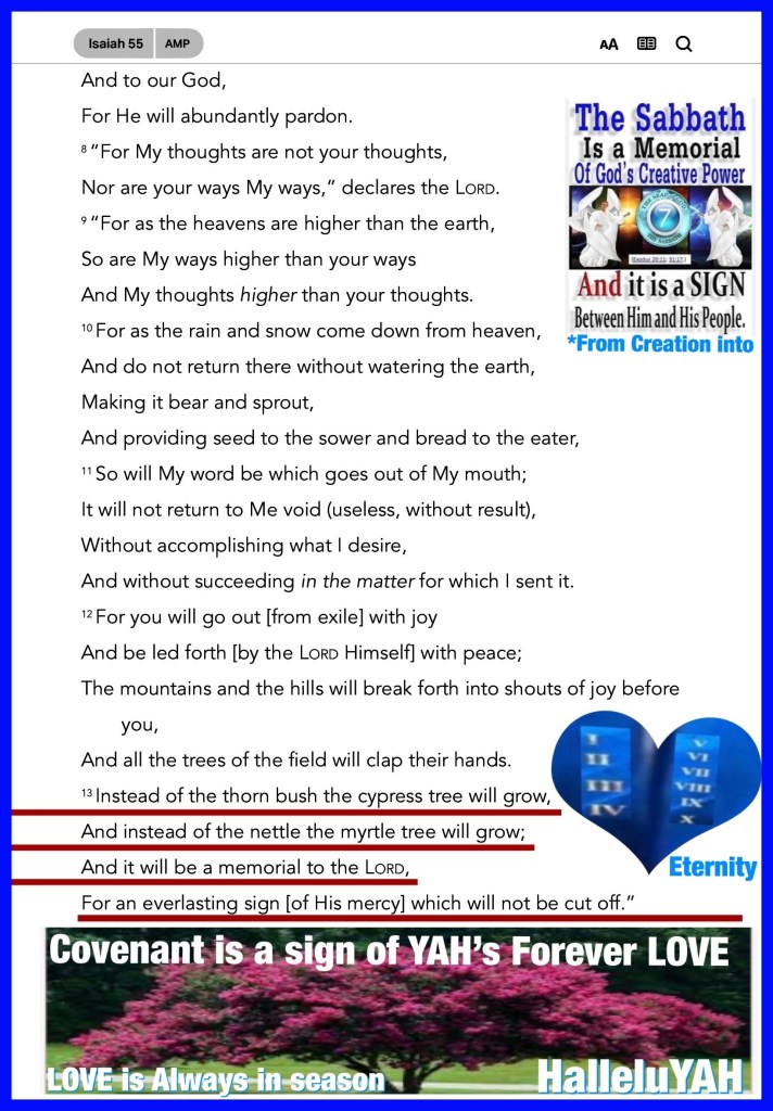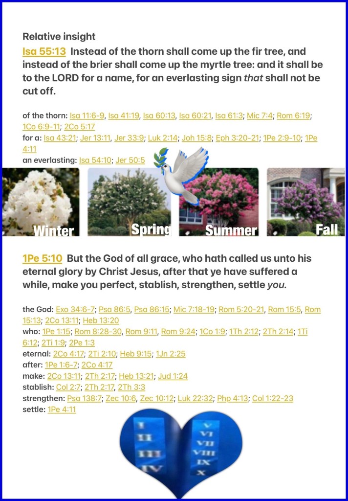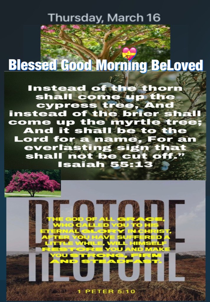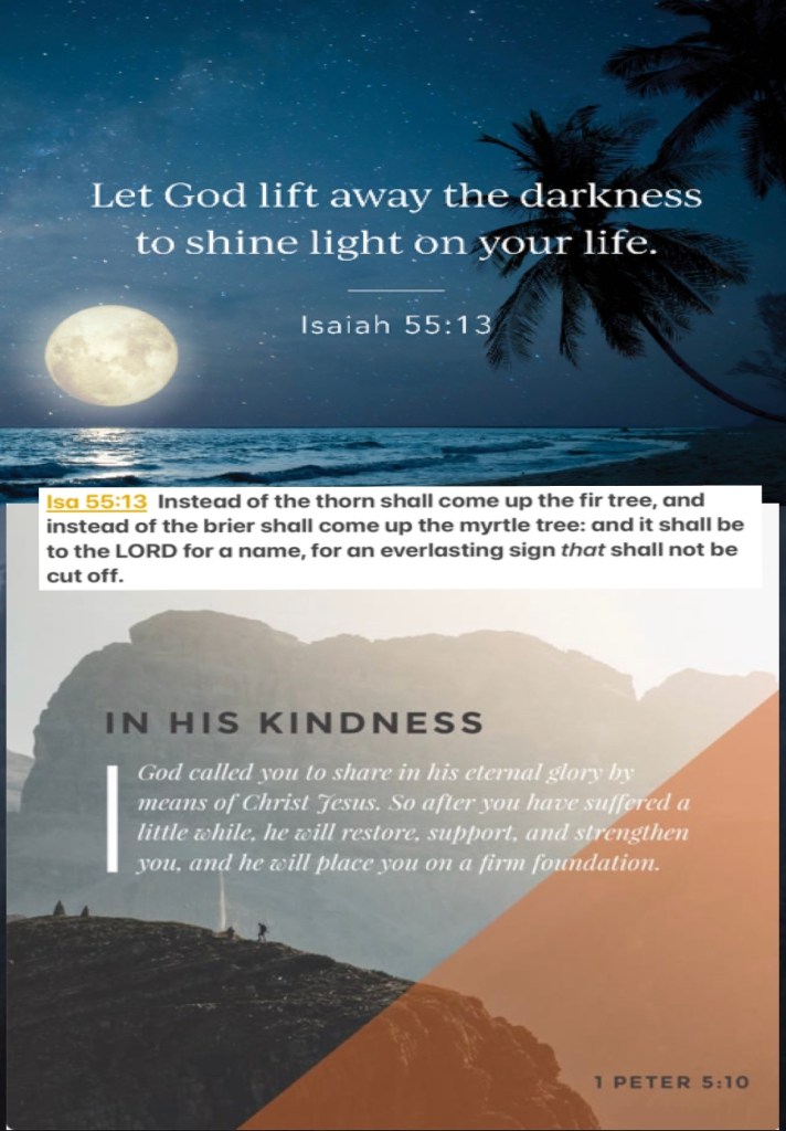 “Instead of the thorn shall come up the cypress tree, And instead of the brier shall come up the myrtle tree; And it shall be to The Lord for a name, For an everlasting sign that shall not be cut off.”” Isaiah 55:13 “But may the God of all grace, who called us to His eternal glory by Christ Jesus, after you have suffered a while, perfect, establish, strengthen, and settle you.” I Peter 5:10