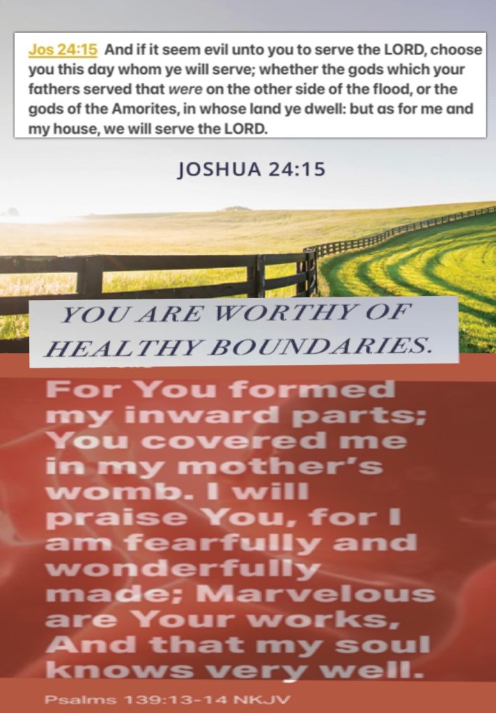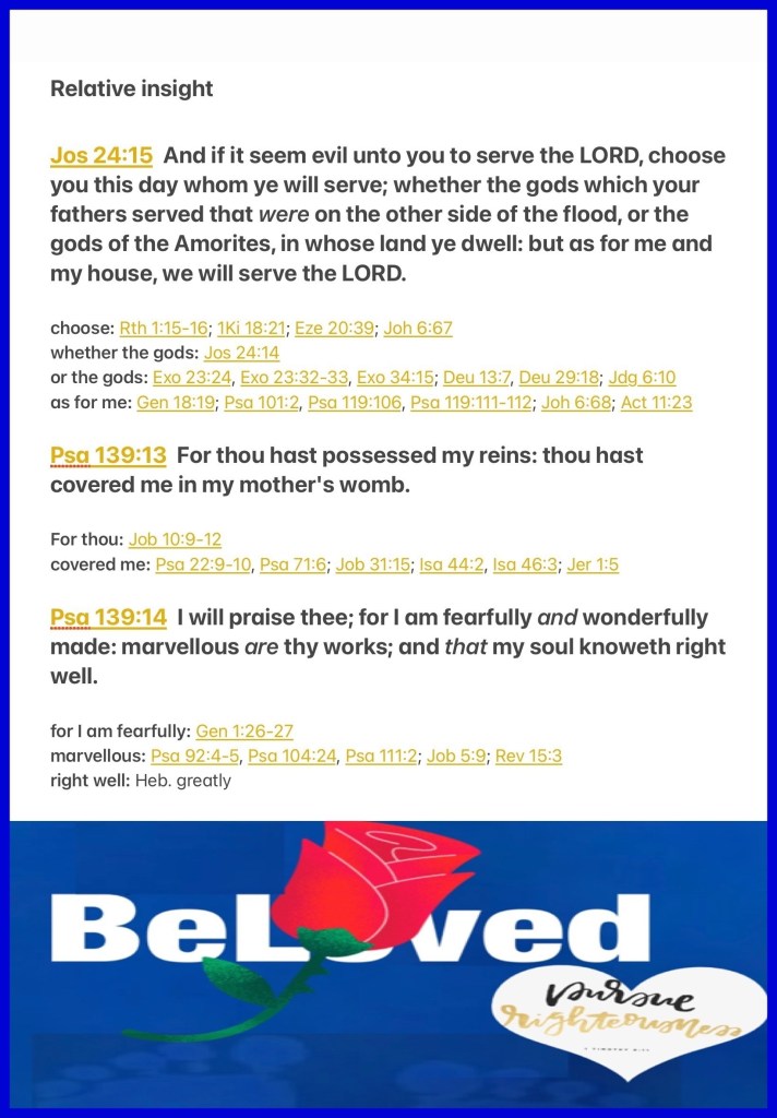 “And if it seems evil to you to serve The Lord, choose for yourselves this day whom you will serve, whether the gods which your fathers served that were on the other side of the River, or the gods of the Amorites, in whose land you dwell. But as for me and my house, we will serve The Lord.””Joshua 24:15 “For You formed my inward parts; You covered me in my mother’s womb. I will praise You, for I am fearfully and wonderfully made; Marvelous are Your works, And that my soul knows very well.” Psalms 139:13-14