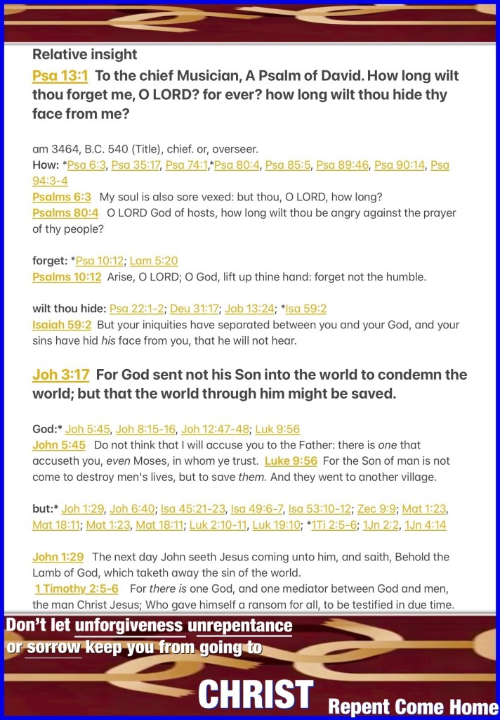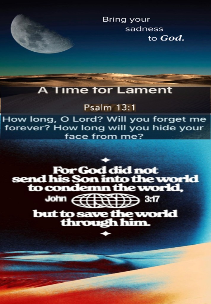 “How long, O Lord? Will You forget me forever? How long will You hide Your face from me?” Psalms 13:1 “For God did not send His Son into the world to condemn the world, but that the world through Him might be saved.” John 3:17