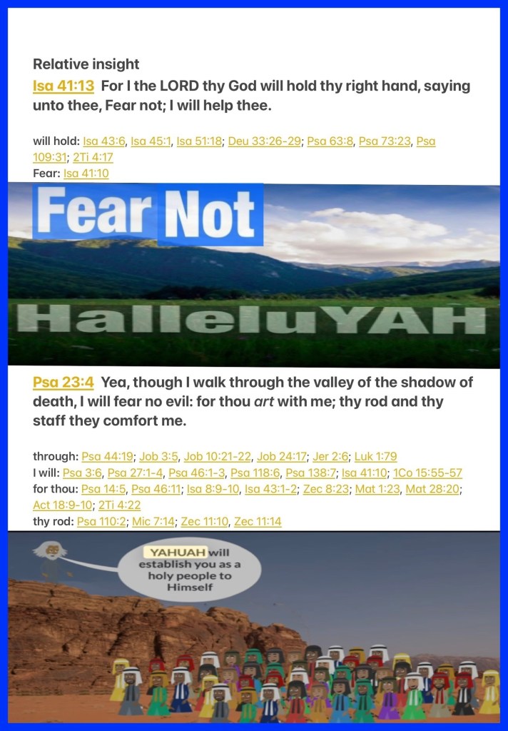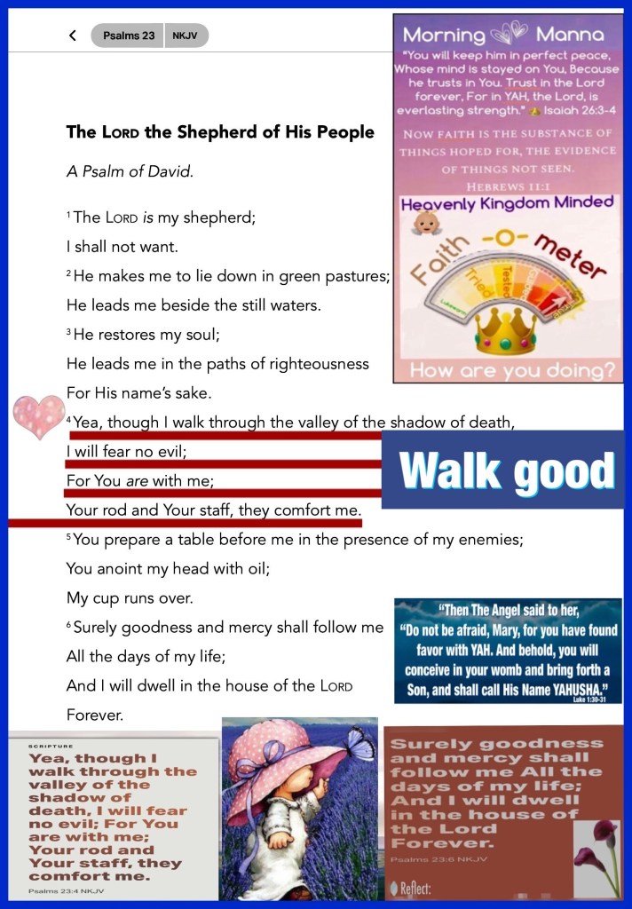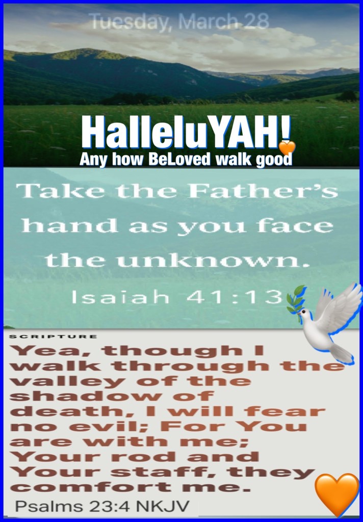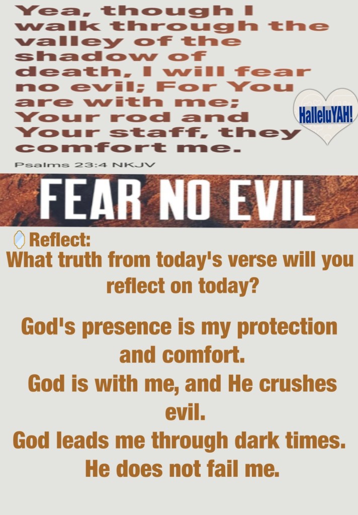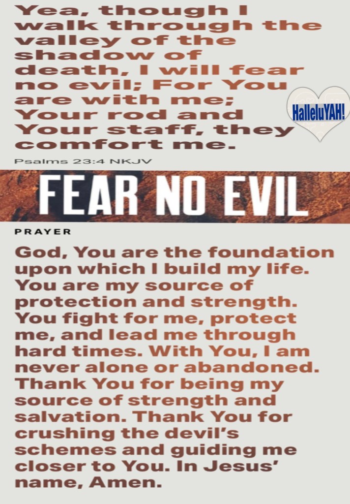 “For I, The Lord your God, will hold your right hand, Saying to you, ‘Fear not, I will help you.’” Isaiah 41:13 “Yea, though I walk through the valley of the shadow of death, I will fear no evil; For You are with me; Your rod and Your staff, they comfort me.” Psalms 23:4