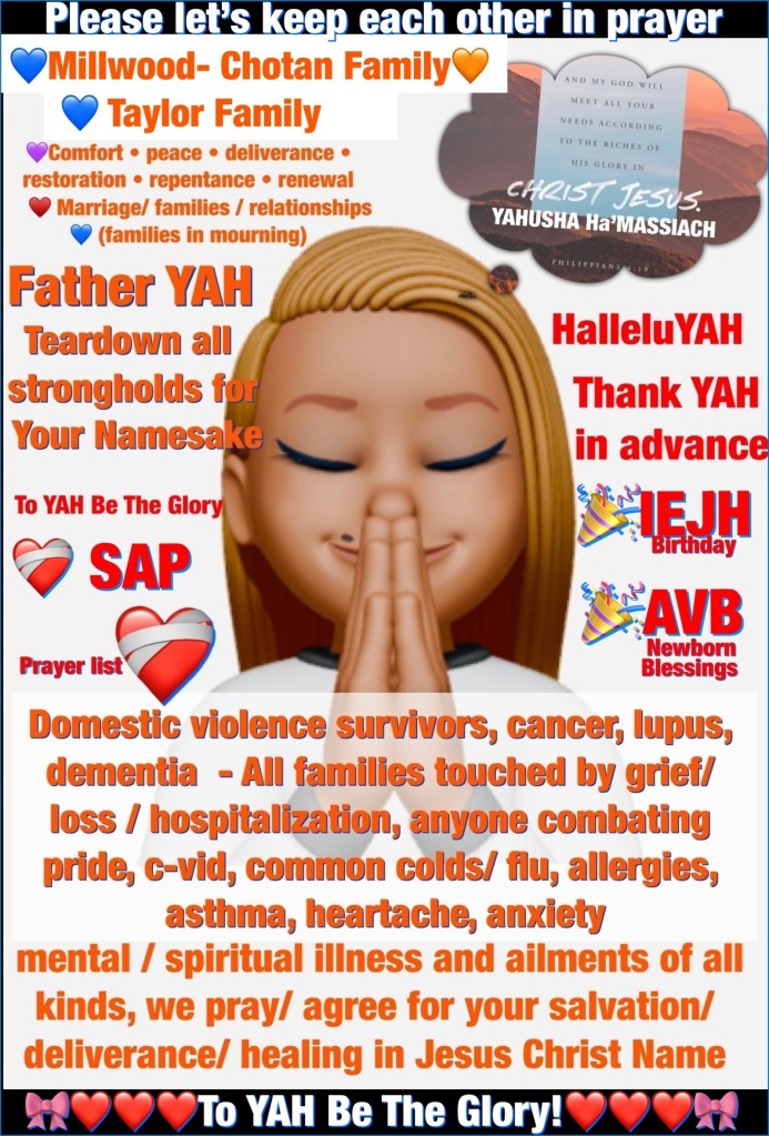 BeLoved Be a Part of YAH’s Holy Spirit Led Prayer Warrior Network. Pray for those taking the steps towards CHRIST, some may change but still require stronger light, Pray for discipline, discernment, wisdom and the strength to keep clean, Pray for the hurting and those suffering spiritual violence, Pray and help someone Cross the gulf of fear, _________, death Run into The Arms of CHRIST: YAHUSHA HA’MASSIACH our Savior Who takes away the sins of the whole world.