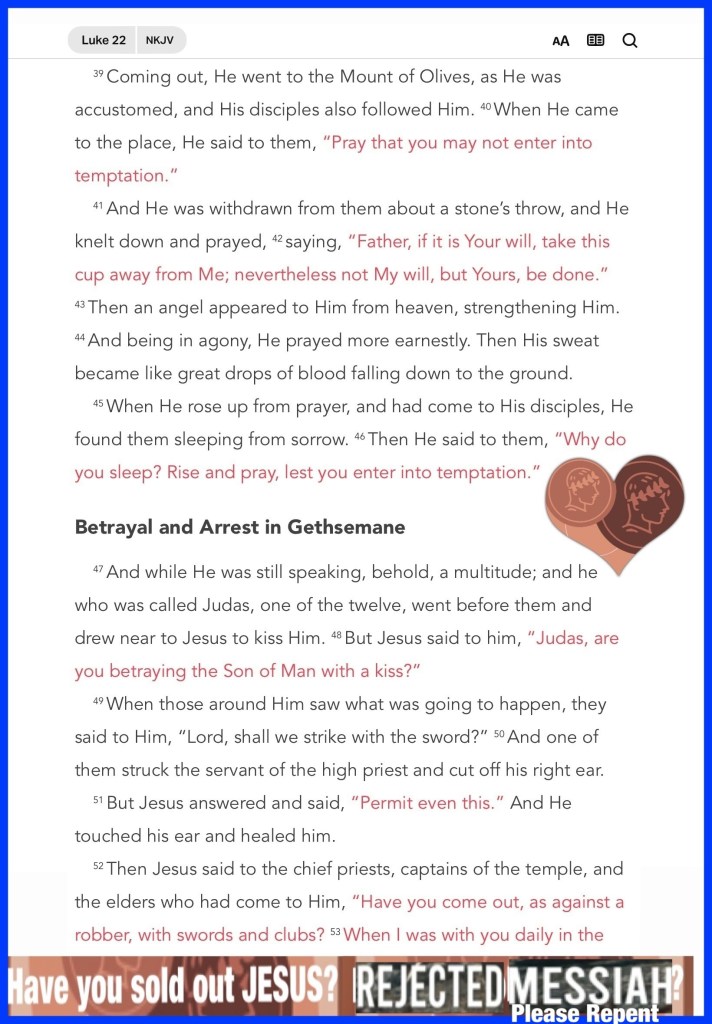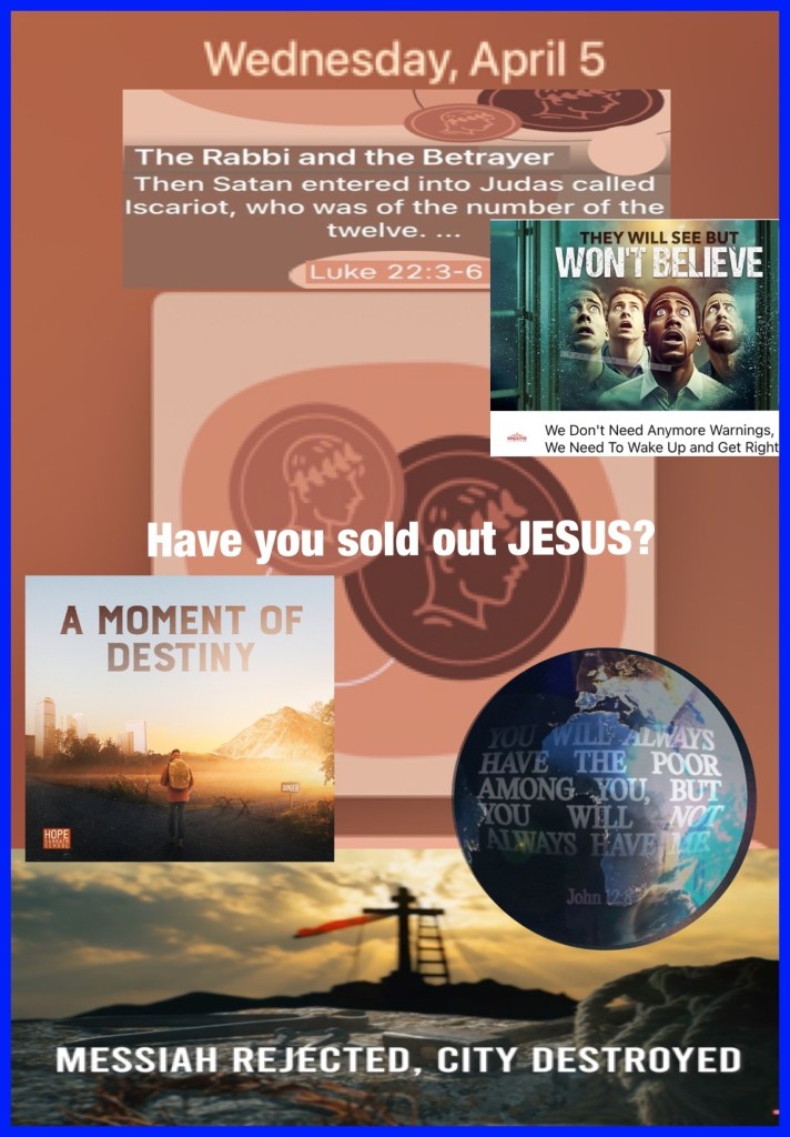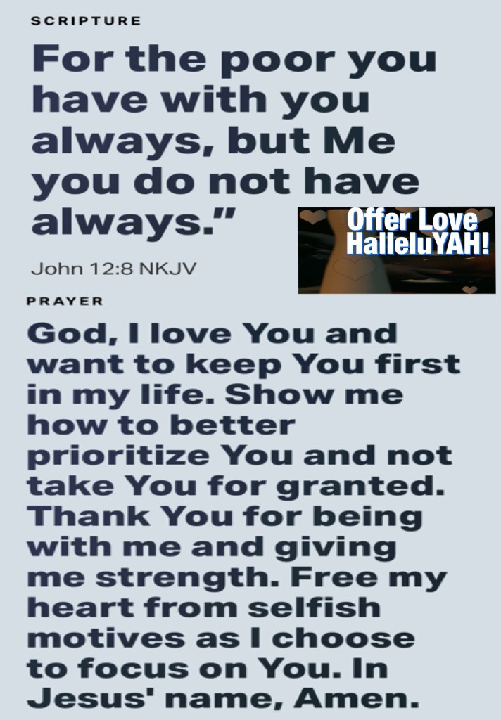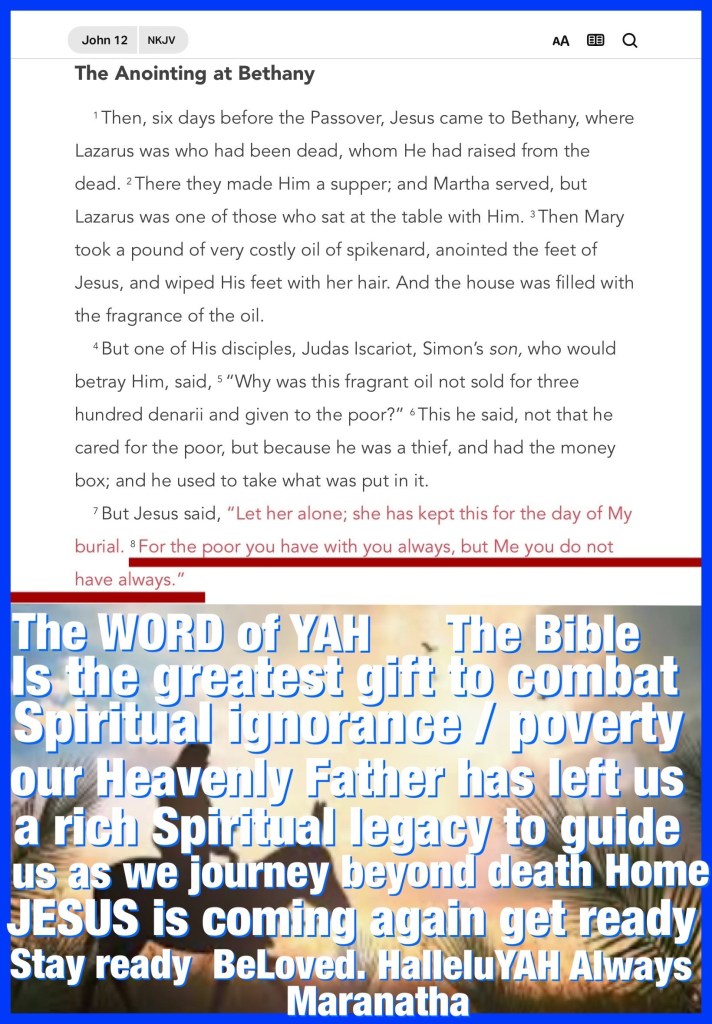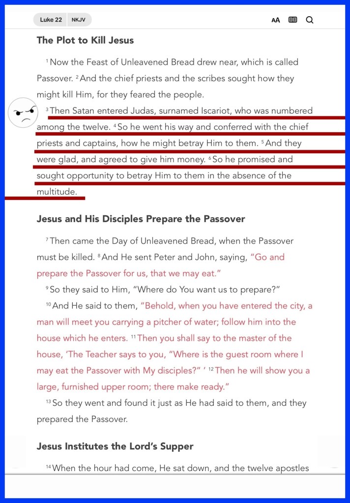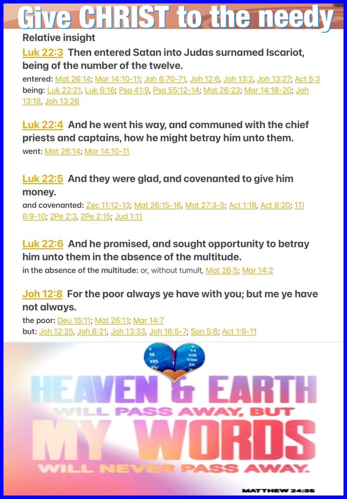 “Then Satan entered Judas, surnamed Iscariot, who was numbered among the twelve. So he went his way and conferred with the chief priests and captains, how he might betray Him to them. And they were glad, and agreed to give him money. So he promised and sought opportunity to betray Him to them in the absence of the multitude.” Luke 22:3-6 “For the poor you have with you always, but Me you do not have always.”” John 12:8