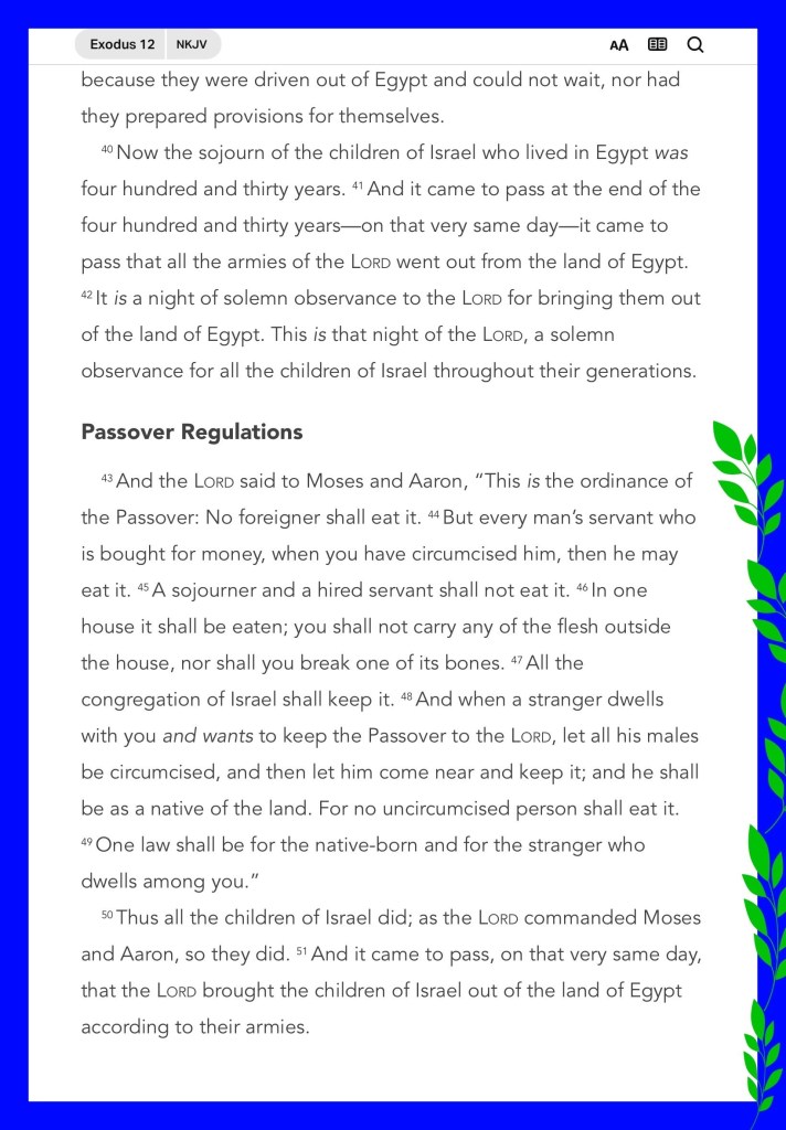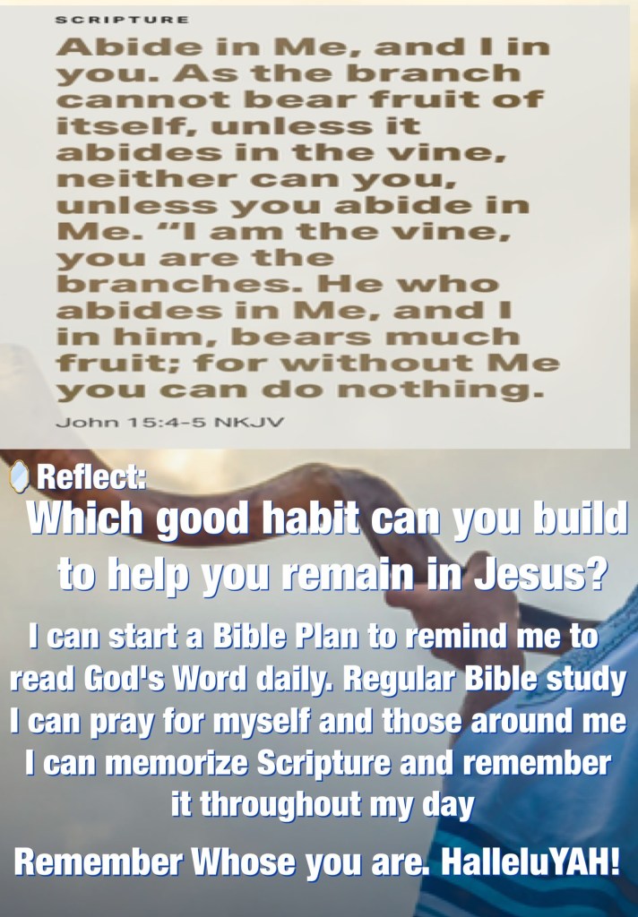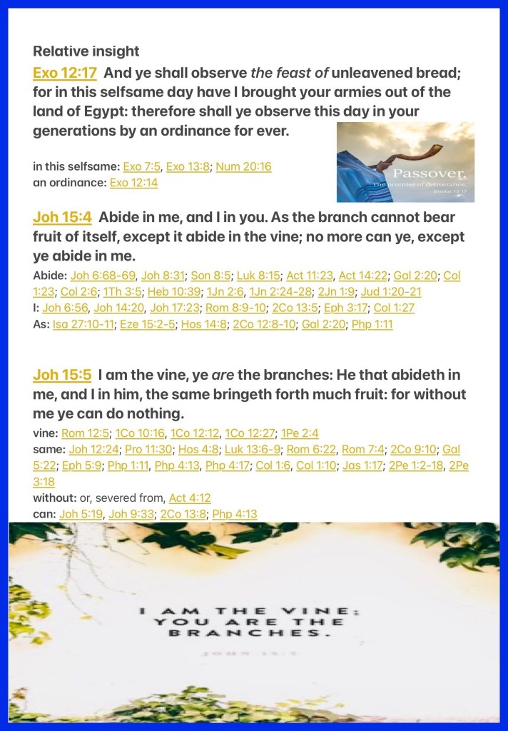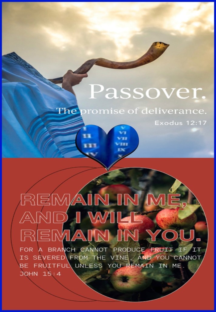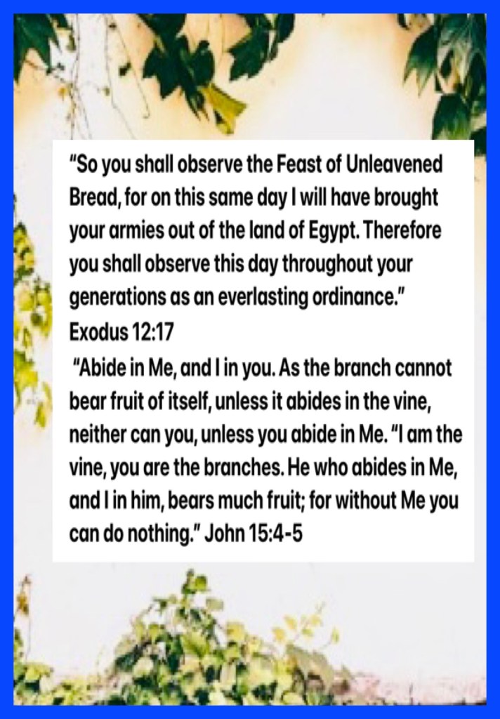 “So you shall observe the Feast of Unleavened Bread, for on this same day I will have brought your armies out of the land of Egypt. Therefore you shall observe this day throughout your generations as an everlasting ordinance.”Exodus 12:17 “Abide in Me, and I in you. As the branch cannot bear fruit of itself, unless it abides in the vine, neither can you, unless you abide in Me. “I am the vine, you are the branches. He who abides in Me, and I in him, bears much fruit; for without Me you can do nothing.” John 15:4-5