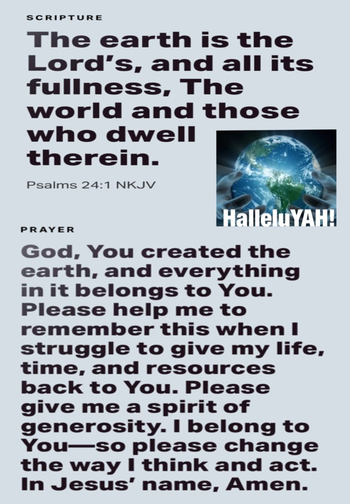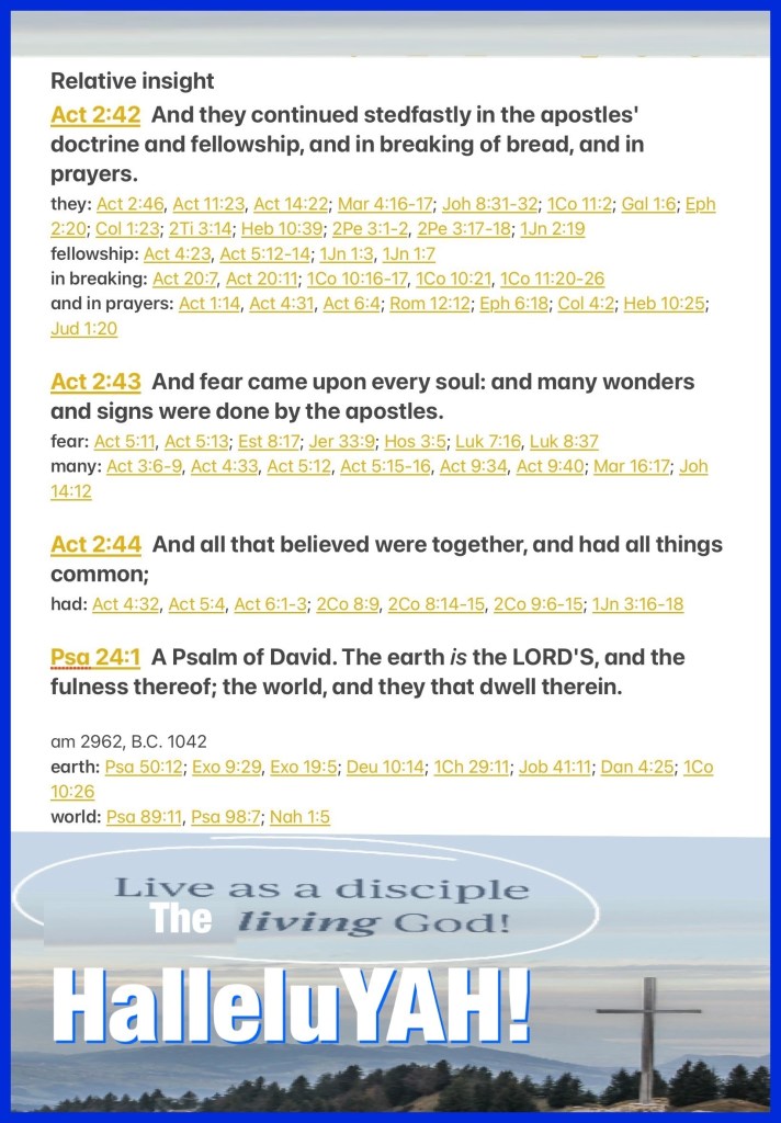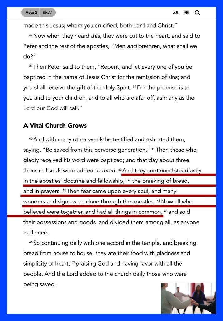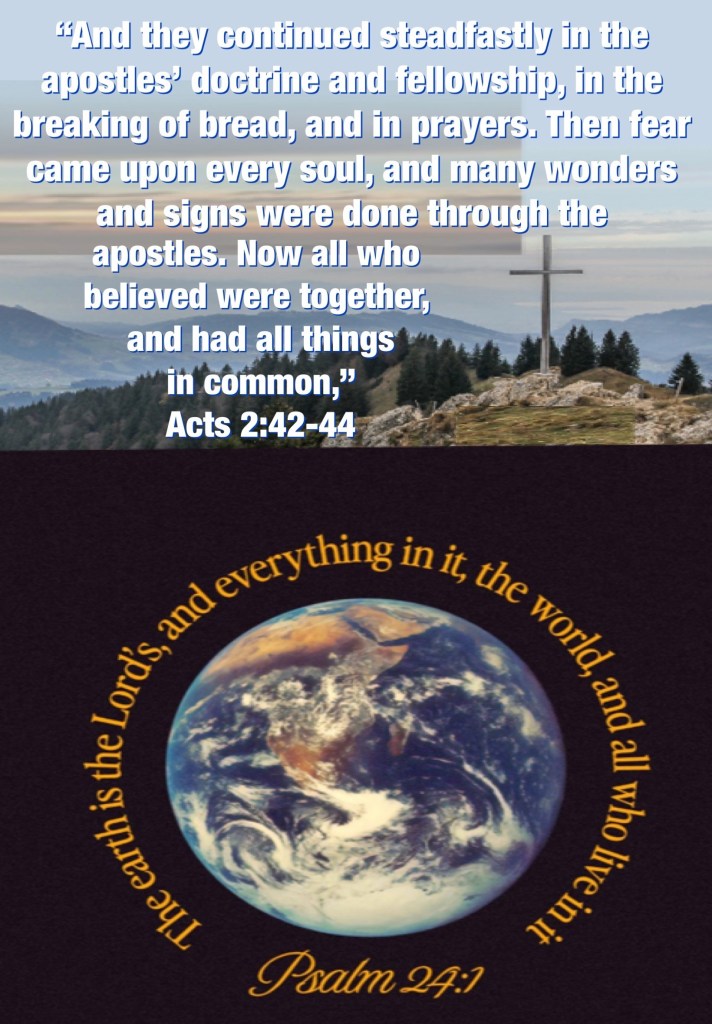 βAnd they continued steadfastly in the apostlesβ doctrine and fellowship, in the breaking of bread, and in prayers. Then fear came upon every soul, and many wonders and signs were done through the apostles. Now all who believed were together, and had all things in common,β Acts 2:42-44 βThe earth is The Lordβs, and all its fullness, The world and those who dwell therein.β Psalms 24:1