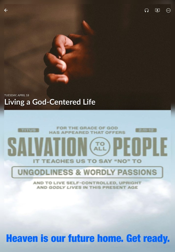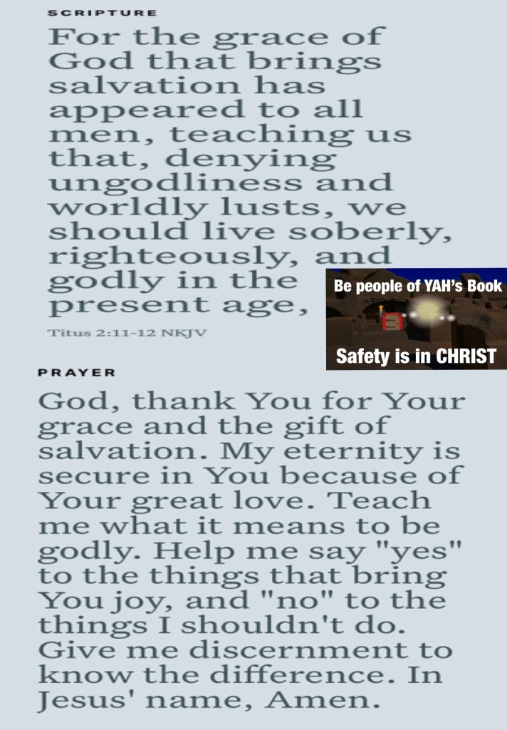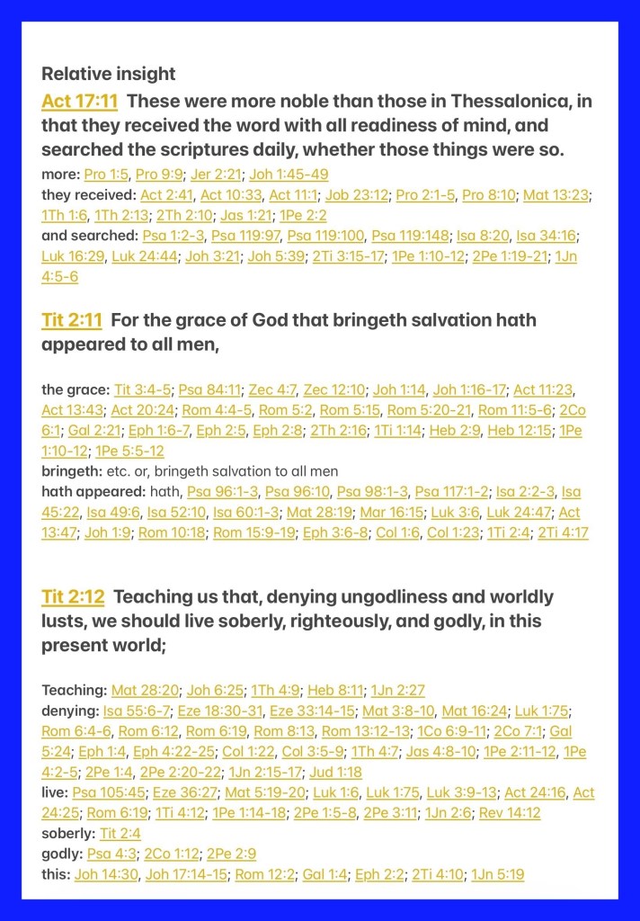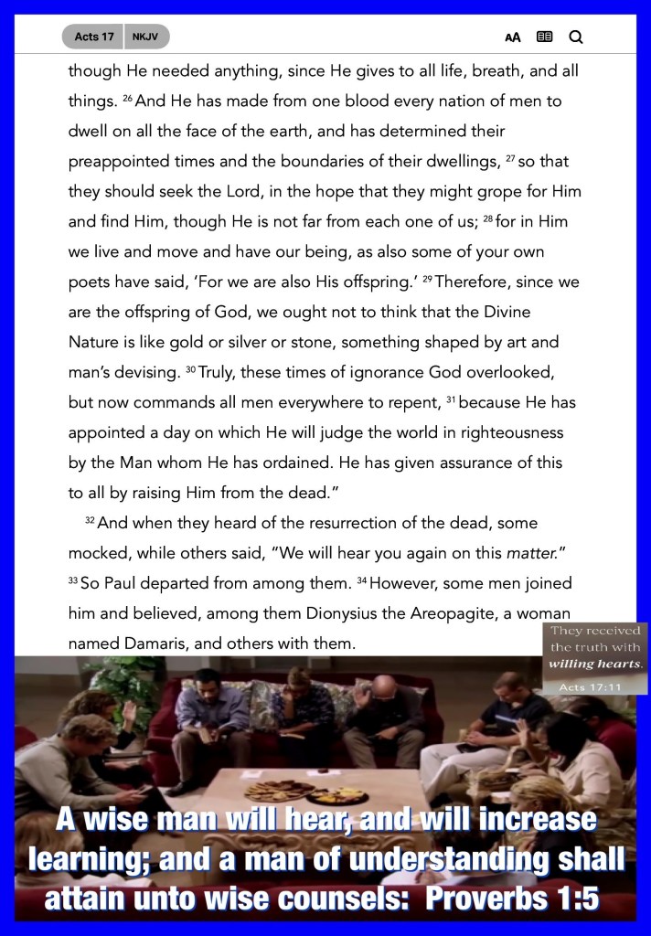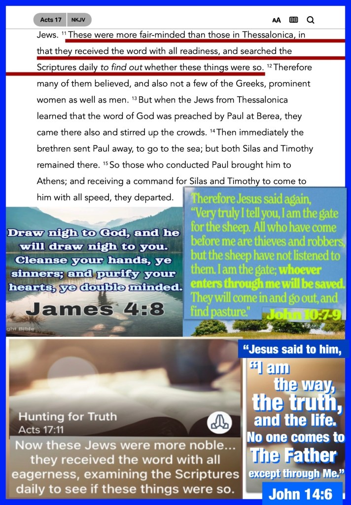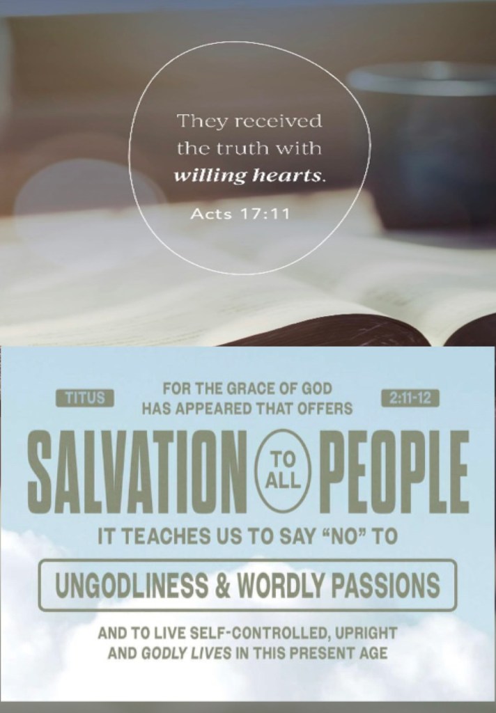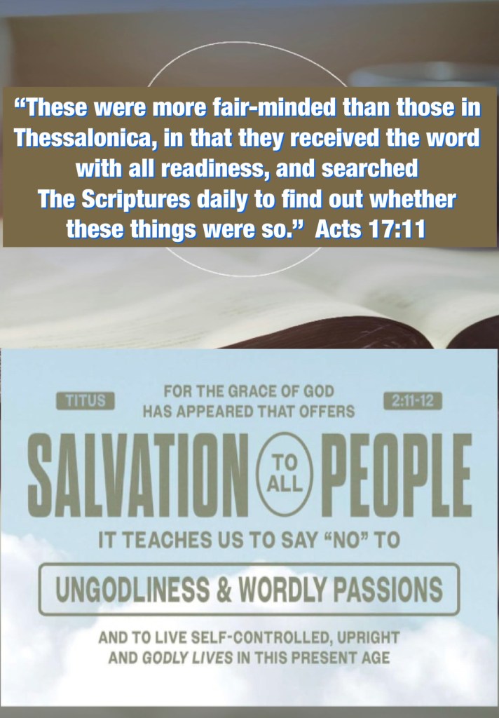 “These were more fair-minded than those in Thessalonica, in that they received the word with all readiness, and searched the Scriptures daily to find out whether these things were so.” Acts 17:11 “For the grace of God that brings salvation has appeared to all men, teaching us that, denying ungodliness and worldly lusts, we should live soberly, righteously, and godly in the present age,” Titus 2:11-12
