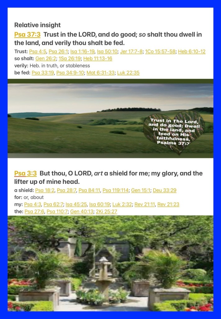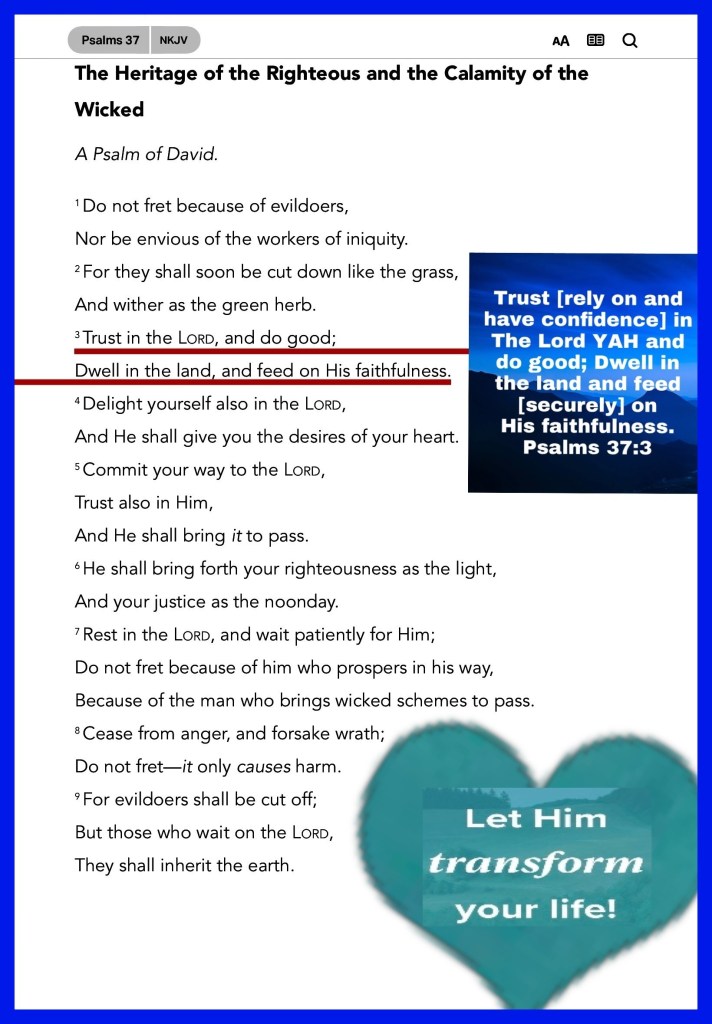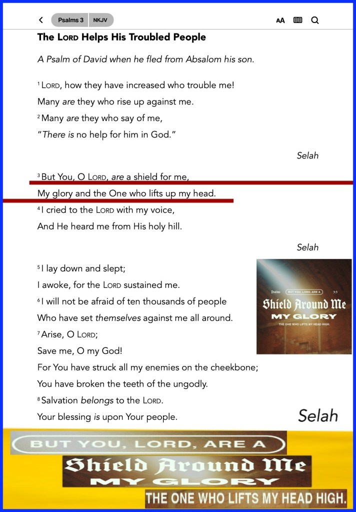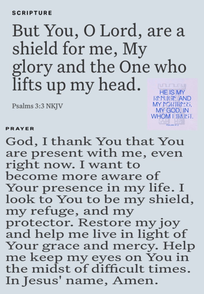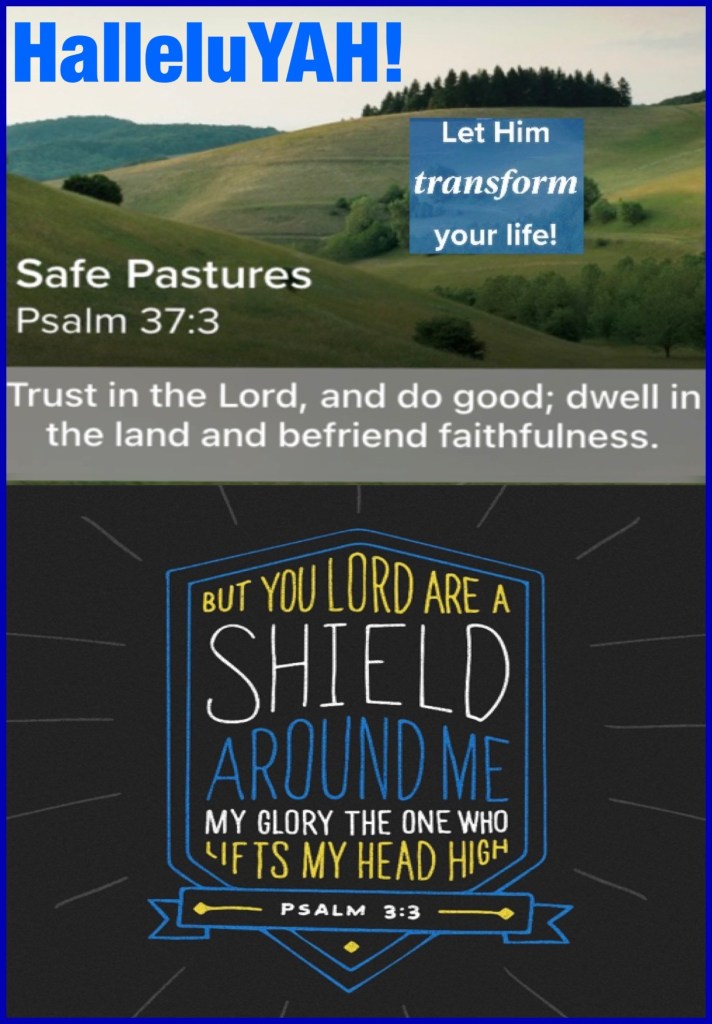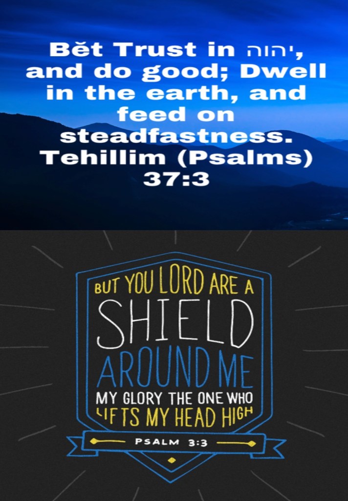 “Trust in The Lord, and do good; Dwell in the land, and feed on His faithfulness.”Psalms 37:3 “But You, O Lord, are a shield for me, My glory and The One who lifts up my head.” Psalms 3:3