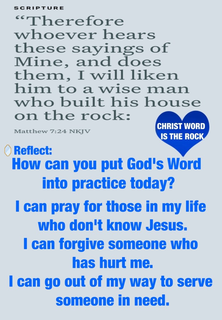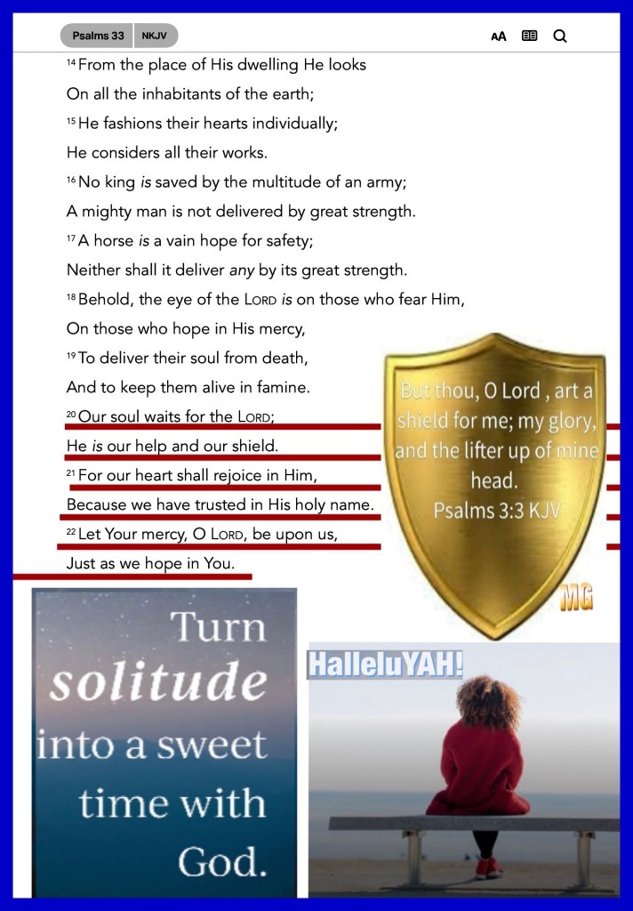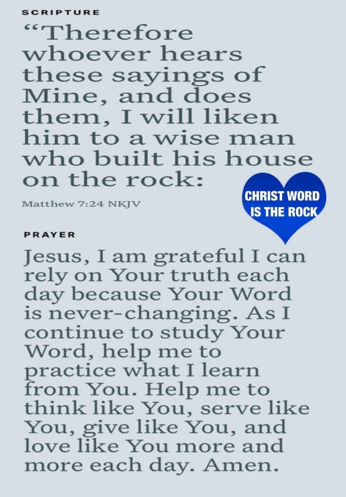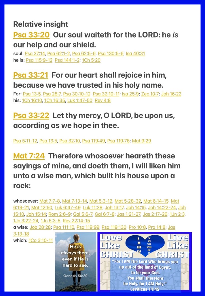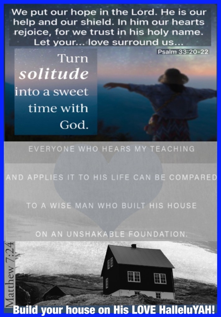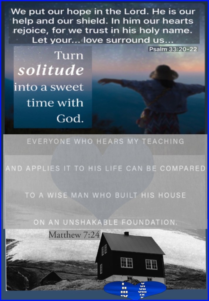 “Our soul waits for The Lord; He is our help and our shield. For our heart shall rejoice in Him, Because we have trusted in His Holy Name. Let Your mercy, O Lord, be upon us, Just as we hope in You.” Psalms 33:20-22 ““Therefore whoever hears these sayings of Mine, and does them, I will liken him to a wise man who built his house on the rock:” Matthew 7:24