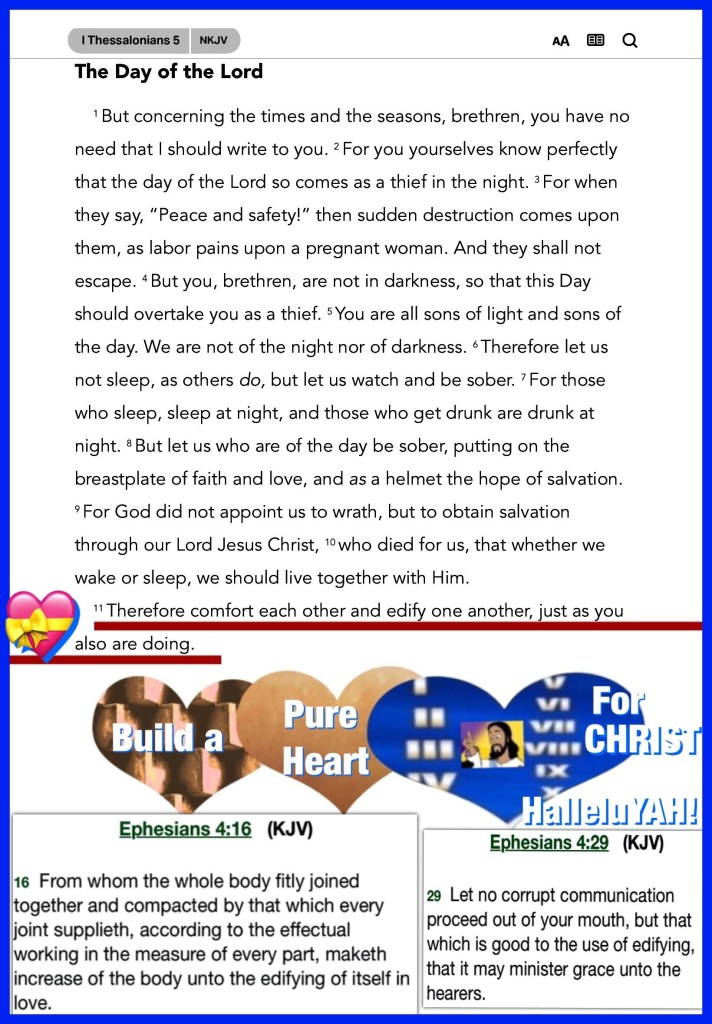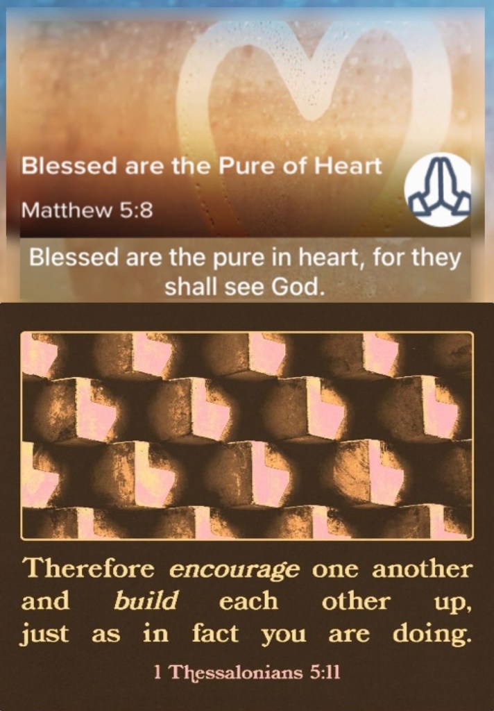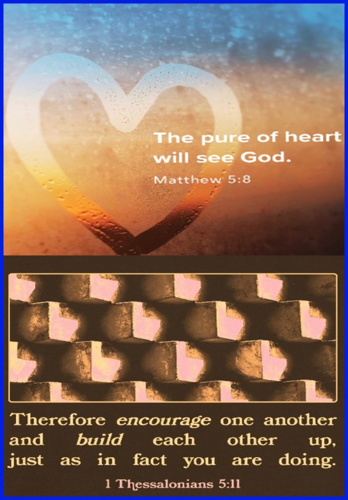 “Blessed are the pure in heart, For they shall see God.” Matthew 5:8 “Therefore comfort each other and edify one another, just as you also are doing.” I Thessalonians 5:11