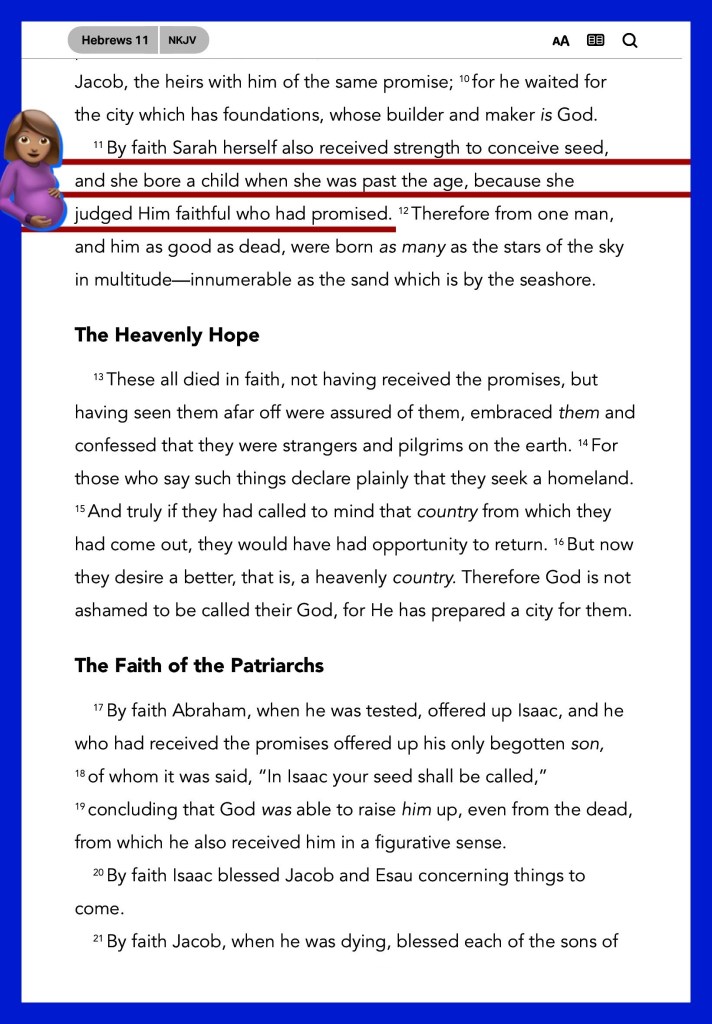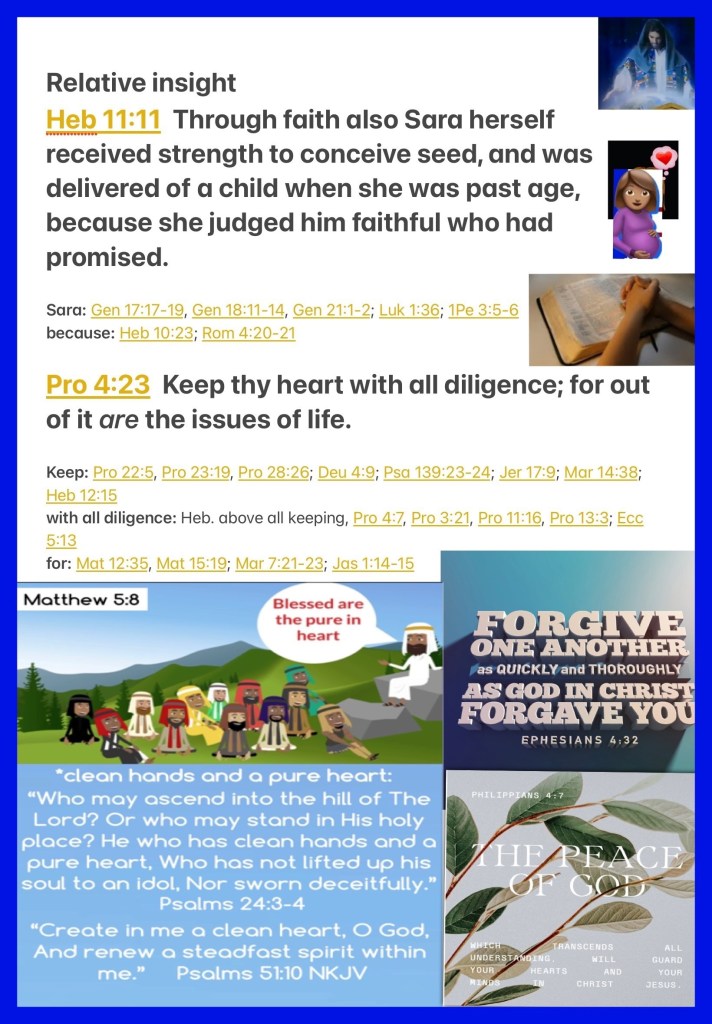 “By faith Sarah herself also received strength to conceive seed, and she bore a child when she was past the age, because she judged Him faithful who had promised.” Hebrews 11:11 “Keep your heart with all diligence, For out of it spring the issues of life.” Proverbs 4:23