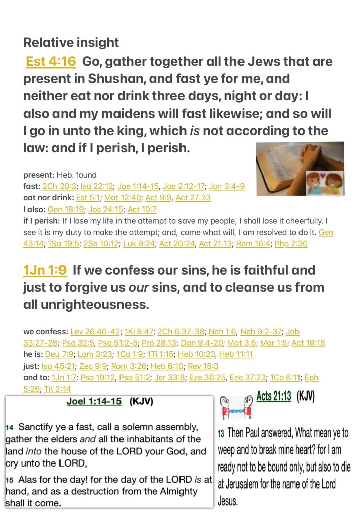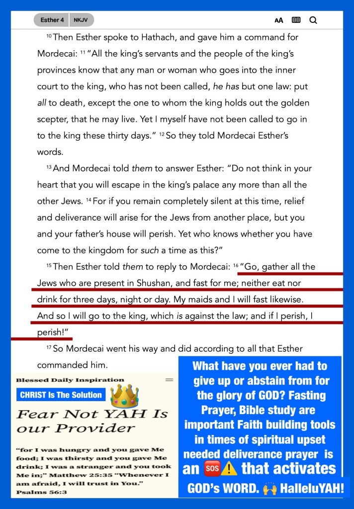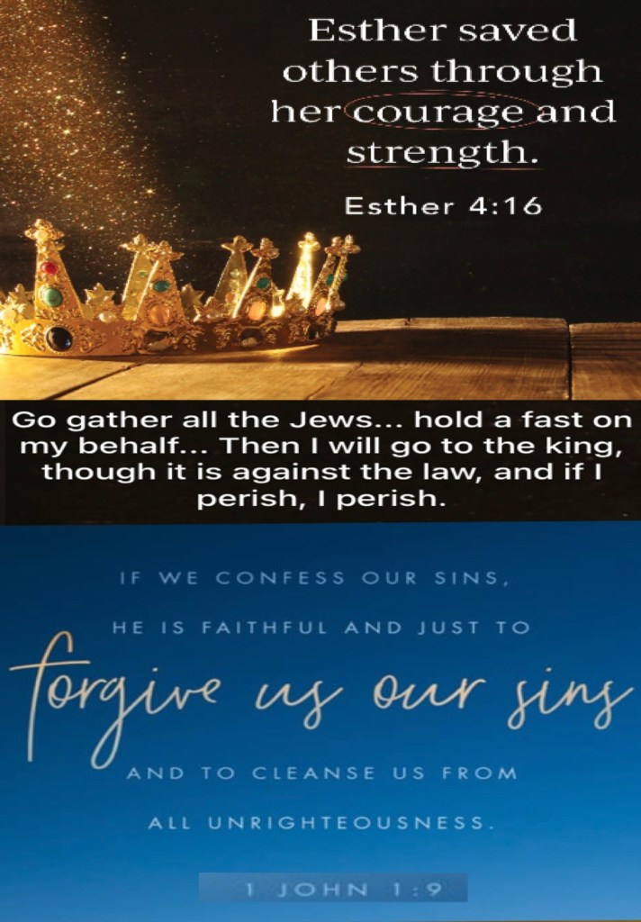 ““Go, gather all the Jews who are present in Shushan, and fast for me; neither eat nor drink for three days, night or day. My maids and I will fast likewise. And so I will go to the king, which is against the law; and if I perish, I perish!”” Esther 4:16 “If we confess our sins, He is faithful and just to forgive us our sins and to cleanse us from all unrighteousness.” I John 1:9