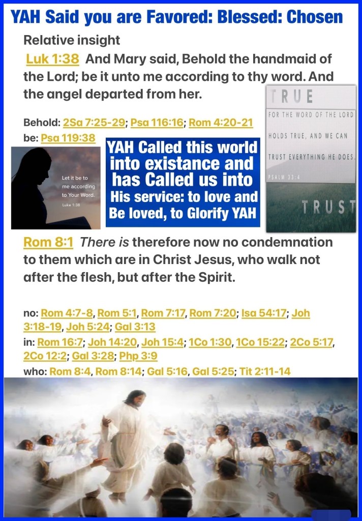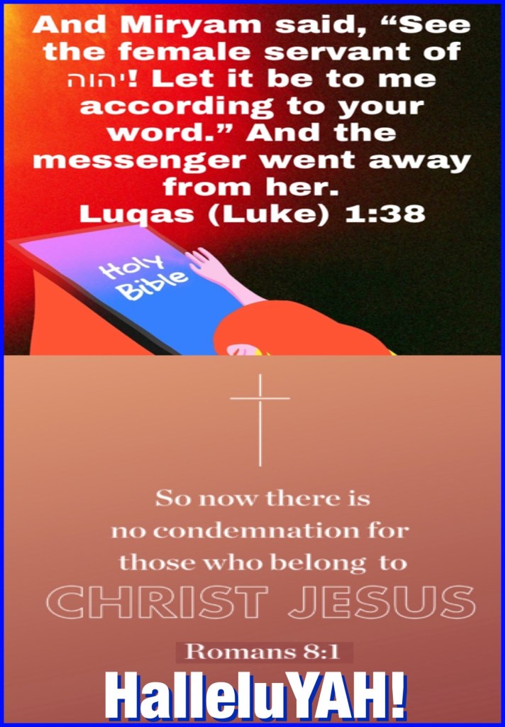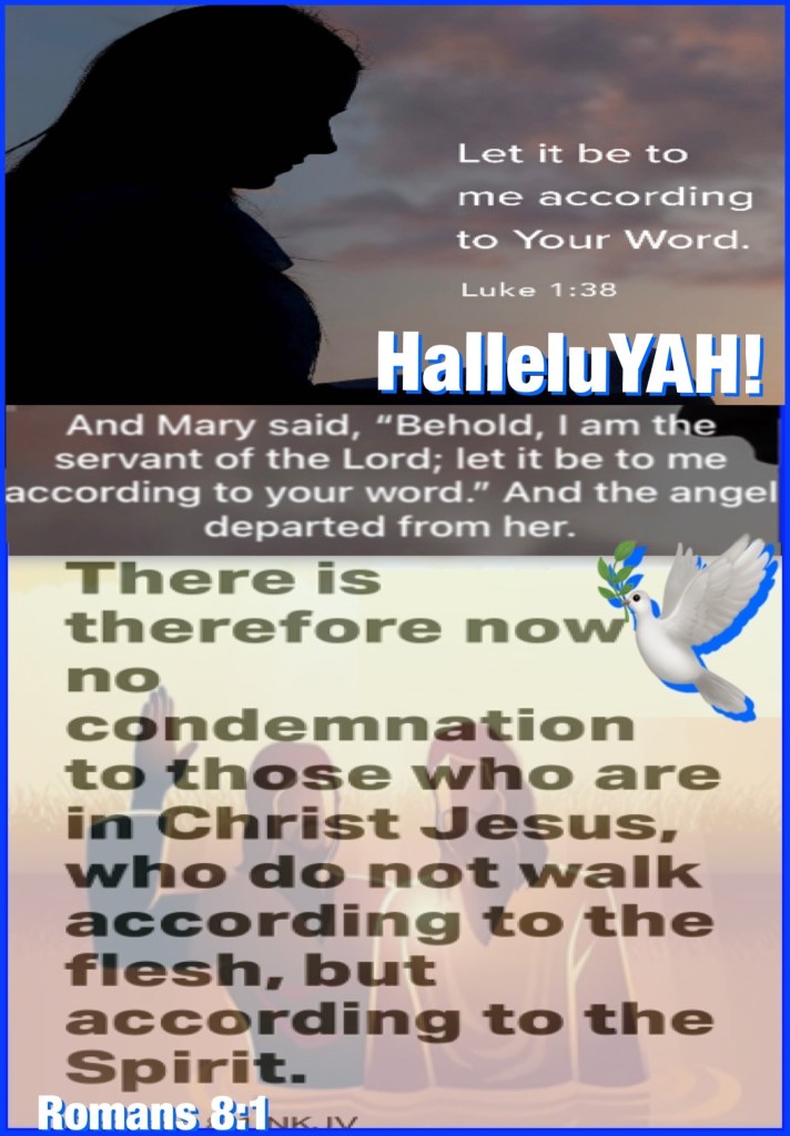 “Then Mary said, “Behold the maidservant of The Lord! Let it be to me according to Your Word.” And The Angel departed from her.” Luke 1:38 “There is therefore now no condemnation to those who are in Christ Jesus, who do not walk according to the flesh, but according to The Spirit.” Romans 8:1