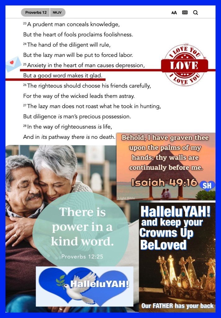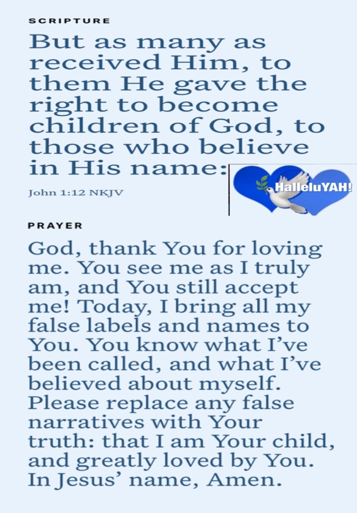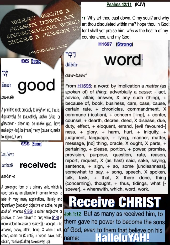 β€œAnxiety in a man’s heart weighs it down, But a good (encouraging) word makes it glad.” Proverbs 12:25 AMP β€œBut to as many as did receive and welcome Him, He gave the right [the authority, the privilege] to become children of God, that is, to those who believe in (adhere to, trust in, and rely on) His name—” John 1:12 AMP so this Preparation Day Ask GOD Into your heart in a big way, surrender everything that weighs on you, I’m praying for your healing, strength, peace, deliverance, life but mostly that you experience the fullness of CHRIST Love, sit in it, believe it GOD Loves you, intensely, intentionally, in all ways, always your safety is priority; Trust Him, Love Him, Praise His Holy Name. Glory HalleluYAH! Thank You Father YAH!