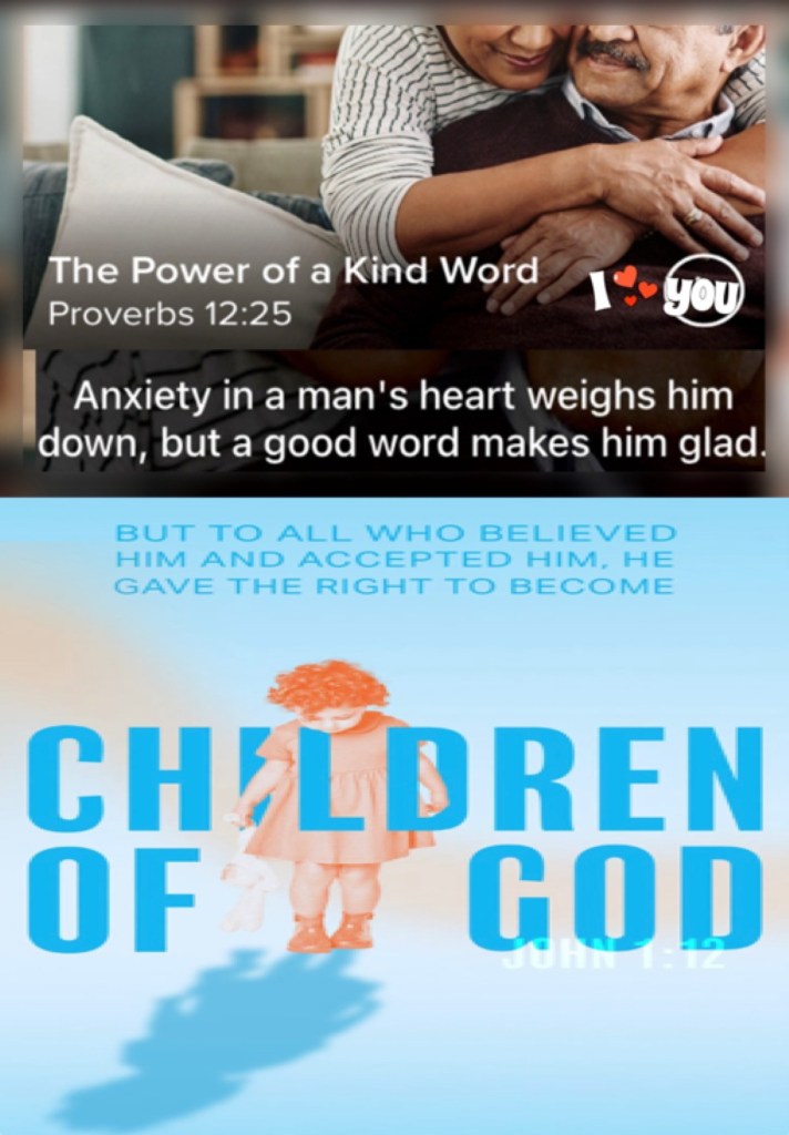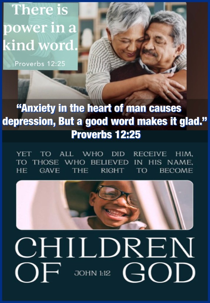 β€œAnxiety in the heart of man causes depression, But a good word makes it glad.” Proverbs 12:25 β€œBut as many as received Him, to them He gave the right to become children of God, to those who believe in His name:” John 1:12 πŸ‘‘ John 20:31 But these are written, that ye might believe that Jesus is the Christ, the Son of God; and that believing ye might have life through his name.