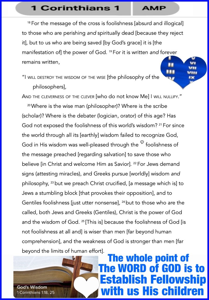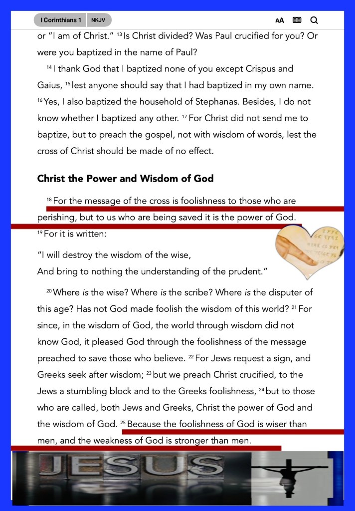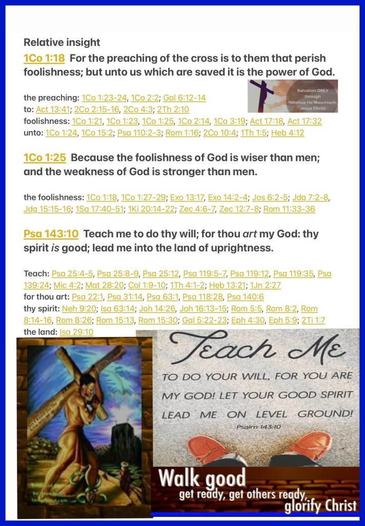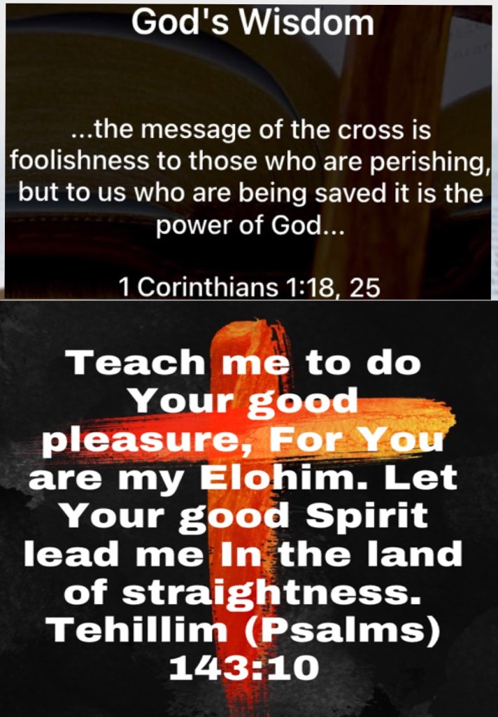βFor the message of the cross is foolishness to those who are perishing, but to us who are being saved it is the power of God. Because the foolishness of God is wiser than men, and the weakness of God is stronger than men.β I Corinthians 1:18, 25 βTeach me to do Your will, For You are my God; Your Spirit is good. Lead me in the land of uprightness.β Psalms 143:10
