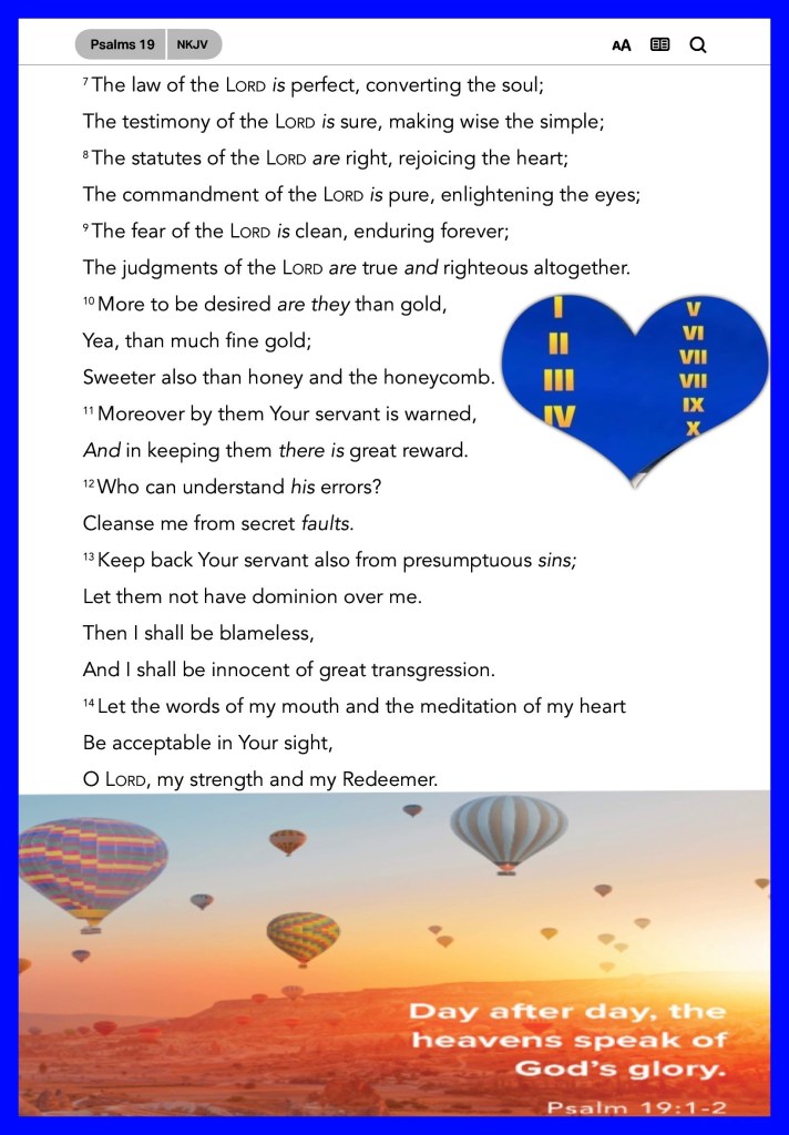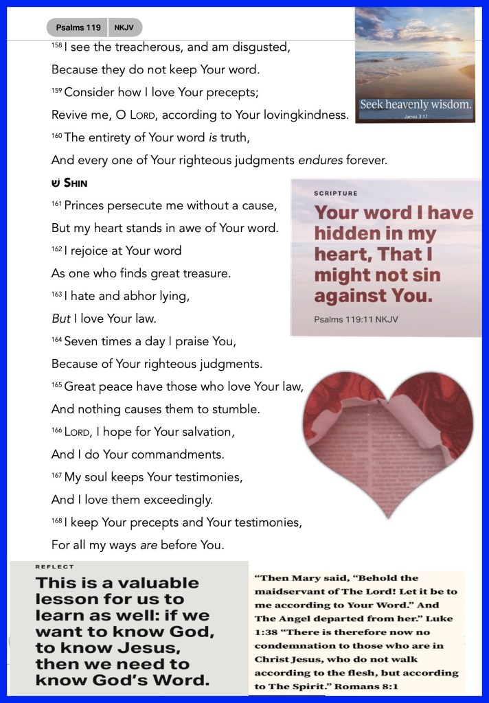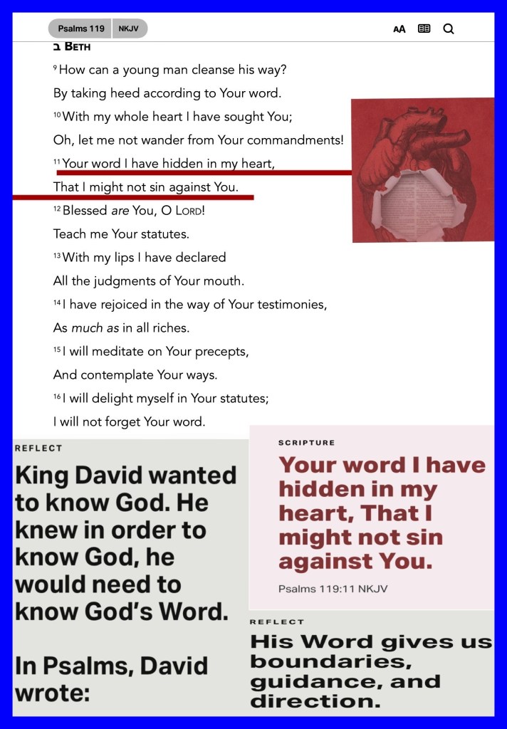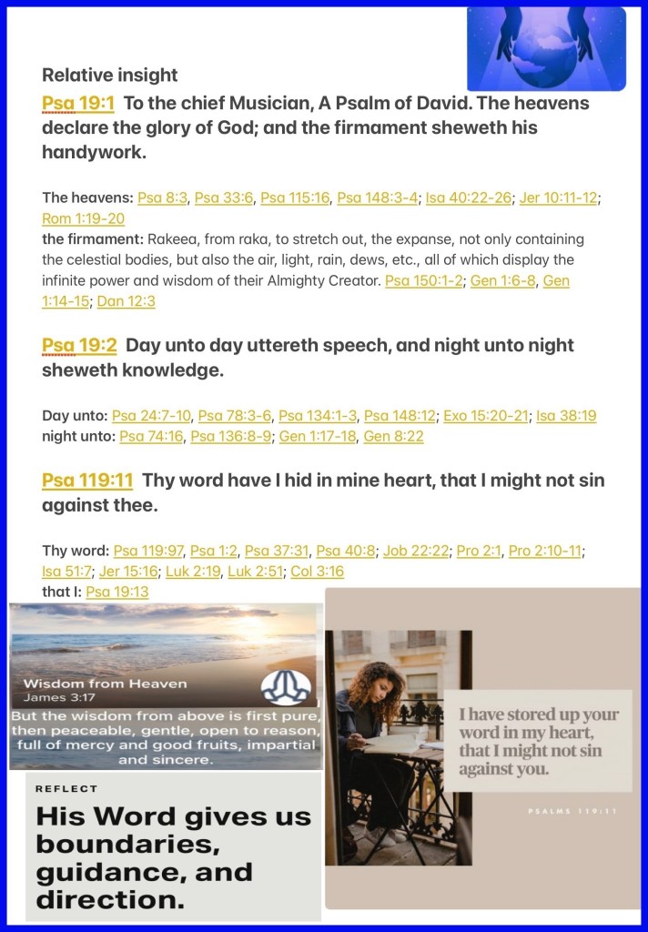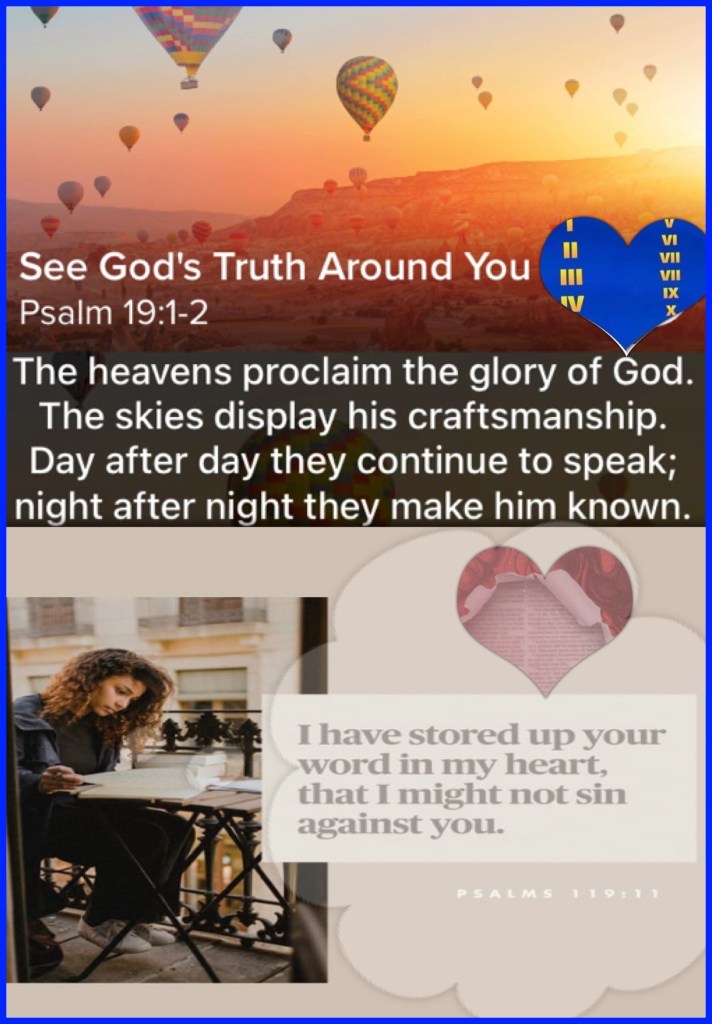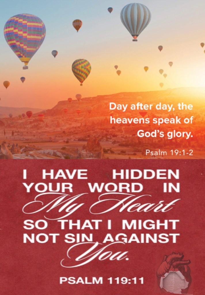 “The heavens declare the glory of God; And the firmament shows His handiwork. Day unto day utters speech, And night unto night reveals knowledge.” Psalms 19:1-2 “Your word I have hidden in my heart, That I might not sin against You.” Psalms 119:11