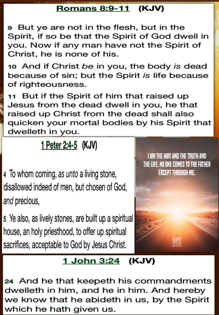 1 Corinthians 3:16 Know ye not that ye are the temple of God, and that the Spirit of God dwelleth in you? 1 John 4:16 And we have known and believed the love that God hath to us. God is love; and he that dwelleth in love dwelleth in God, and God in him. 🙌 Our Help Is Found In CHRIST “In Him [and in fellowship with one another] you also are being built together into a dwelling place of God in the Spirit.” Ephesians 2:22 AMP “And when they had prayed, the place where they were meeting together was shaken [a sign of God’s presence]; and they were all filled with the Holy Spirit and began to speak the word of God with boldness and courage.” Acts 4:31 AMP; 1 Corinthians 6:19 What? know ye not that your body is the temple of the Holy Ghost which is in you, which ye have of God, and ye are not your own?Need help, in a crisis? Call CHRIST! HalleluYAH! “in whom you also are being built together into a dwelling of Elohim in the Spirit.” Eph`siyim (Ephesians) 2:22 TS2009 “And when they had prayed, the place where they came together was shaken. And they were all filled with the Set-apart Spirit, and they spoke the word of Elohim with boldness.” Ma`asei (Acts) 4:31 TS2009; 1 John 4:13 Hereby know we that we dwell in him, and he in us, because he hath given us of his Spirit.Dear Christian I’m praying that we position ourselves in the safety of CHRIST JESUS: Trust: Obey: Believe in Him and allow THE HOLY SPIRIT to Do His perfecting work to make us fit vessels of Honor for the Glory of YAH, YAH Loves you Acts 2:2 And suddenly there came a sound from heaven as of a rushing mighty wind, and it filled all the house where they were sitting. Matthew 21:22 And all things, whatsoever ye shall ask in prayer, believing, ye shall receive. HalleluYAH!