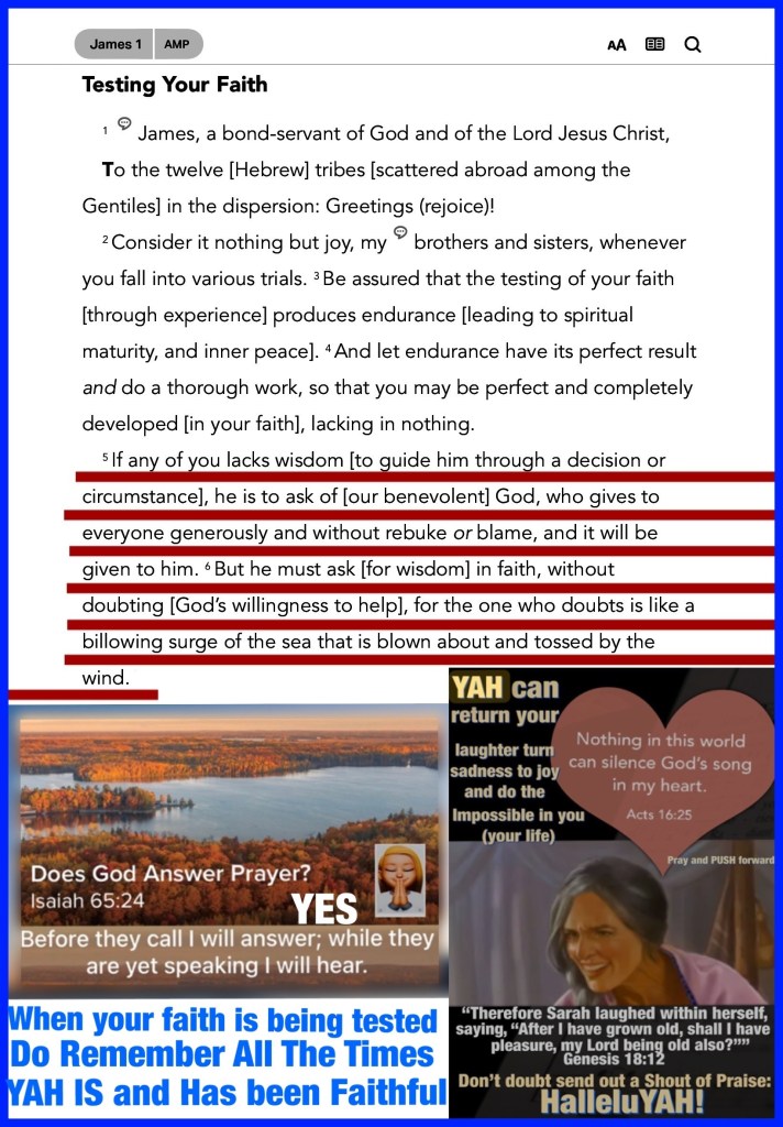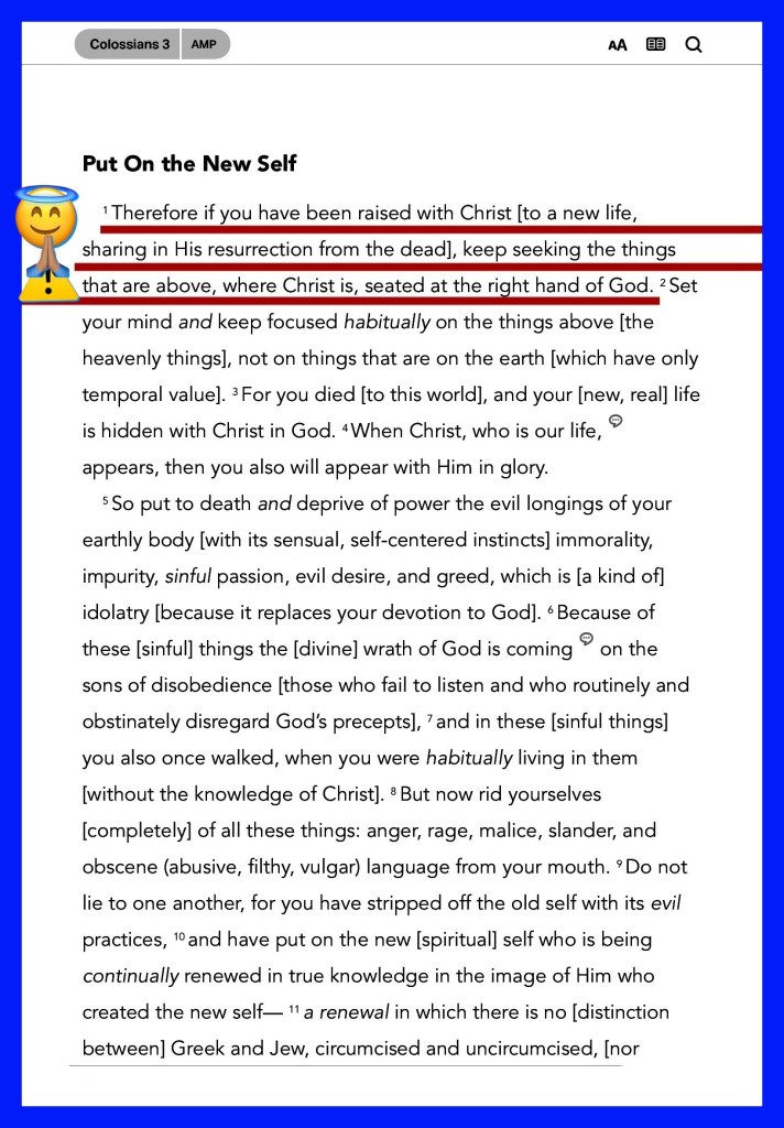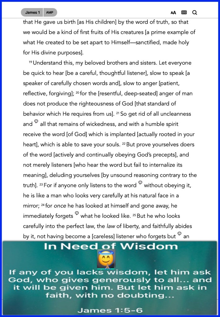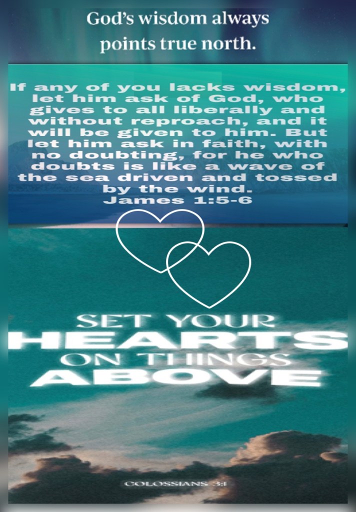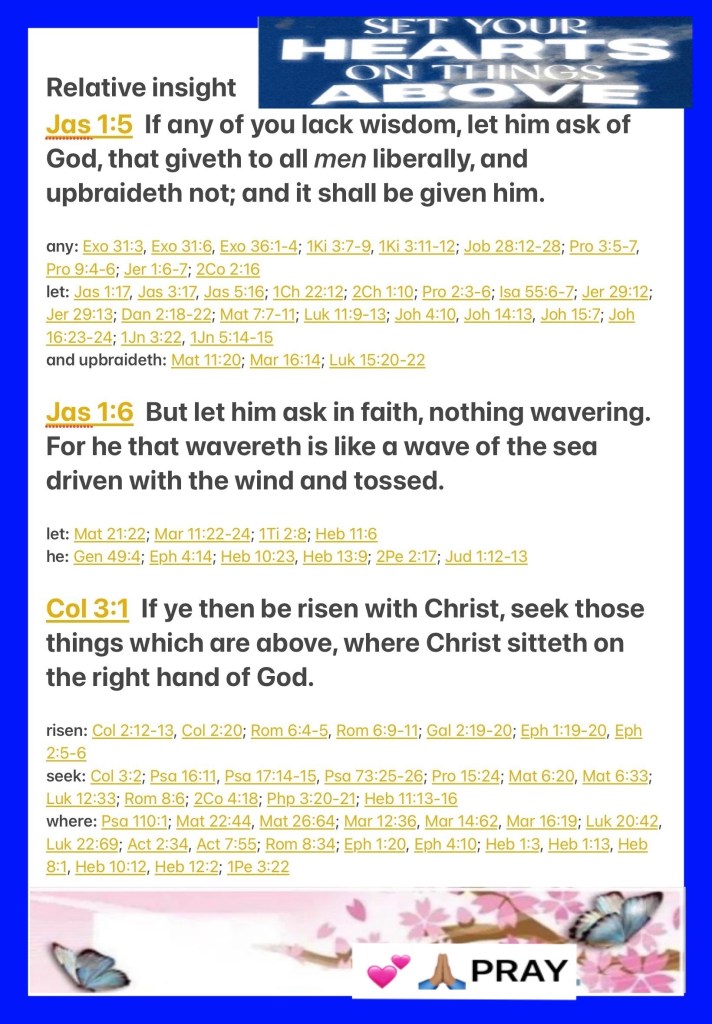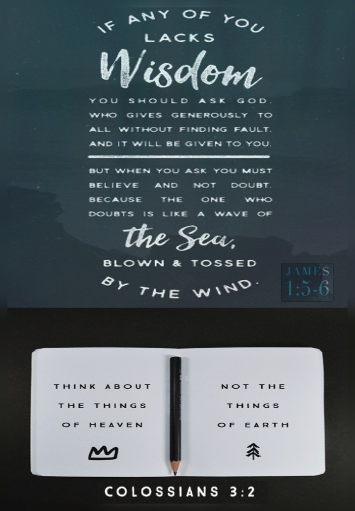 “If any of you lacks wisdom, let him ask of God, who gives to all liberally and without reproach, and it will be given to him. But let him ask in faith, with no doubting, for he who doubts is like a wave of the sea driven and tossed by the wind.” James 1:5-6 “If then you were raised with Christ, seek those things which are above, where Christ is, sitting at the right hand of God.” Colossians 3:1
