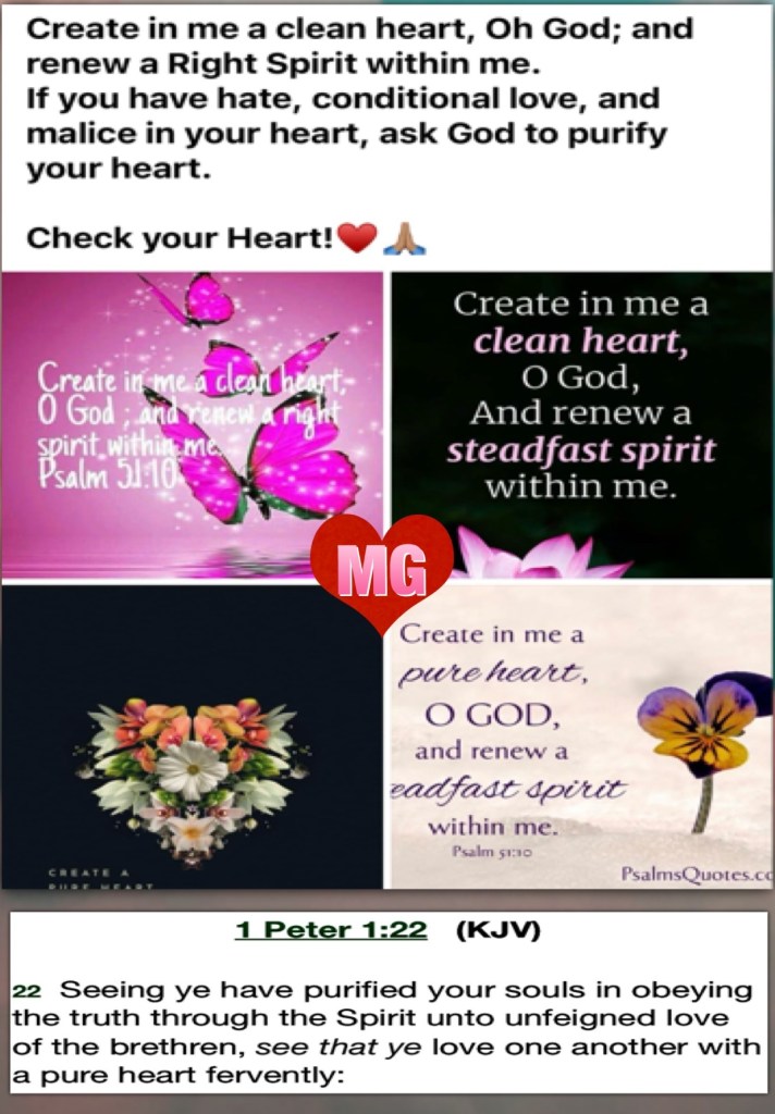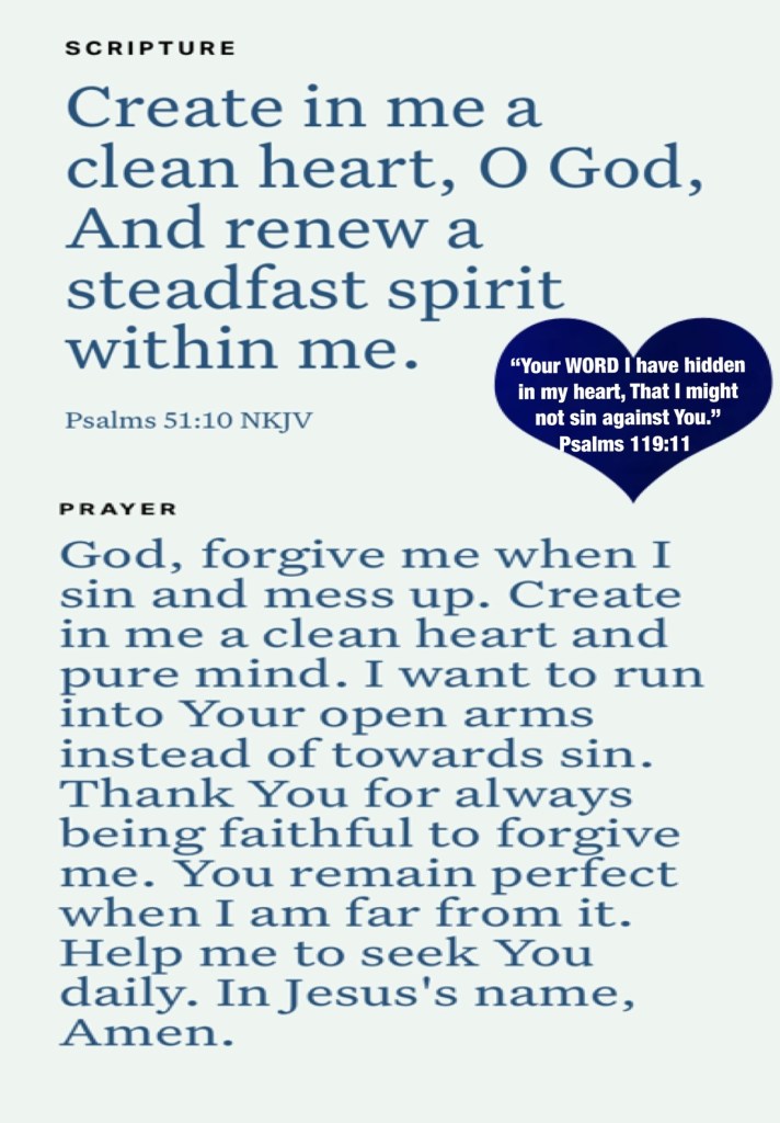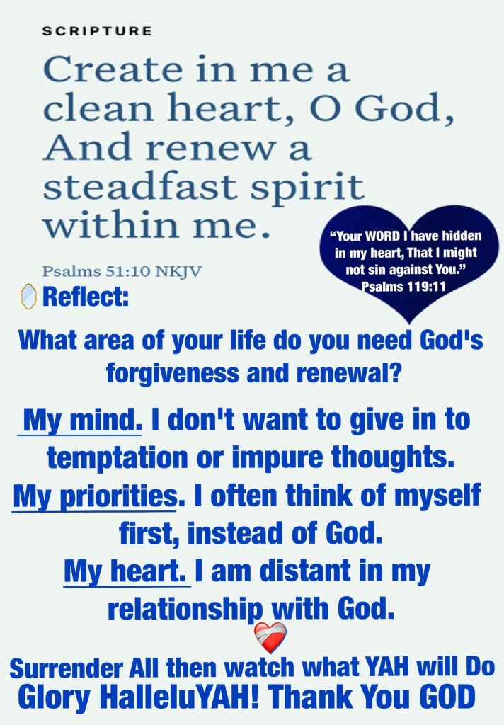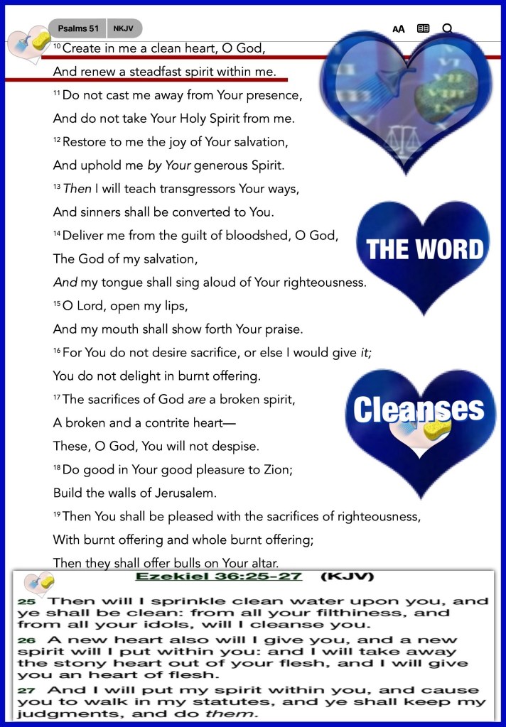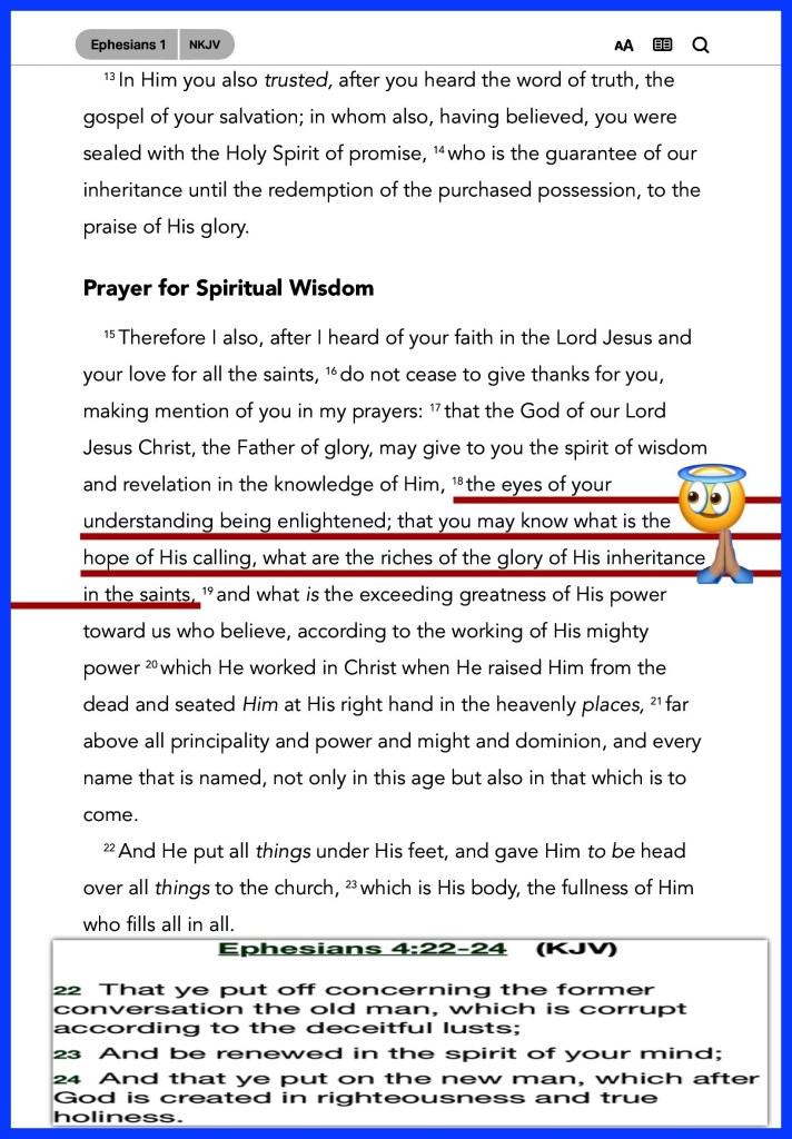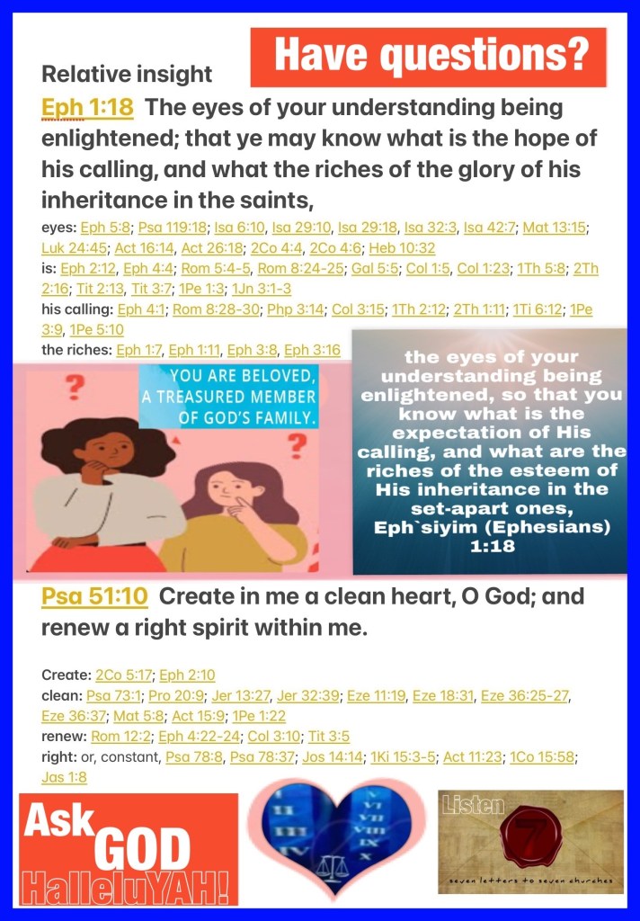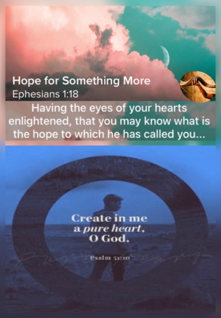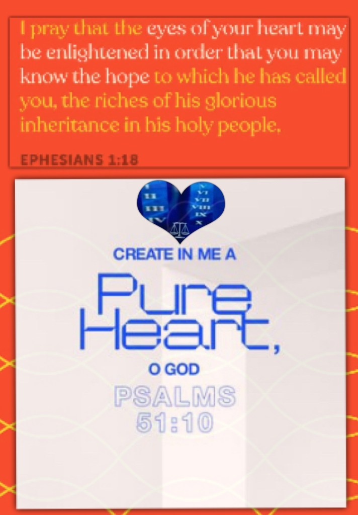“the eyes of your understanding being enlightened; that you may know what is the hope of His calling, what are the riches of the glory of His inheritance in the saints,” Ephesians 1:18 “Create in me a clean heart, O God, And renew a steadfast spirit within me.” Psalms 51:10