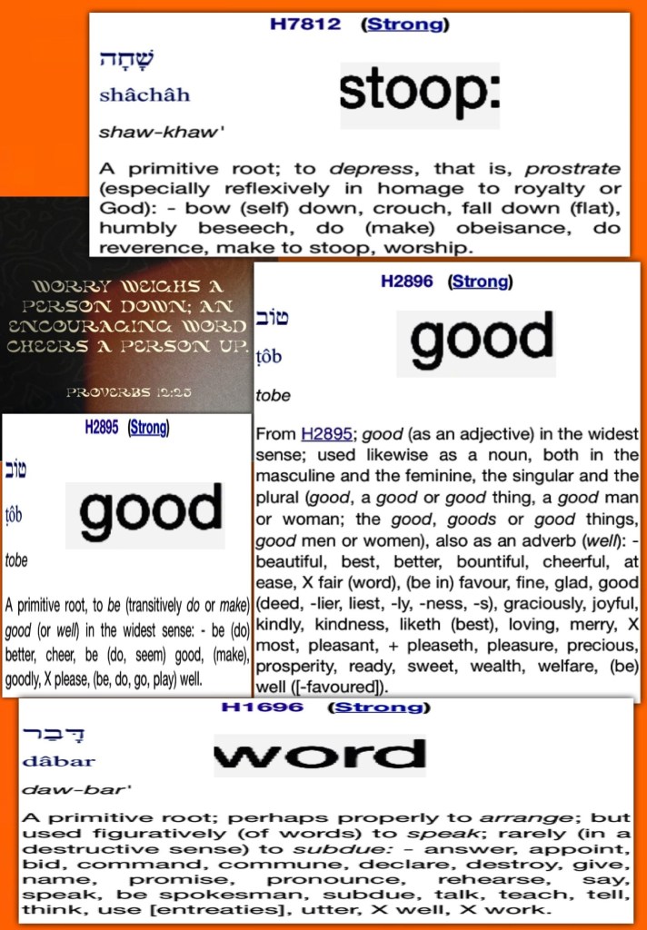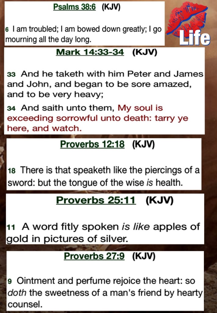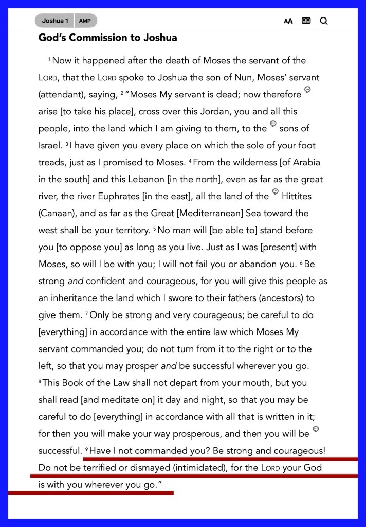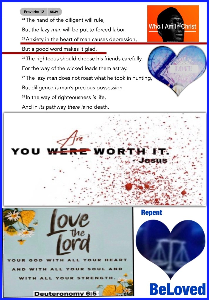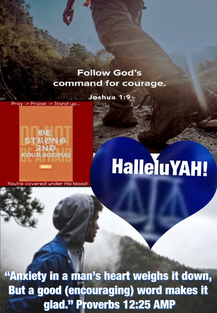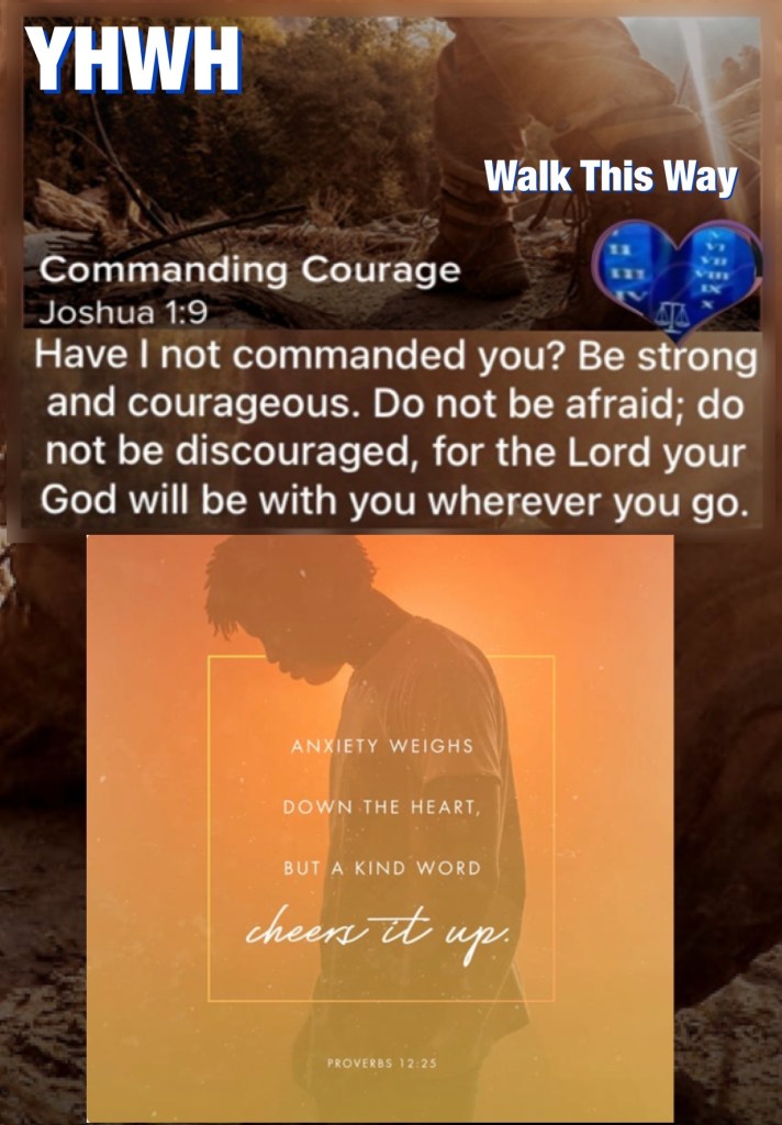 “Have I not commanded you? Be strong and of good courage; do not be afraid, nor be dismayed, for the Lord your God is with you wherever you go.”” Joshua 1:9 “Anxiety in the heart of man causes depression, But a good word makes it glad.” Proverbs 12:25
