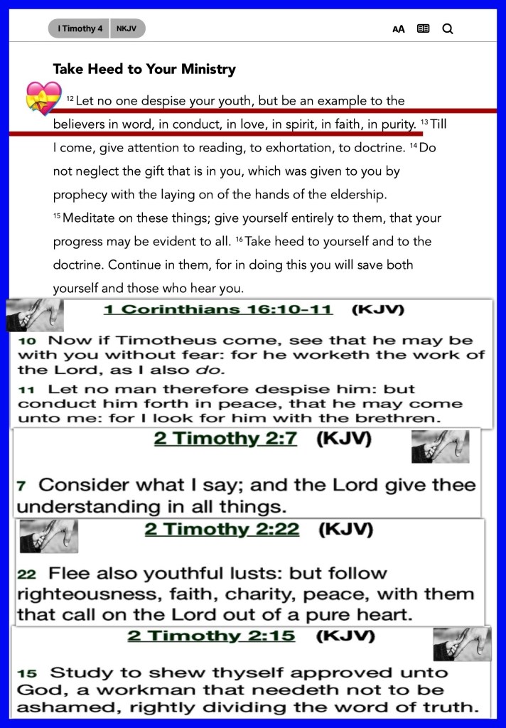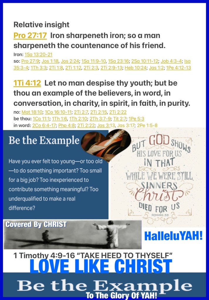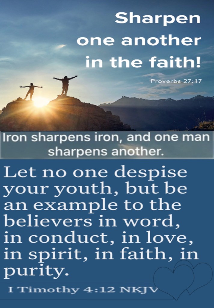 “As iron sharpens iron, So a man sharpens the countenance of his friend.” Proverbs 27:17 “Let no one despise your youth, but be an example to the believers in word, in conduct, in love, in spirit, in faith, in purity.” I Timothy 4:12