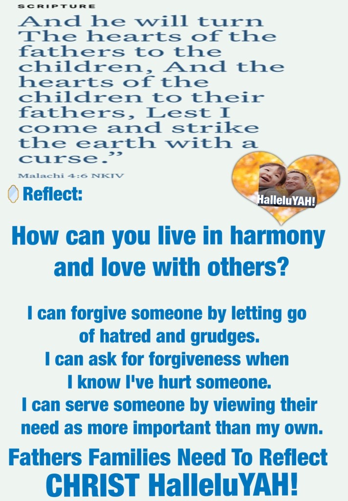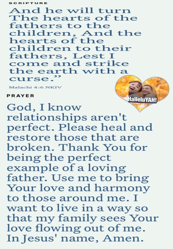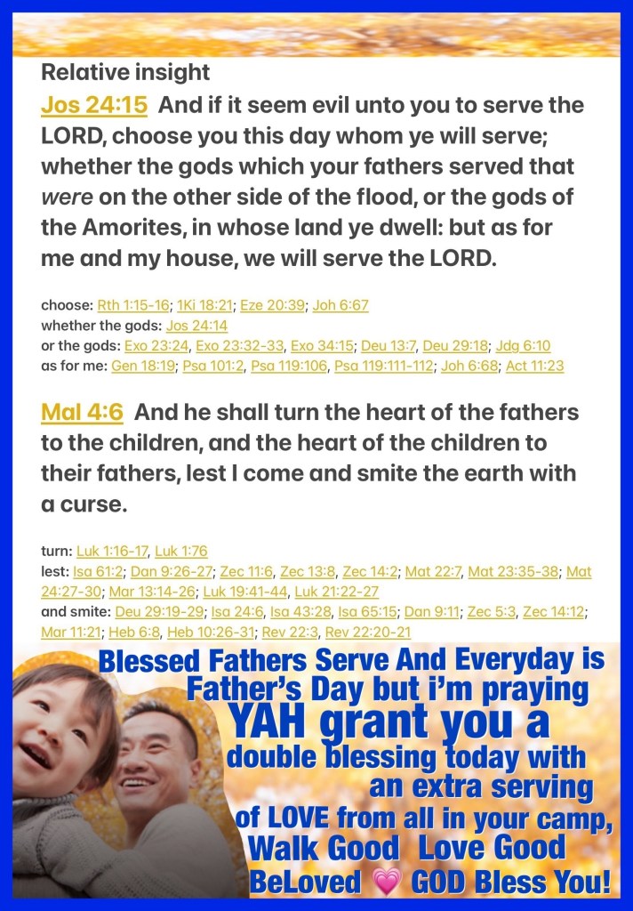 Blessed Fathers Serve YAH first and foremost. Blessed Fathers Serve YAH in a myriad of ways starting with the care and leading their own homes and families: they Keep It Together to The Glory Of YAH, Blessed Fathers Serve as examples of love and excellence in the lives of their youths and communities: They Are A Blessing, They Are Spiritual Leaders: Teachers, They Are The First Extension Of YAH’s Love In All Forms which includes Teaching Forgiveness, Forbearance, Fulfillment, Mercy, Grace, they Glorify YAH, again Fathers, Real Fathers Model CHRIST Agapè Love especially in their home. The Blessing of Fatherhood Is A Gift From our Heavenly FATHER that reaches far and wide our children are the fruit which testifies to how well we’re learning under the Teaching Hand and Guidance Of THE HOLY SPIRIT to Reflect The Image Of YAH. To You wonderful Fathers, my brothers I send Greetings of Love and Pray that YAH continues to Inspire, Bless, Keep, Seal, Protect, Fill, and Nurture You In every Way You Need most. You are His Beloved and Cherished Son Walk In YAH’s Love 💗 today and Forever: Walk Good BeLoved.